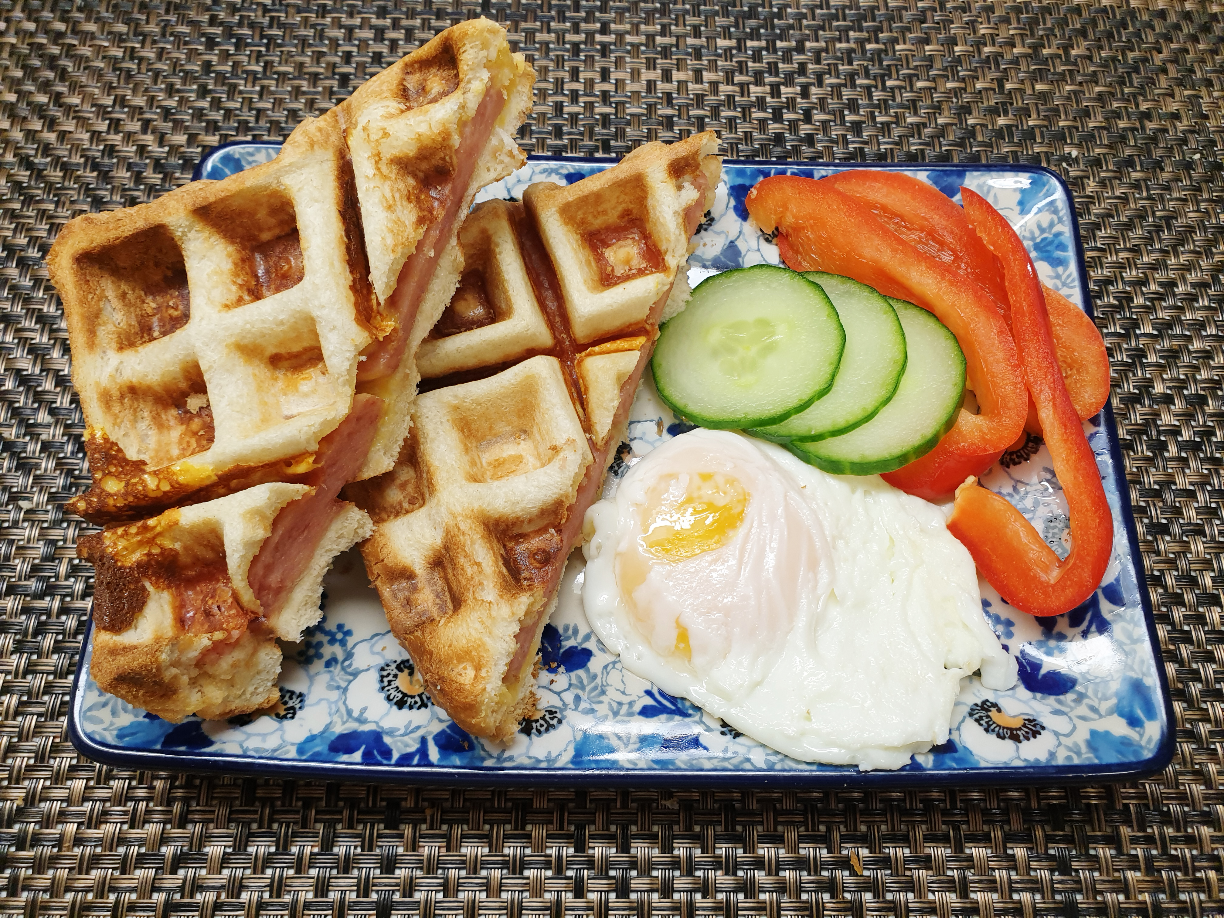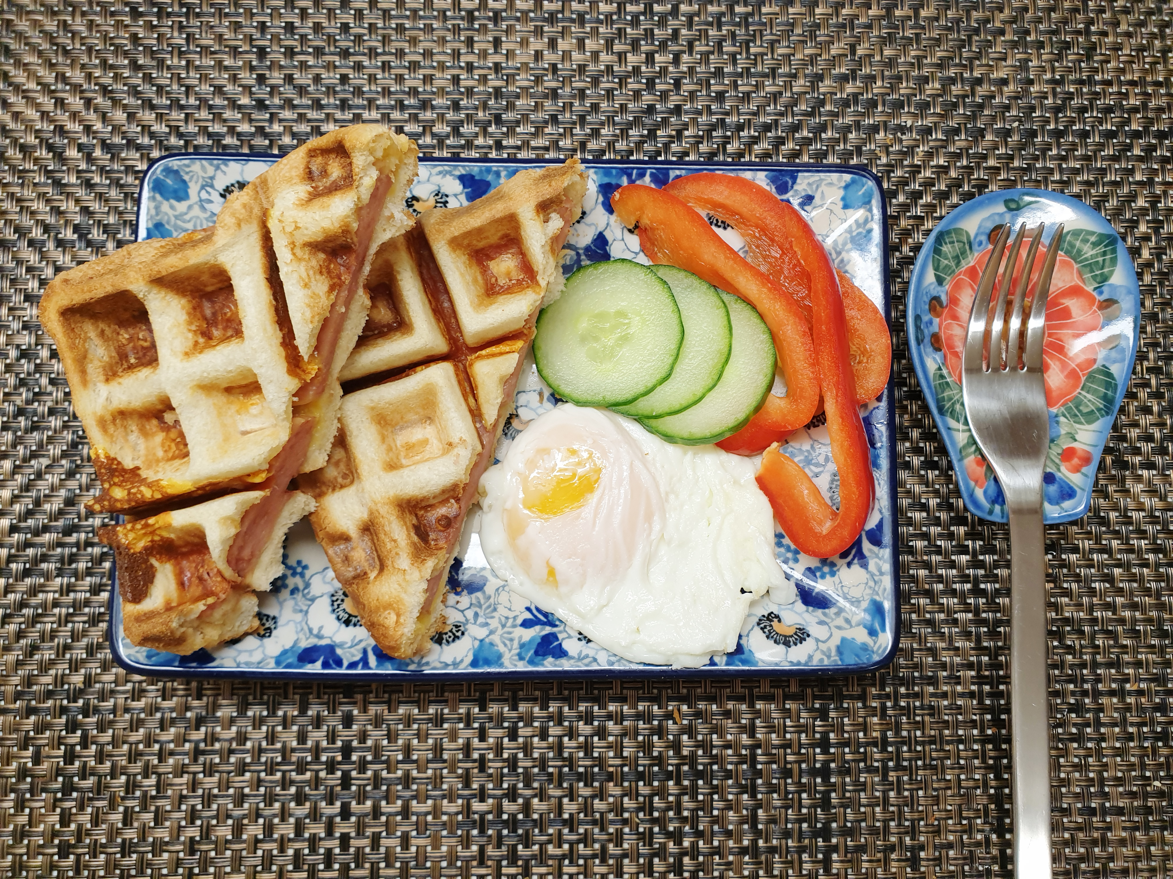 전 이렇게 식빵 와플 토스트와 신선한 채소를 같이 먹는 걸 좋아해요~ 사진을 찍기 위해서 파프리카를 조금 덜어 놨지만 실제로는 파프리카를 거의 한 개를 먹어요 >. <