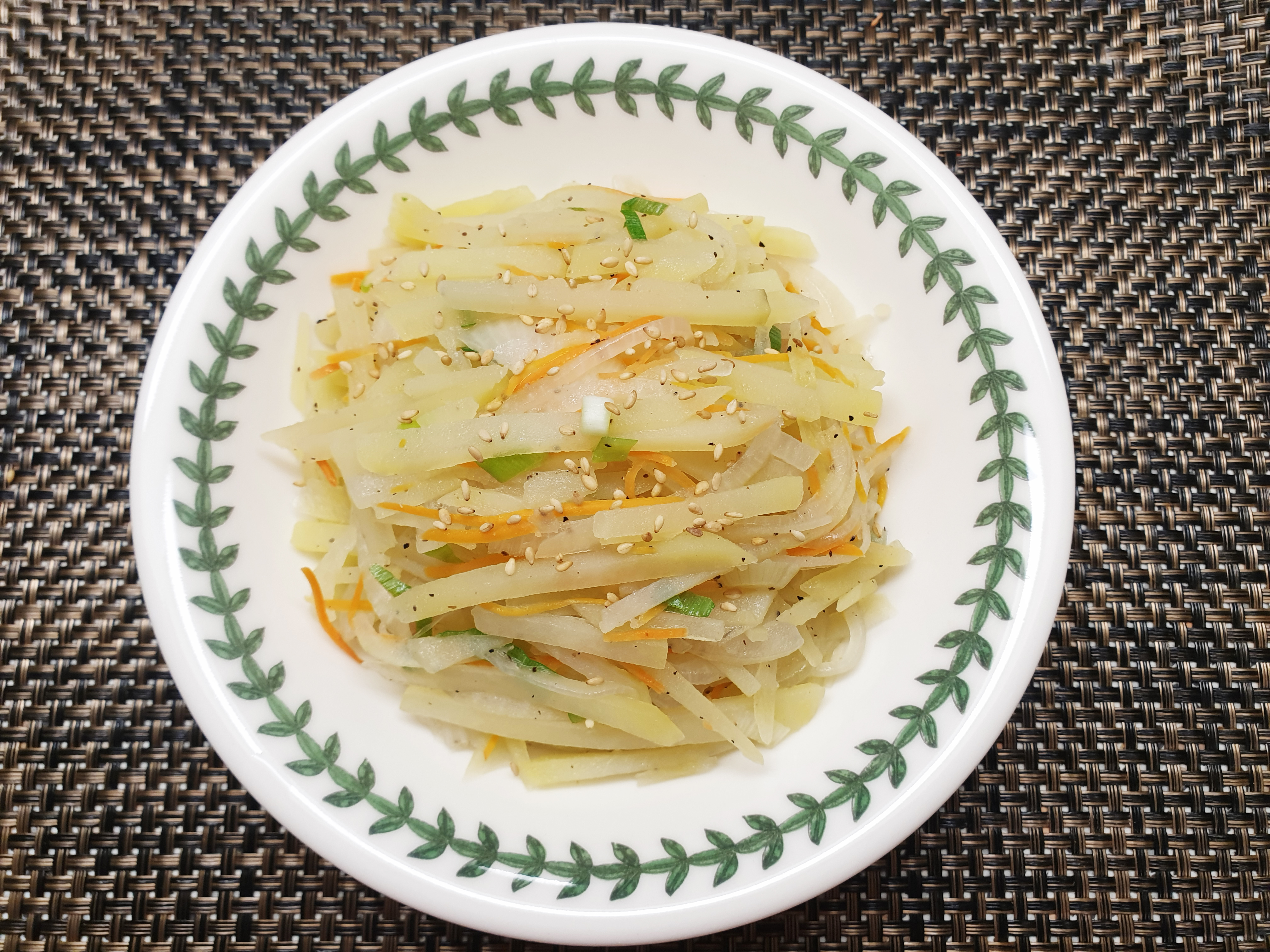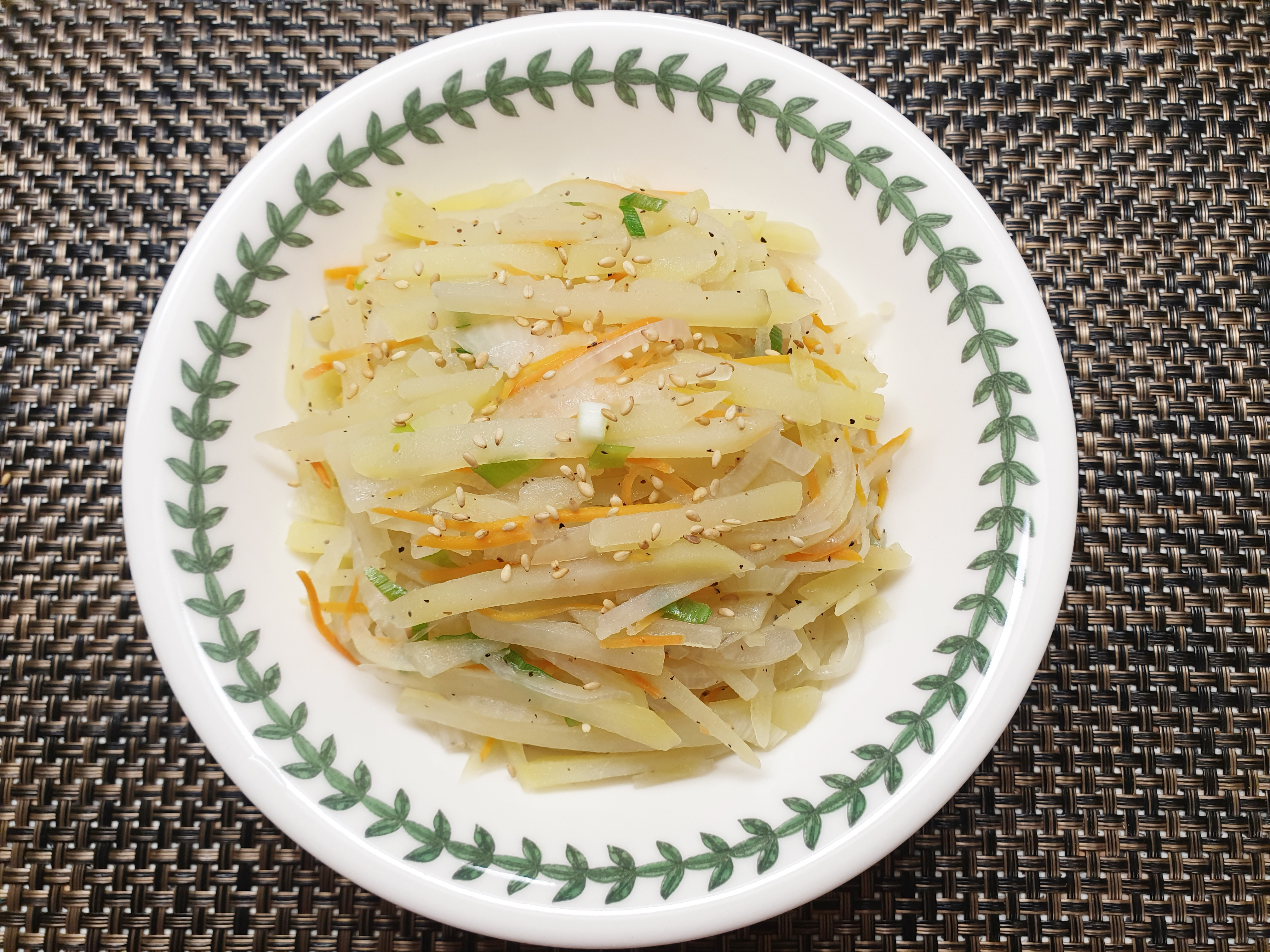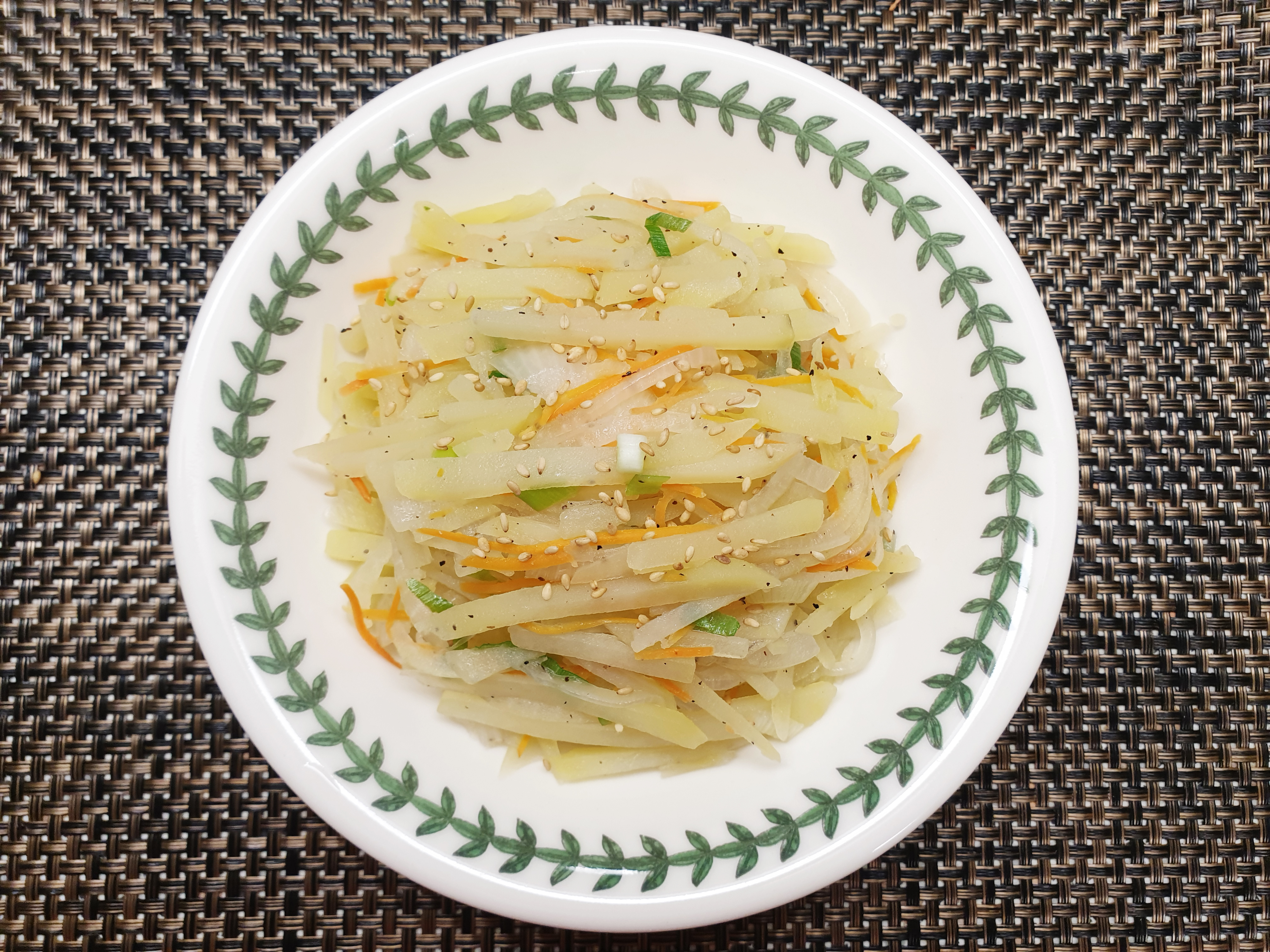 8. 감자가 완전히 익었다면 감자채 볶음 완성! 전 색감을 위해 마지막에 파도 송송 썰어 넣어 줬어요~