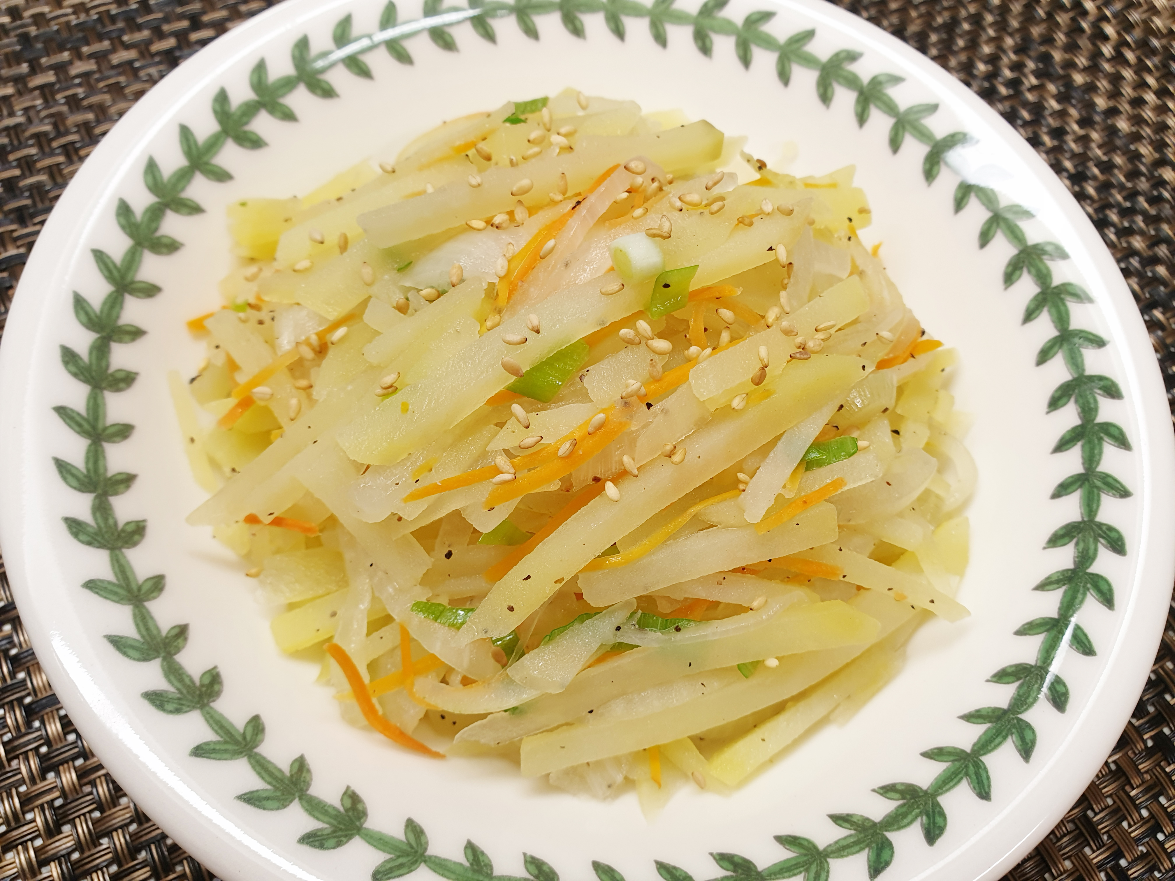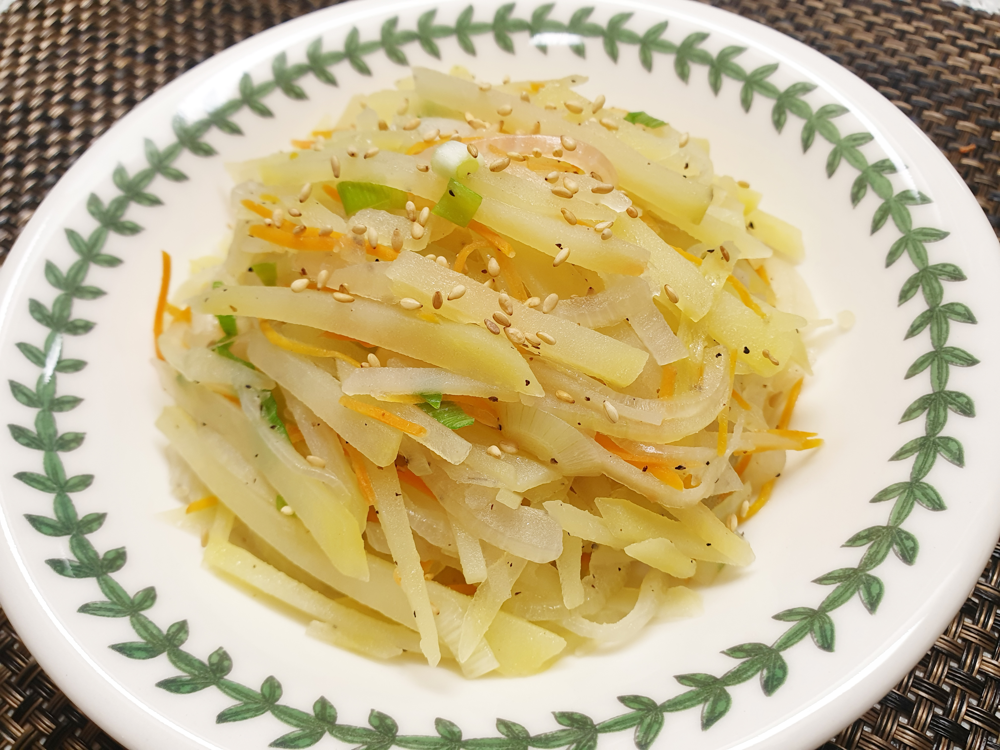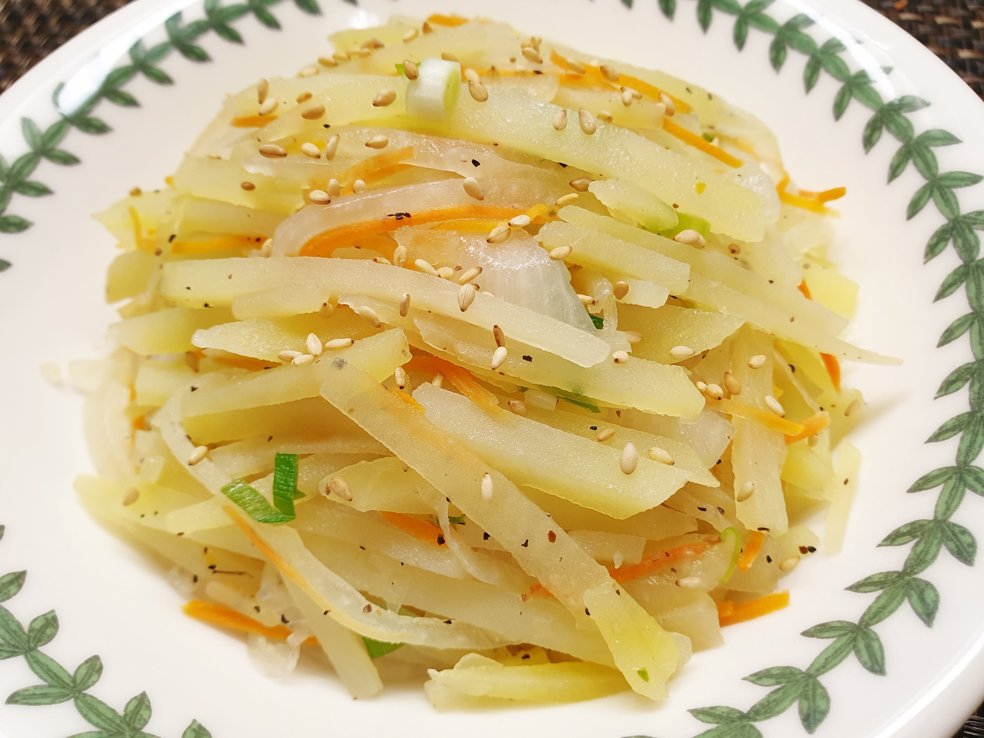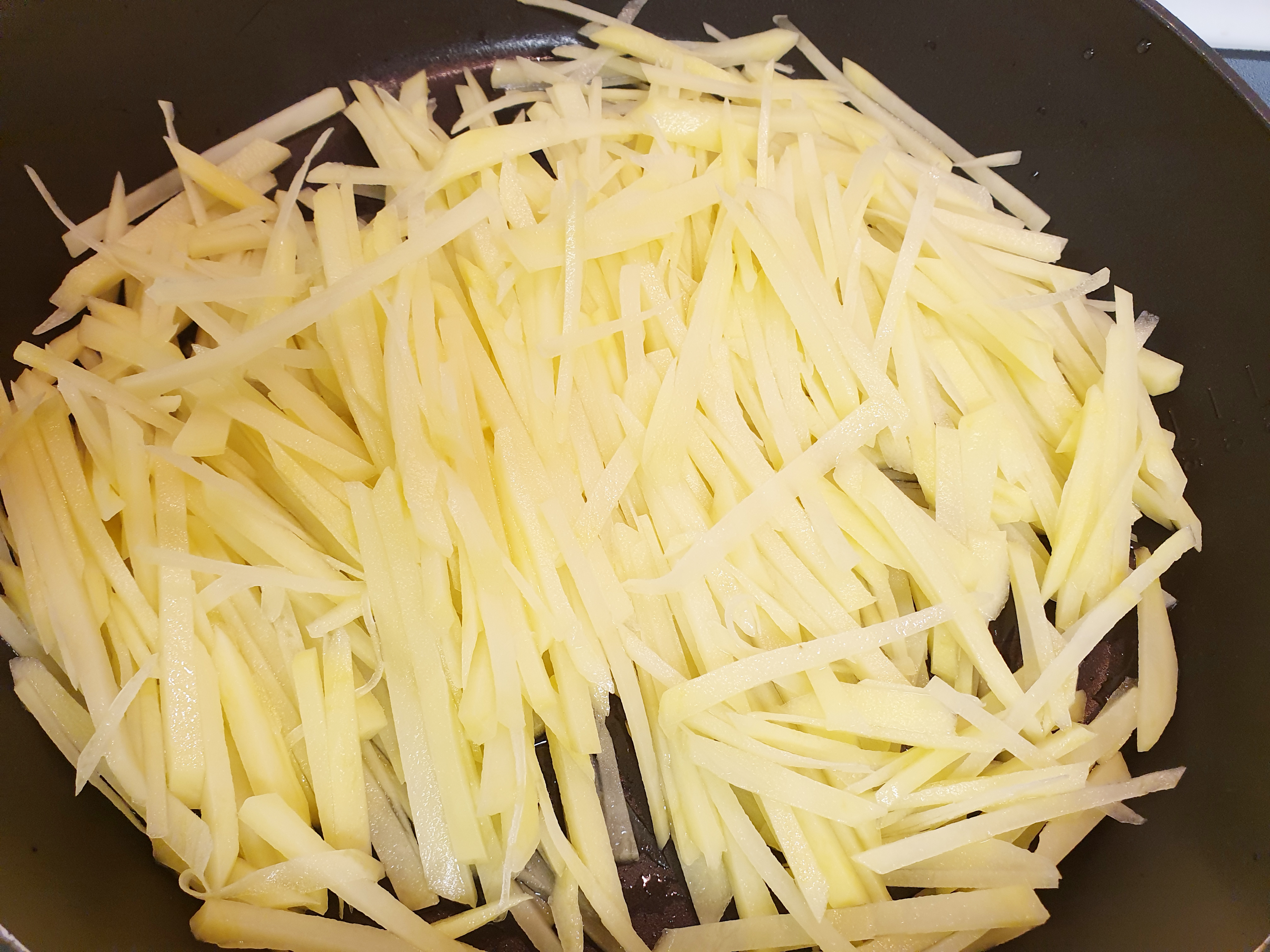 8. 감자가 완전히 익었다면 감자채 볶음 완성! 전 색감을 위해 마지막에 파도 송송 썰어 넣어 줬어요~