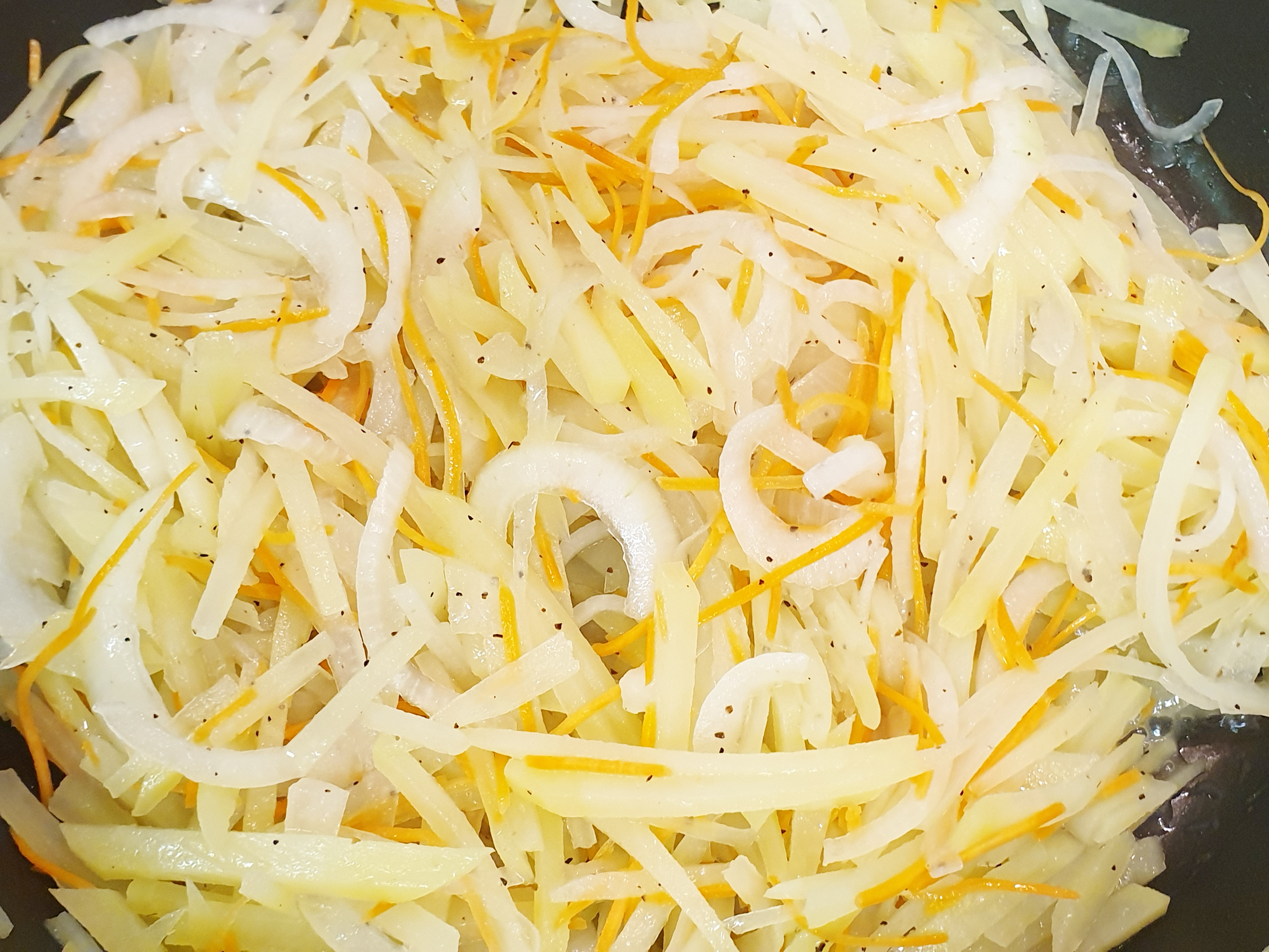 7.7~10분 정도 볶다 보면 감자가 투명해지는 것이 보이면서 서서히 익기 시작할 거예요~ 반 정도 익었을 때 양파와 당근을 넣고 물이 보이지 않을 때까지 5분 더 볶아줍니다. (저는 양파의 아삭한 식감이 남아 있는 게 좋아서 처음부터 양파를 넣지 않고 중간에 넣어 볶아 줬어요! 양파를 완전히 익히고 싶다면 감자를 넣을 때 양파도 같이 넣어 주시면 됩니다. )