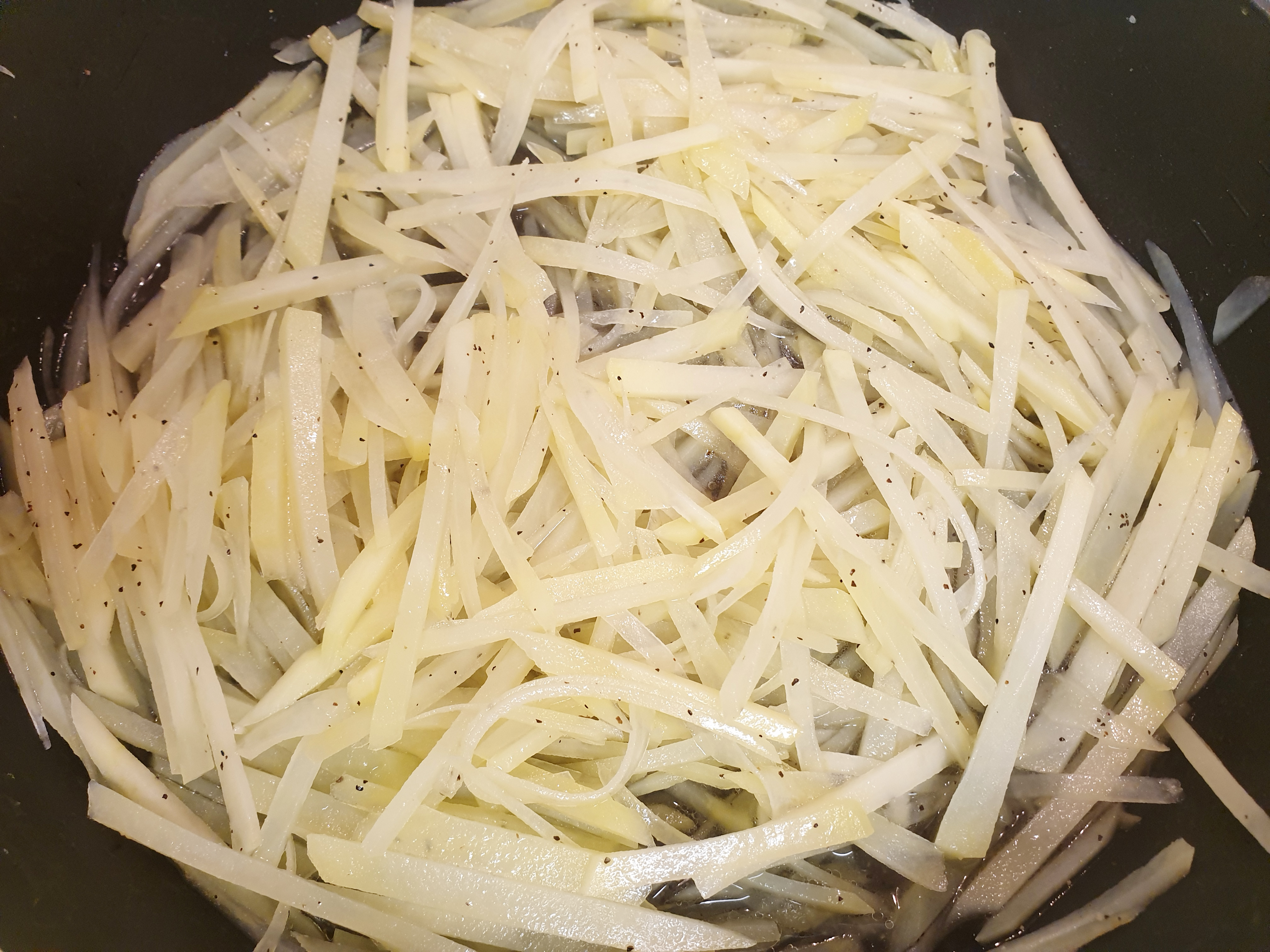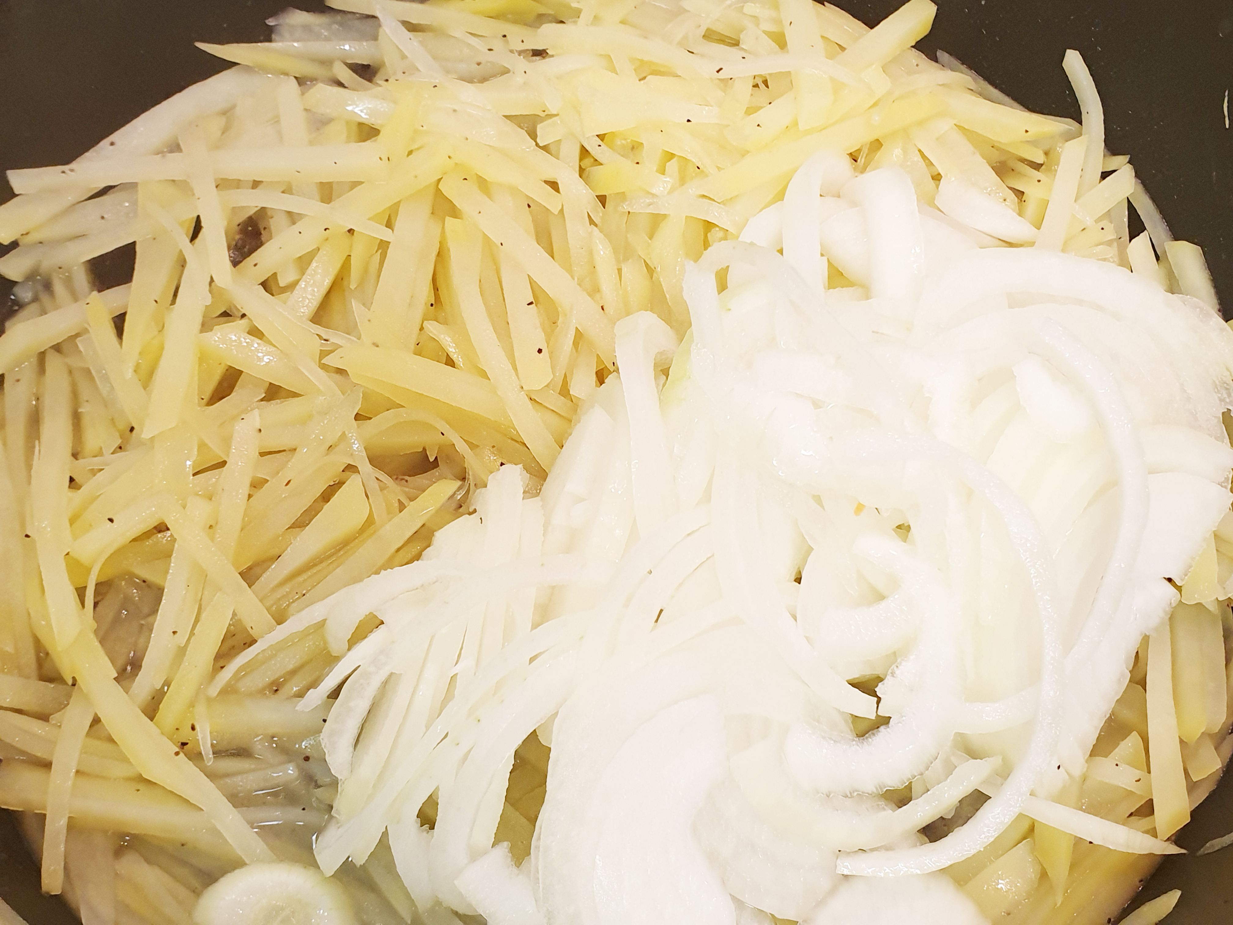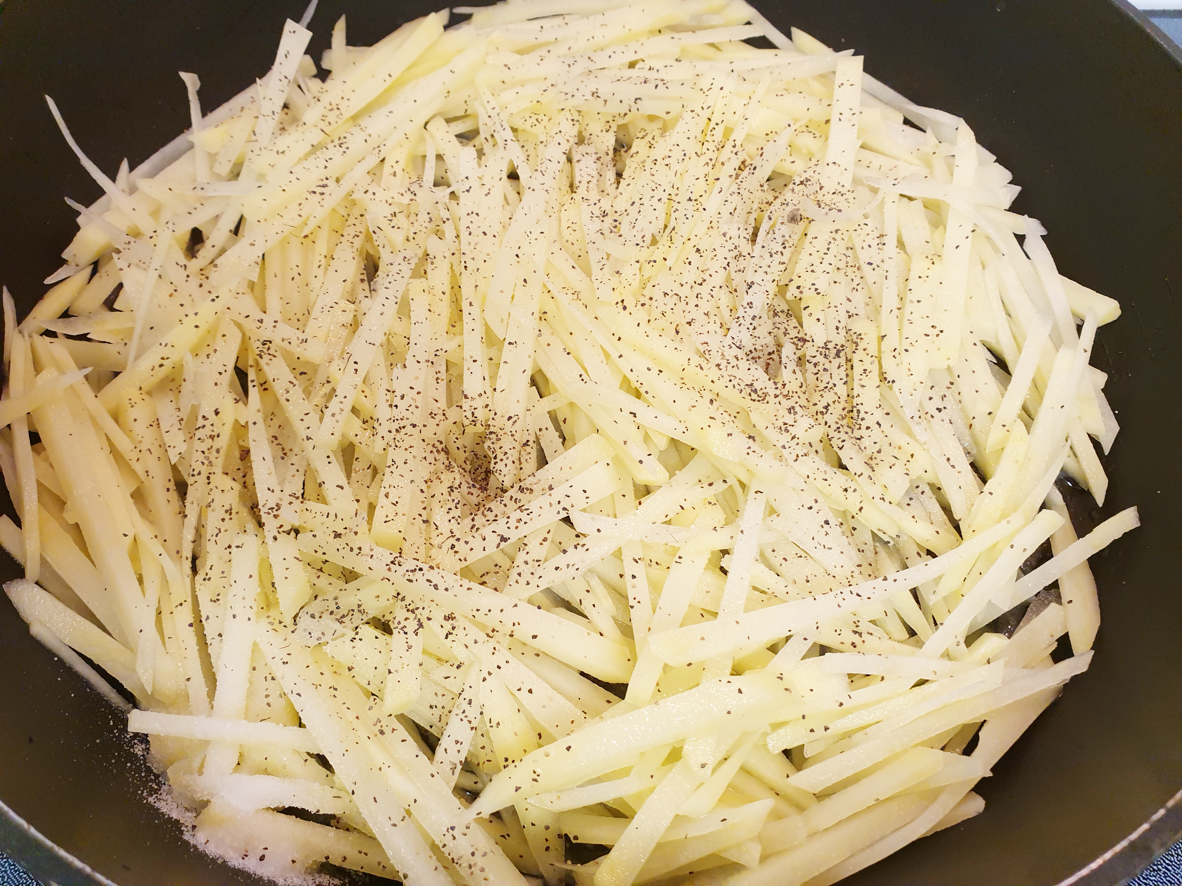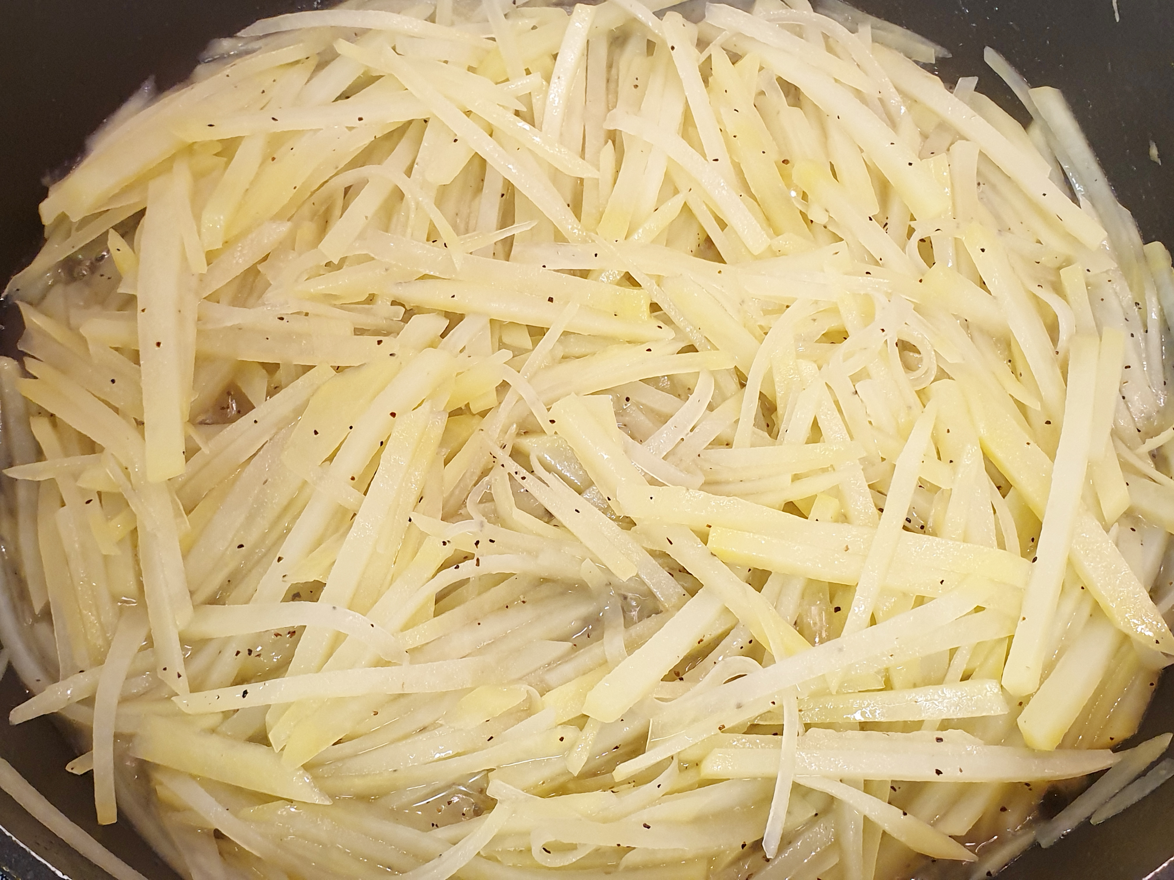5. 감자를 삶지 않고 실패 없이 쉽게 만들 수 있는 방법은 중불에 두고 프라이팬에 식용유를 두른 후 기름이 달궈지면 채를 썬 감자를 넣고 물 1/2컵(종이컵 사용)을 부어 줍니다!