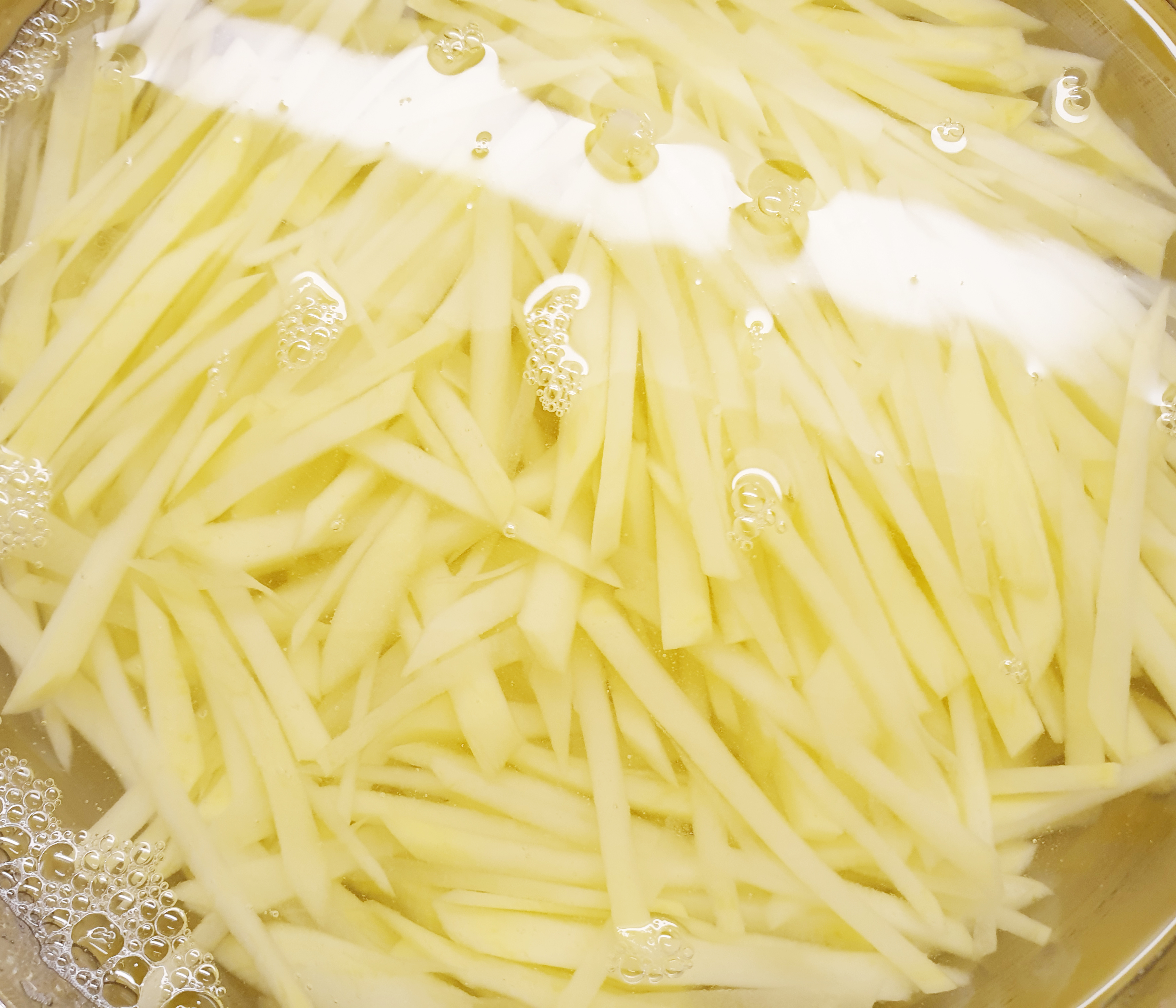4. 채를 썬 감자를 물에 4~5번 헹궈주거나 물에 10분 정도 담가놔서 전분을 빼줍니다. 전분을 빼지 않고 그대로 볶을 경우 서로 들러붙는 다던지 볶을 때 쉽게 부서져요~