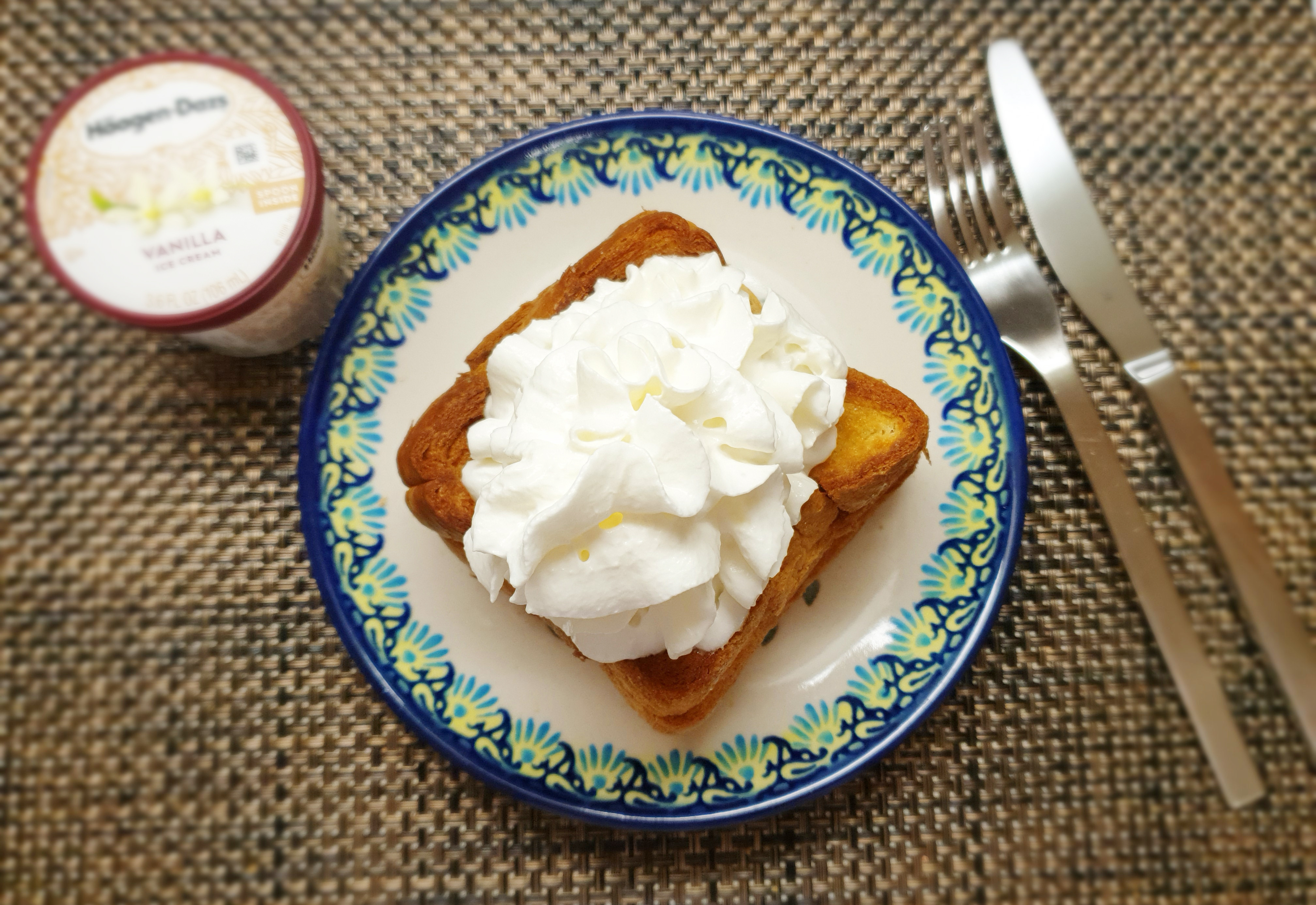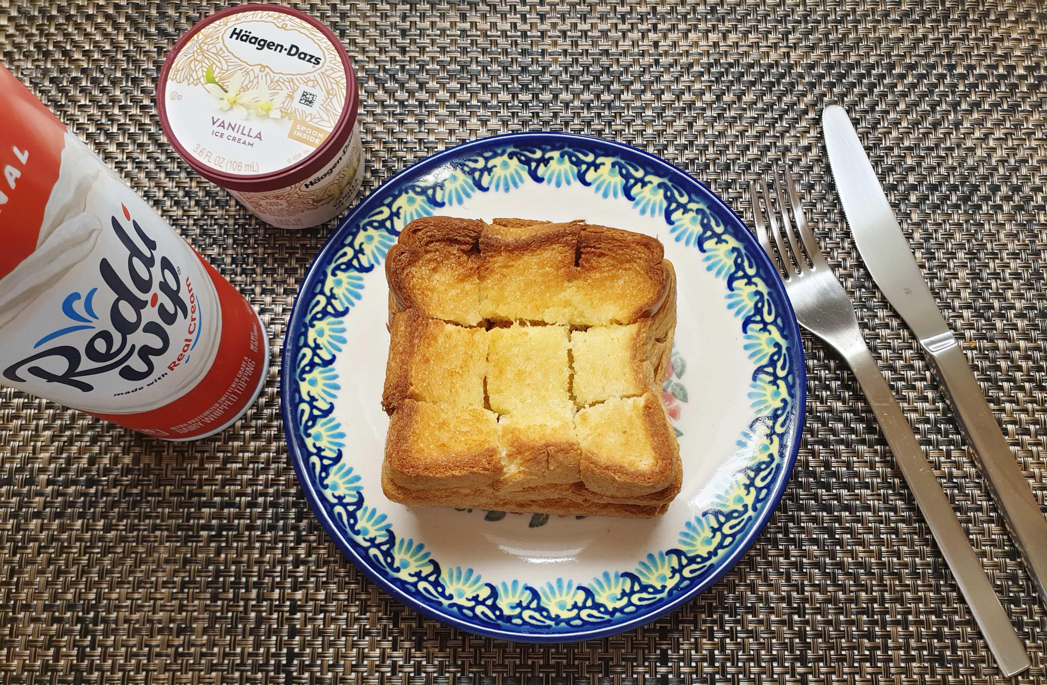제법 맛있게 구워진 빵~ 빵과 같이 먹을 하겐다즈 바닐라맛 아이스크림과 스프레이 휘핑크림을 준비했어요~