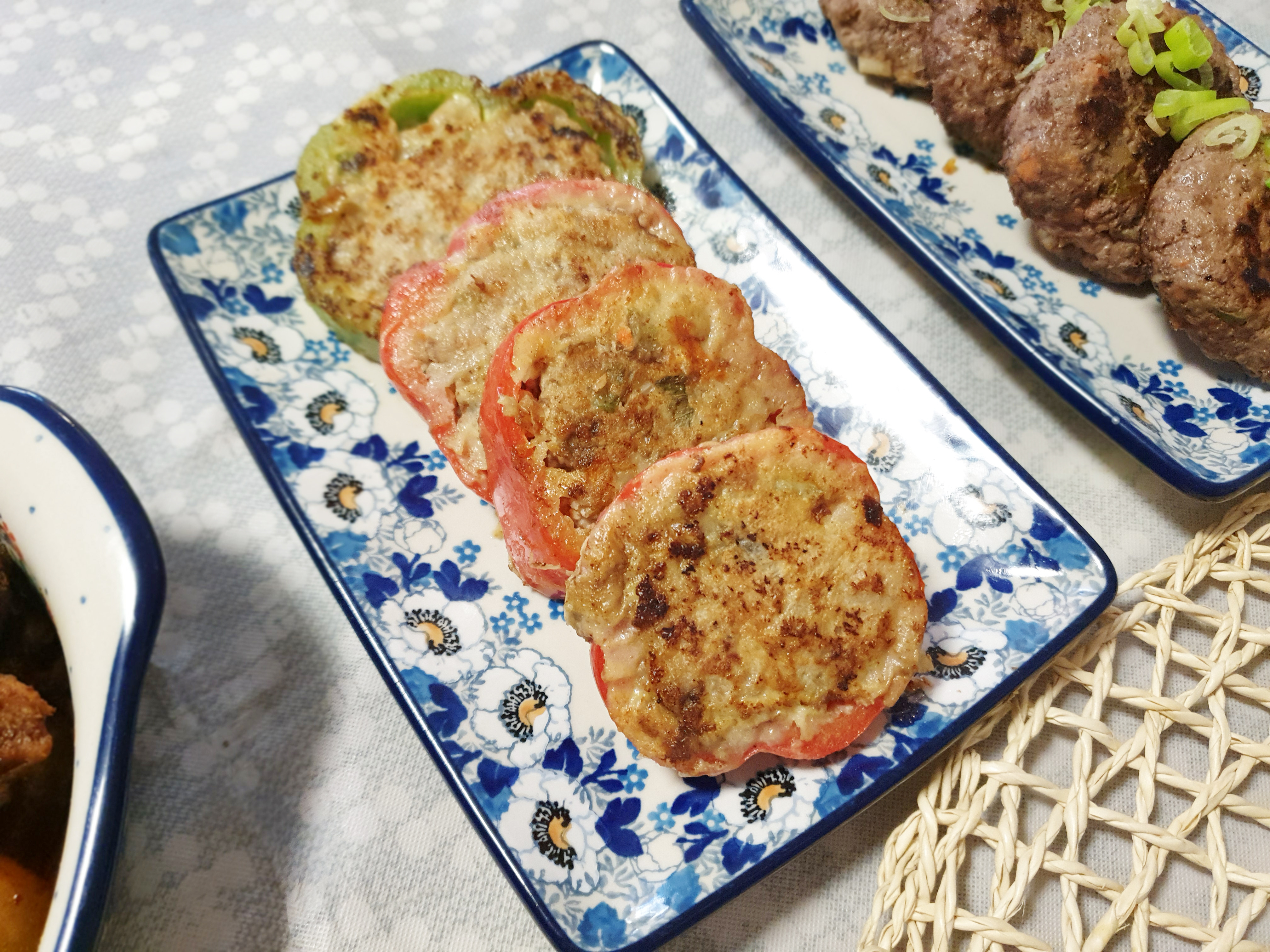 필요한 재료: 피망 2개 , 두부 반모 , 다진 돼지고기 또는 다진 소고기 (270g) , 양송이버섯 3개 , 양파 1/2 개 , 대파 1/2 대 , 당근 1/3개 , 부침가루 , 계란 2개 , 식용유