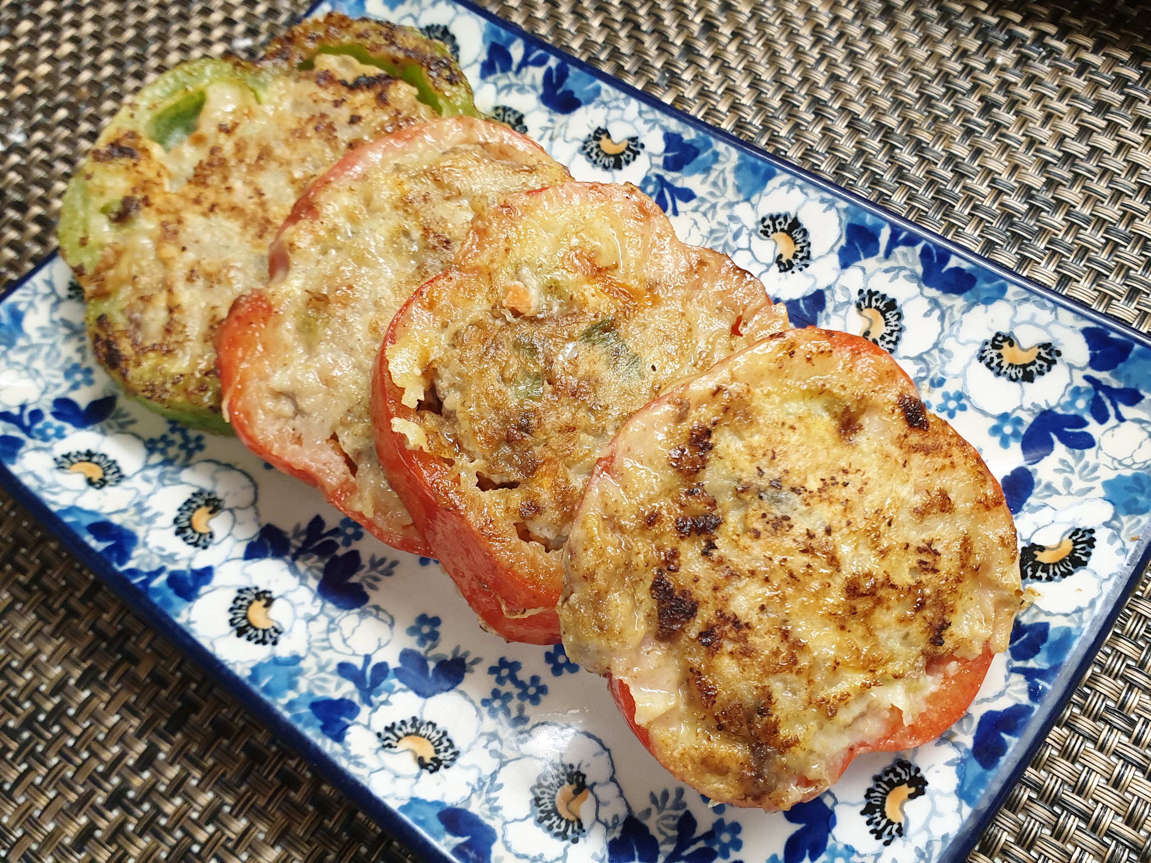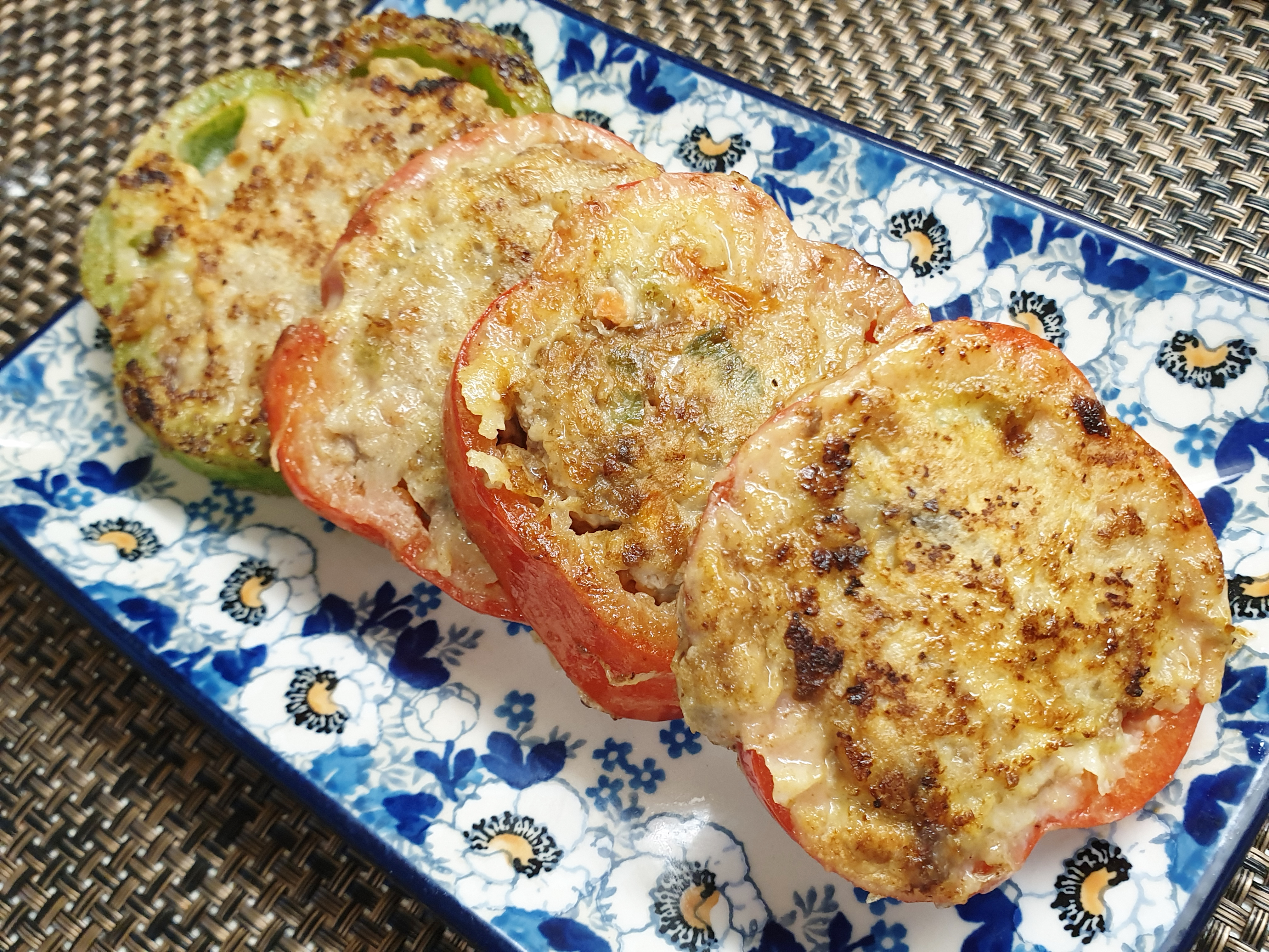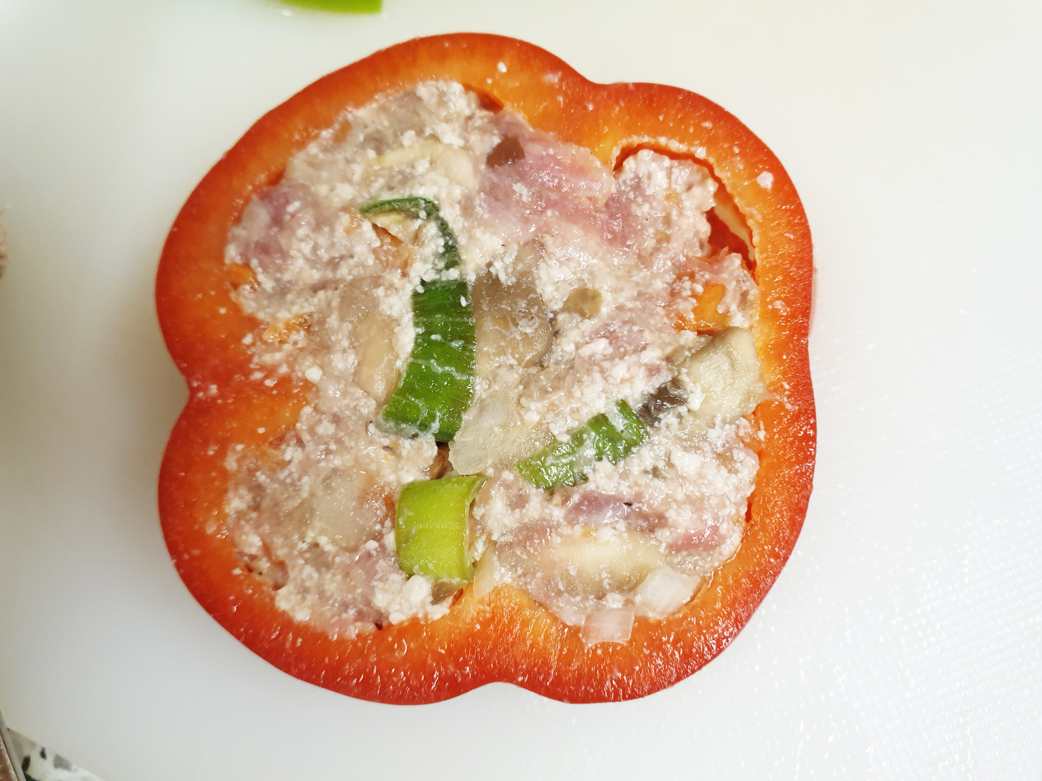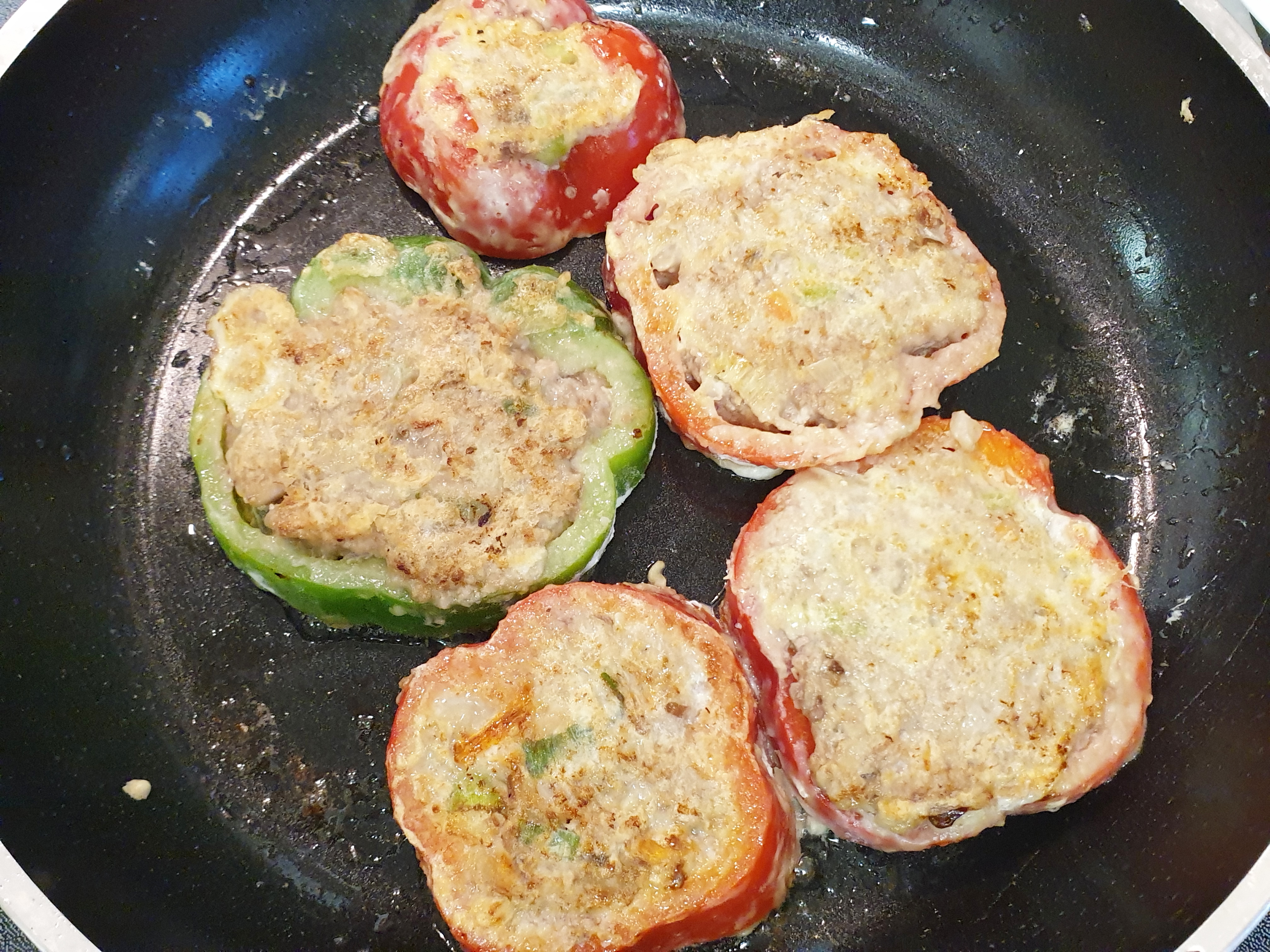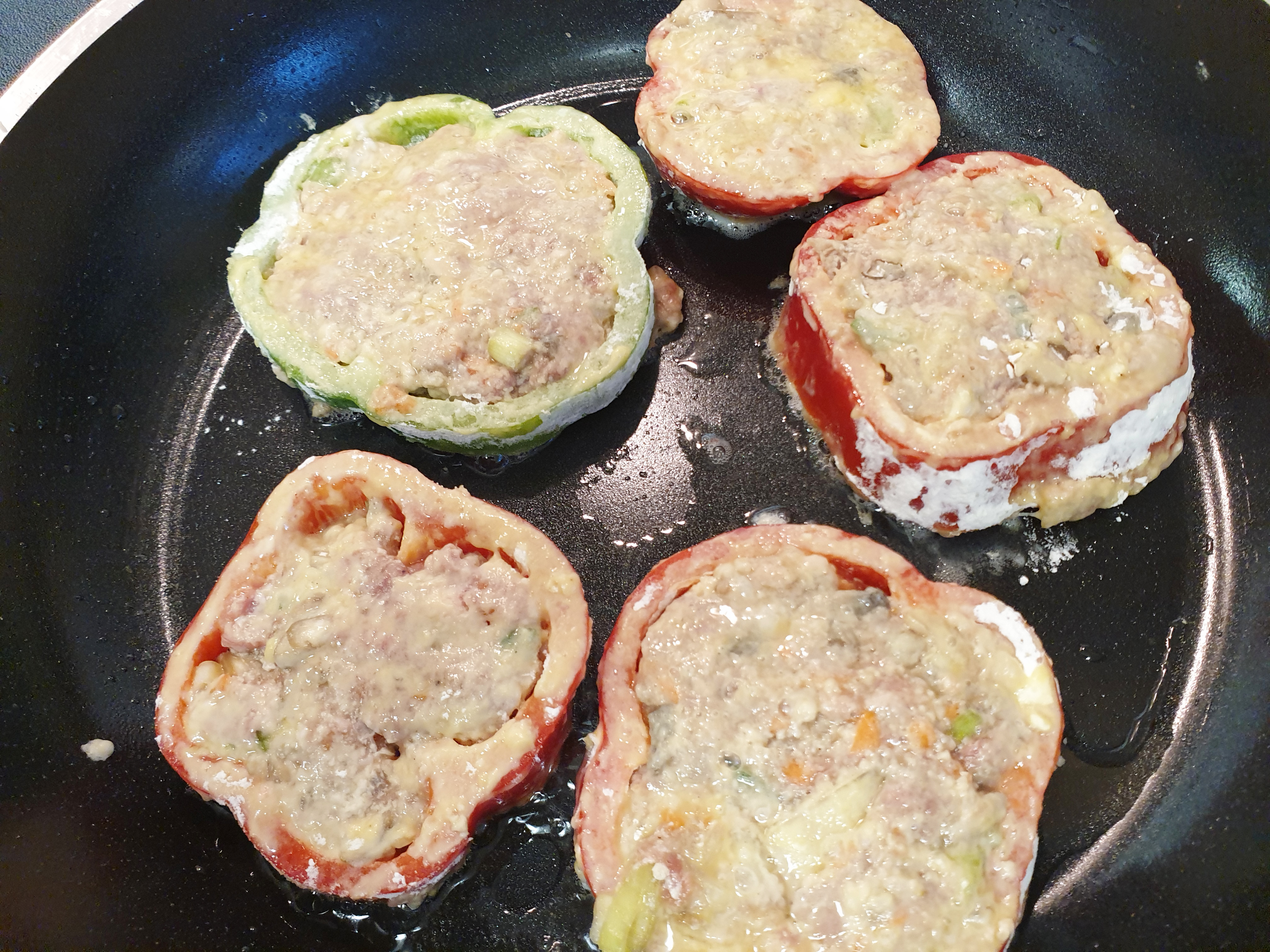 7. 고기소가 골고루 잘 익을 수 있도록 중불보다 약하게 두고 프라이팬에 식용유를 두른 뒤 기름이 달궈지면 고기소를 넣은 피망을 올리고 앞뒤로 천천히 익혀 주면 끝!