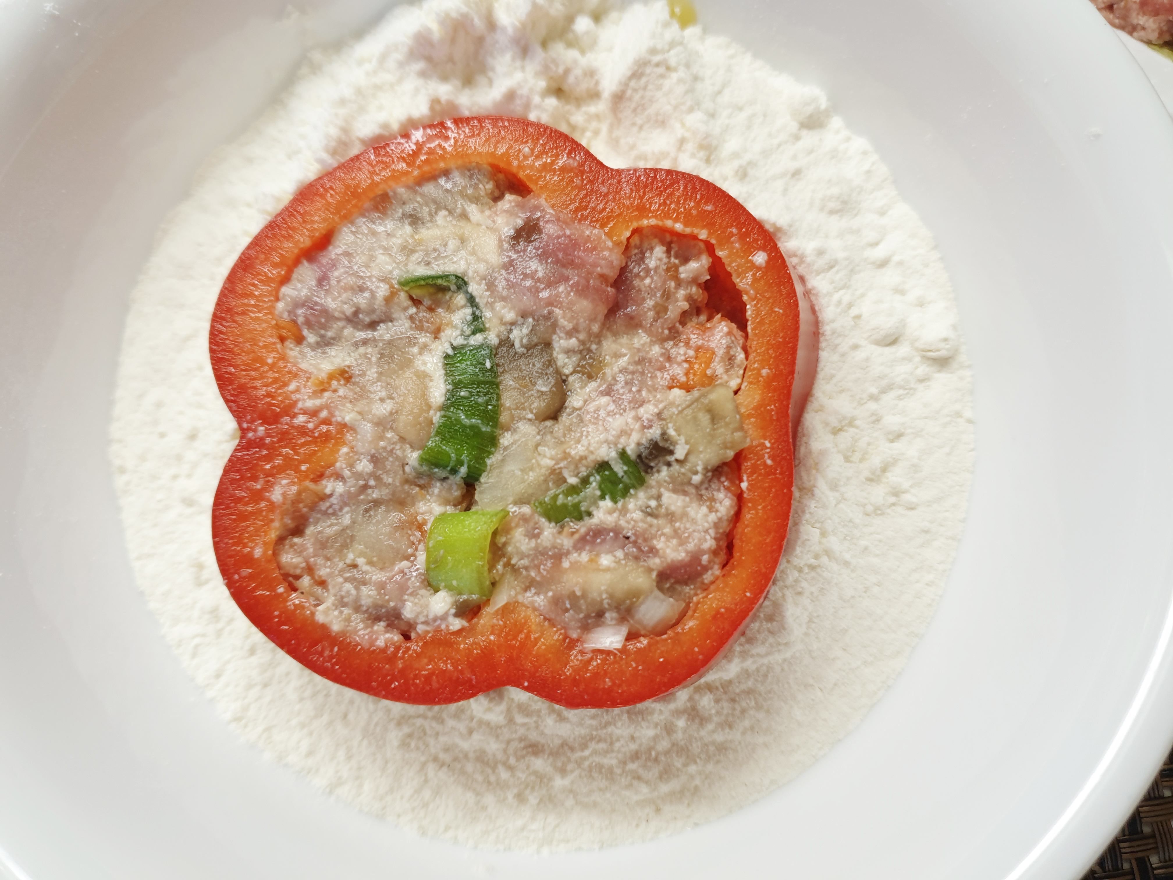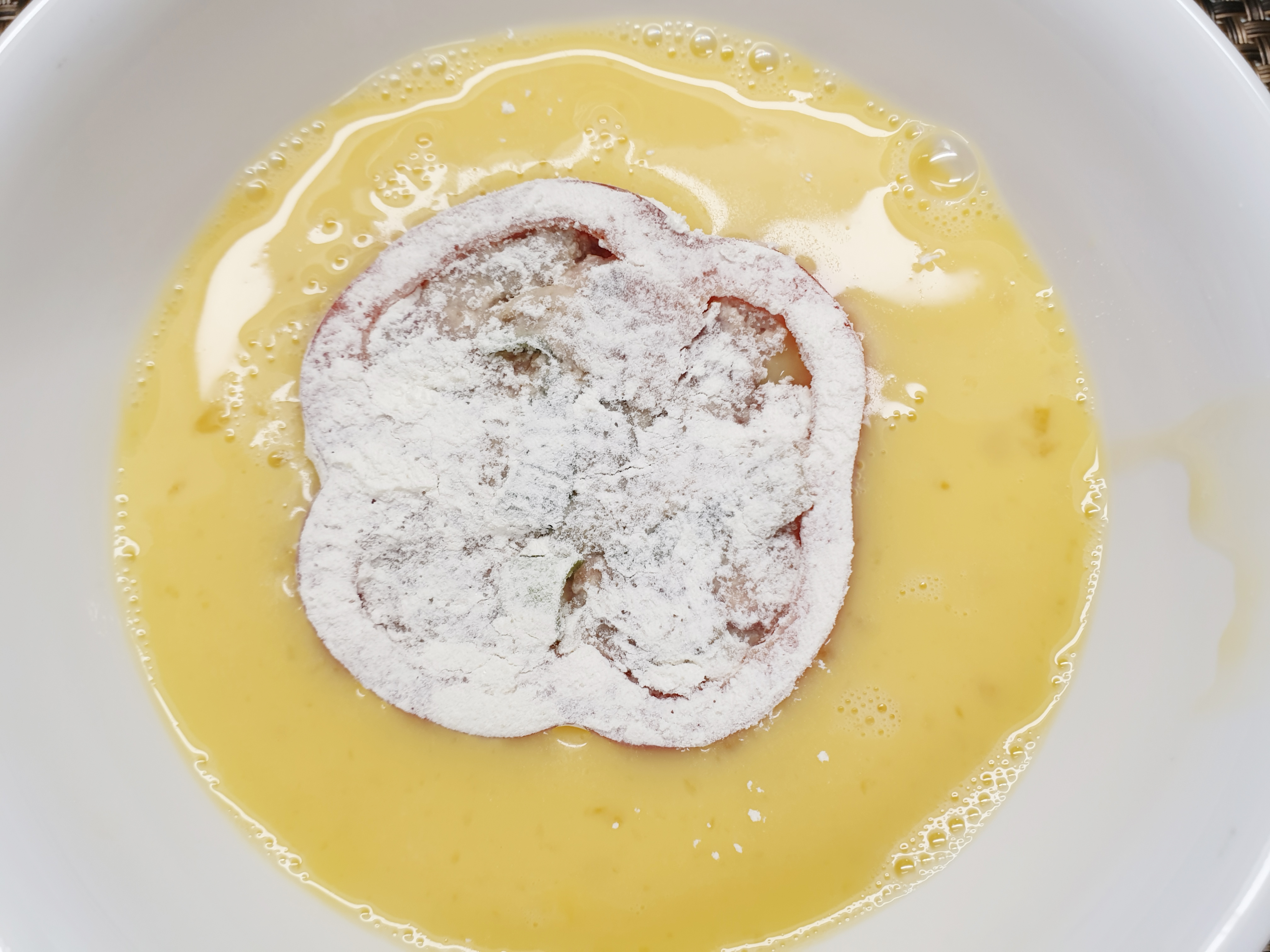 6. 썰은 피망 안에 만들어 둔 고기소를 넣은 뒤 부침가루를 묻히고 계란물을 입혀 줍니다.