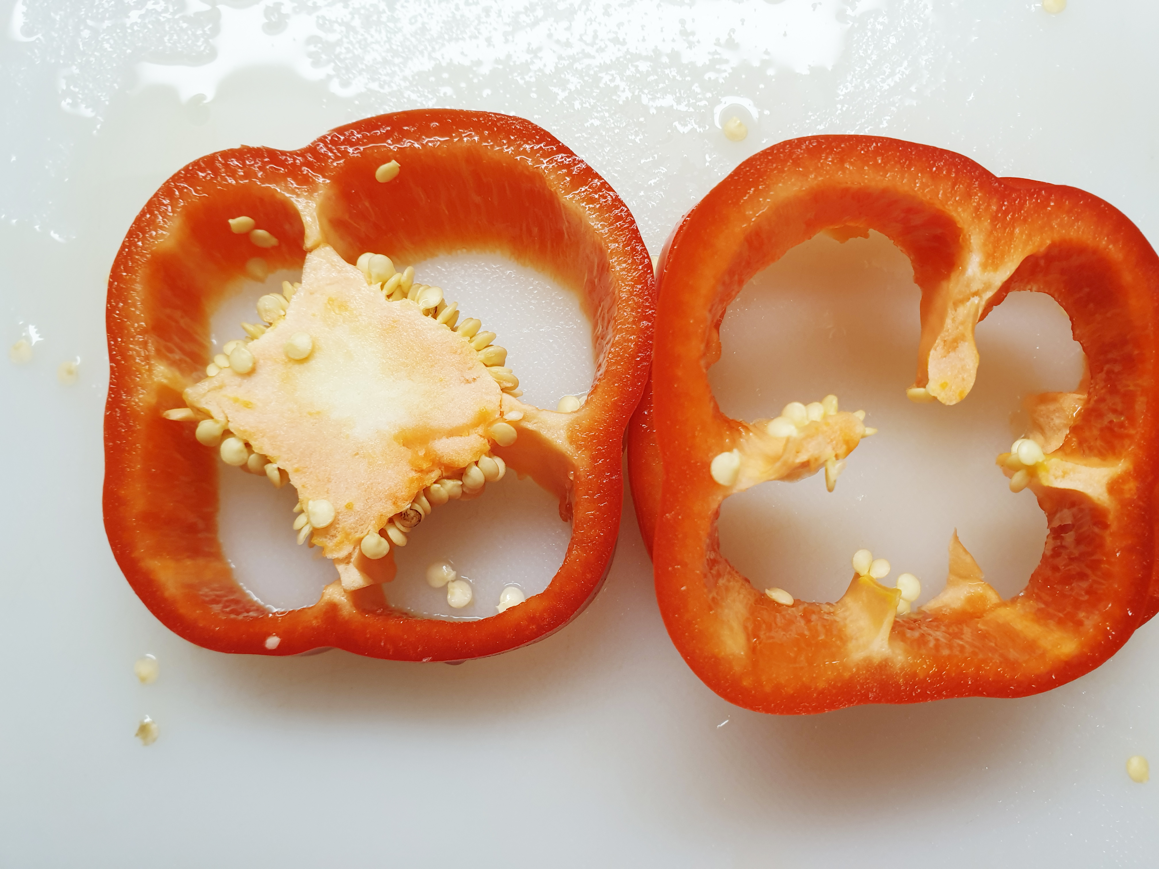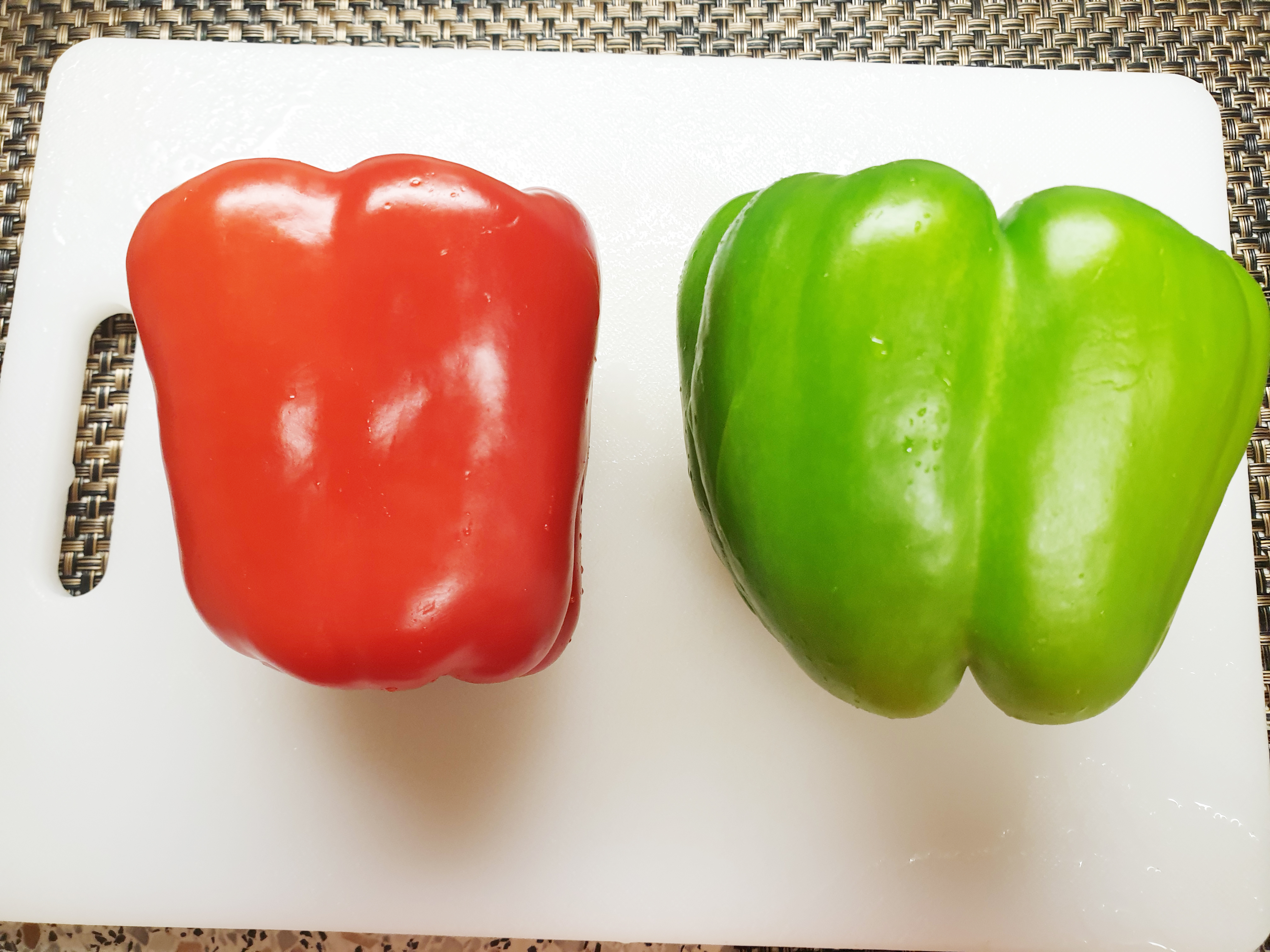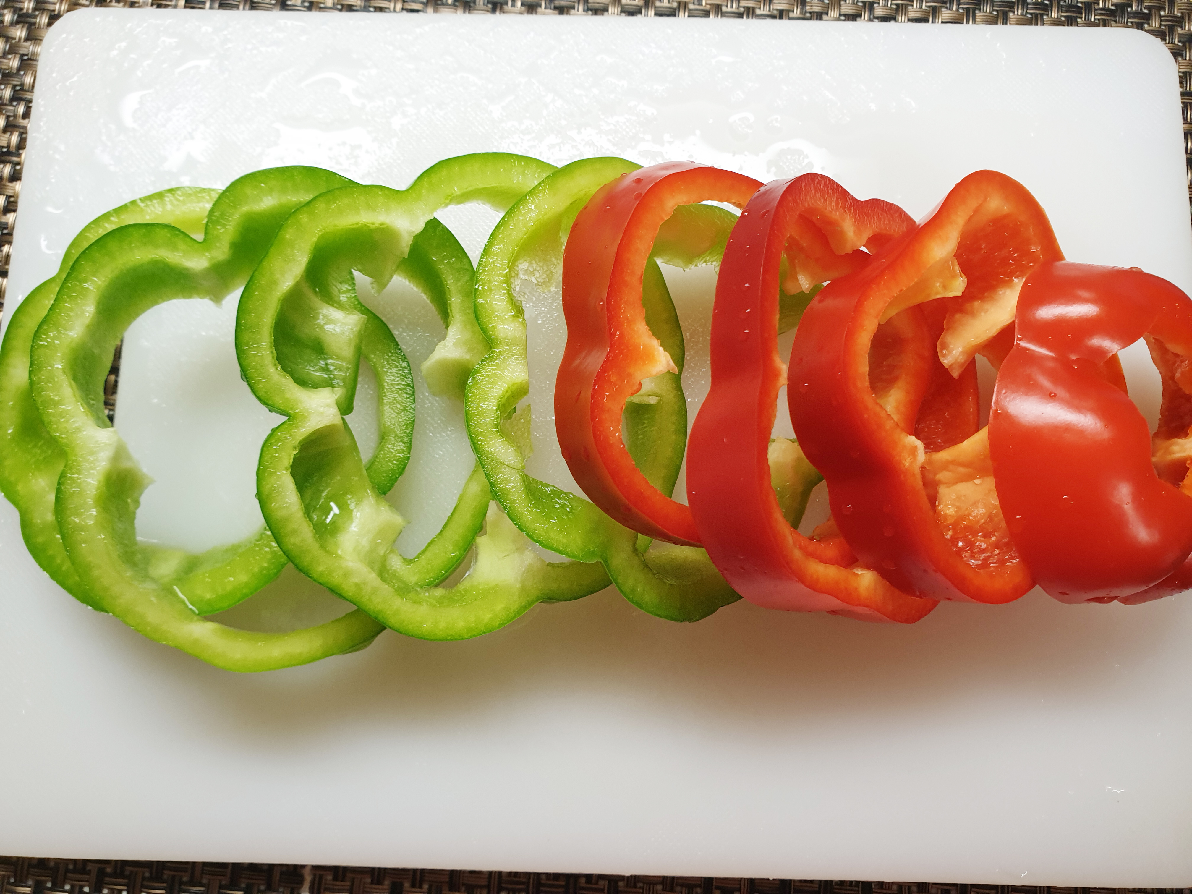 4. 피망 2개를 깨끗이 씻어 주고 약 1cm 굵기로 썰어 준 다음 안에 씨를 제거해주세요~!