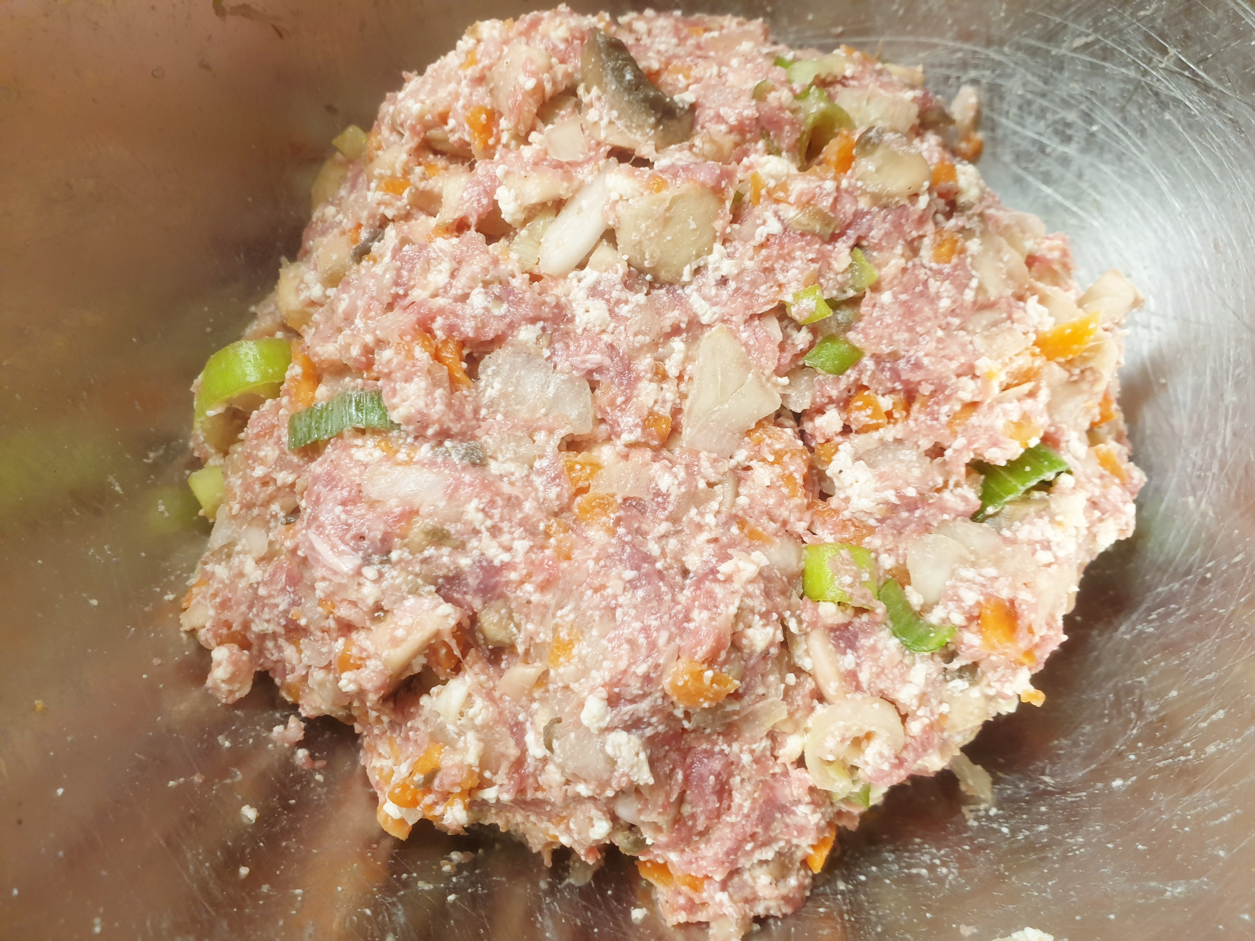 3. 모든 재료를 준비했다면 다진 돼지고기 또는 다진 소고기 270g , 두부, 양파, 당근 , 대파, 양송이버섯을 한 곳에 담아 주고후춧가루와 약간의 소금, 참기름을 넣고 잘 섞어 줍니다.