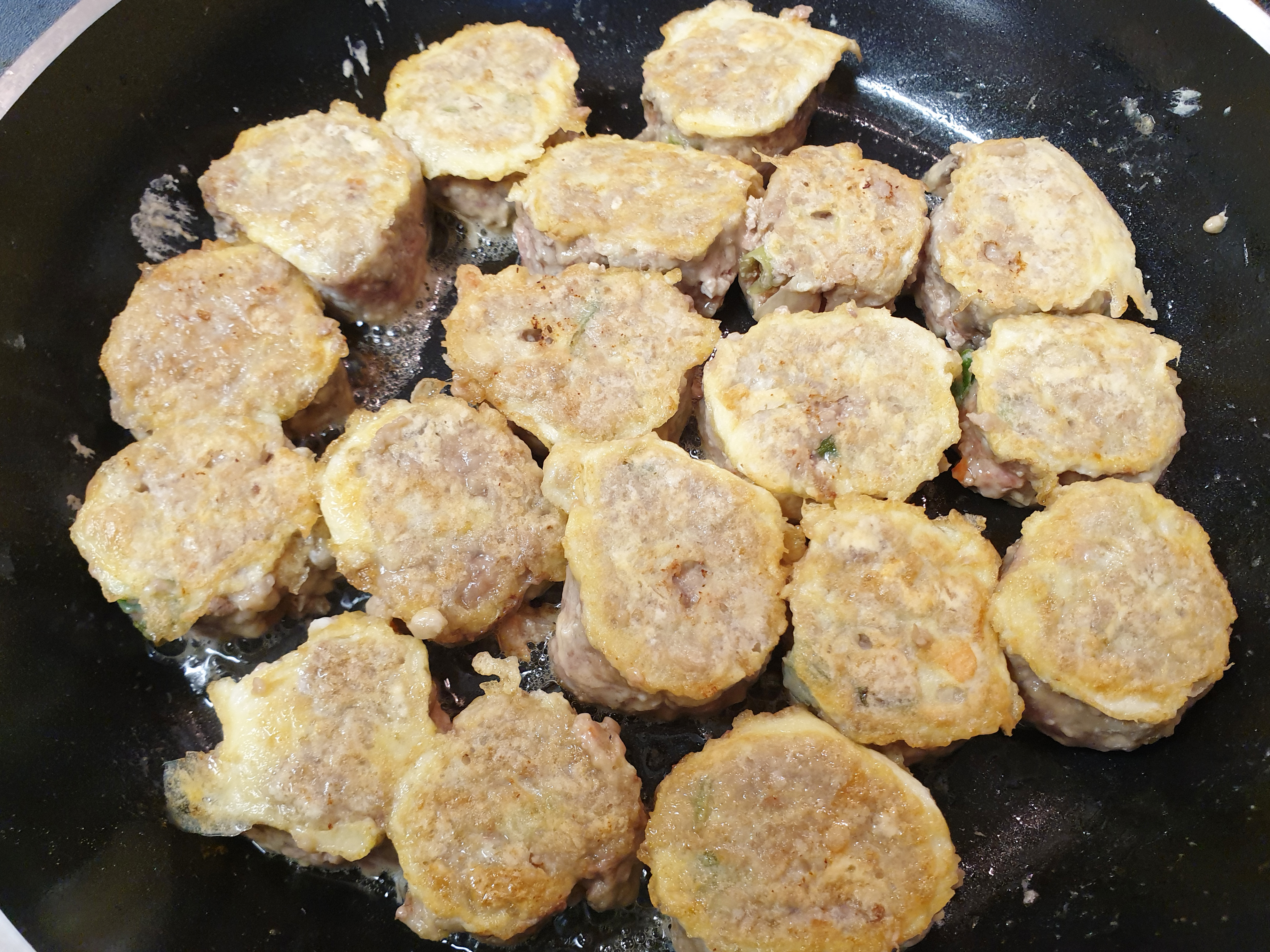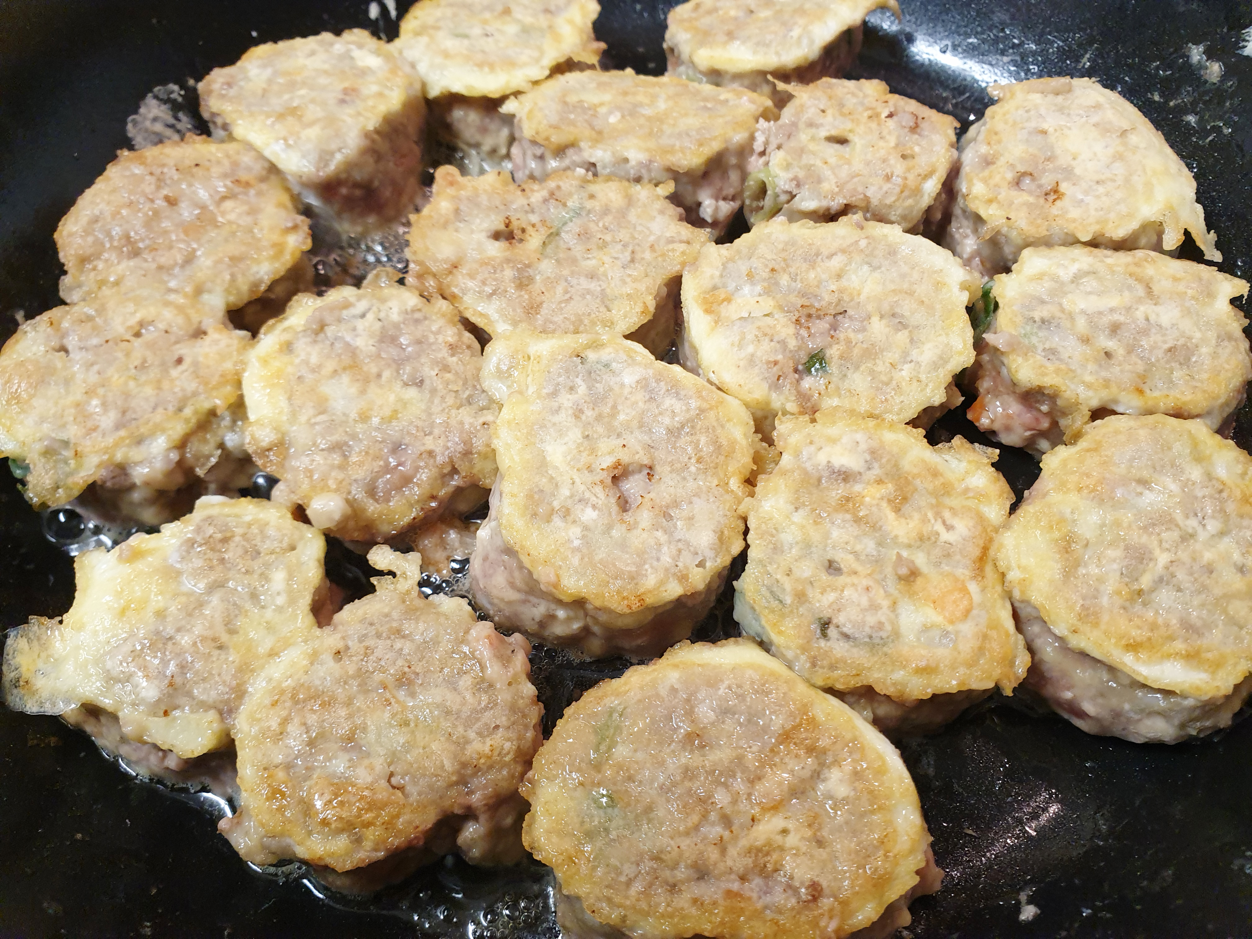 8. 프라이팬에 기름을 충분히 두르고 불은 중불보다 약하게 둔 후 속까지 잘 익을 수 있도록 천천히 앞 뒤로 익혀 주면 끝!