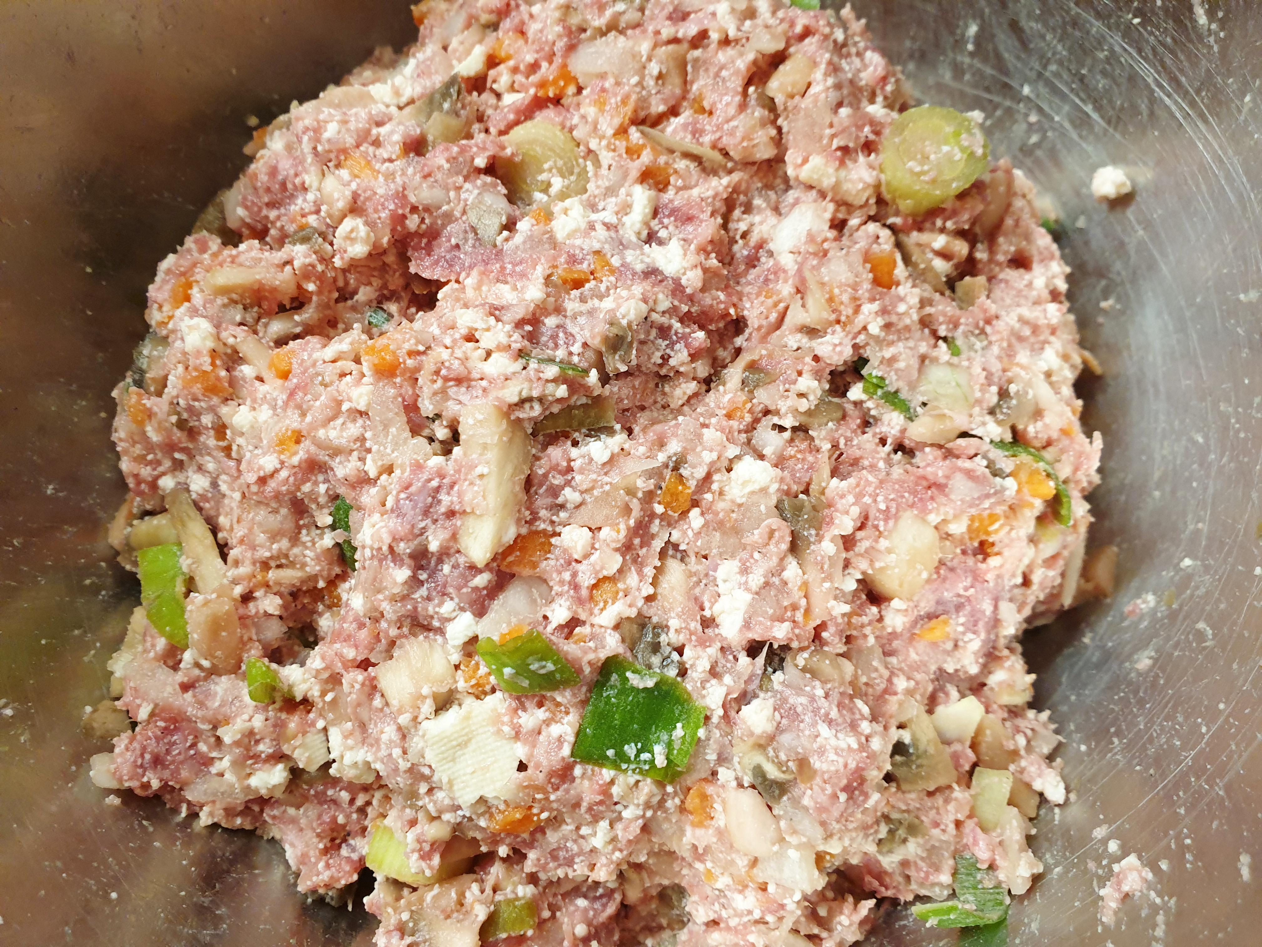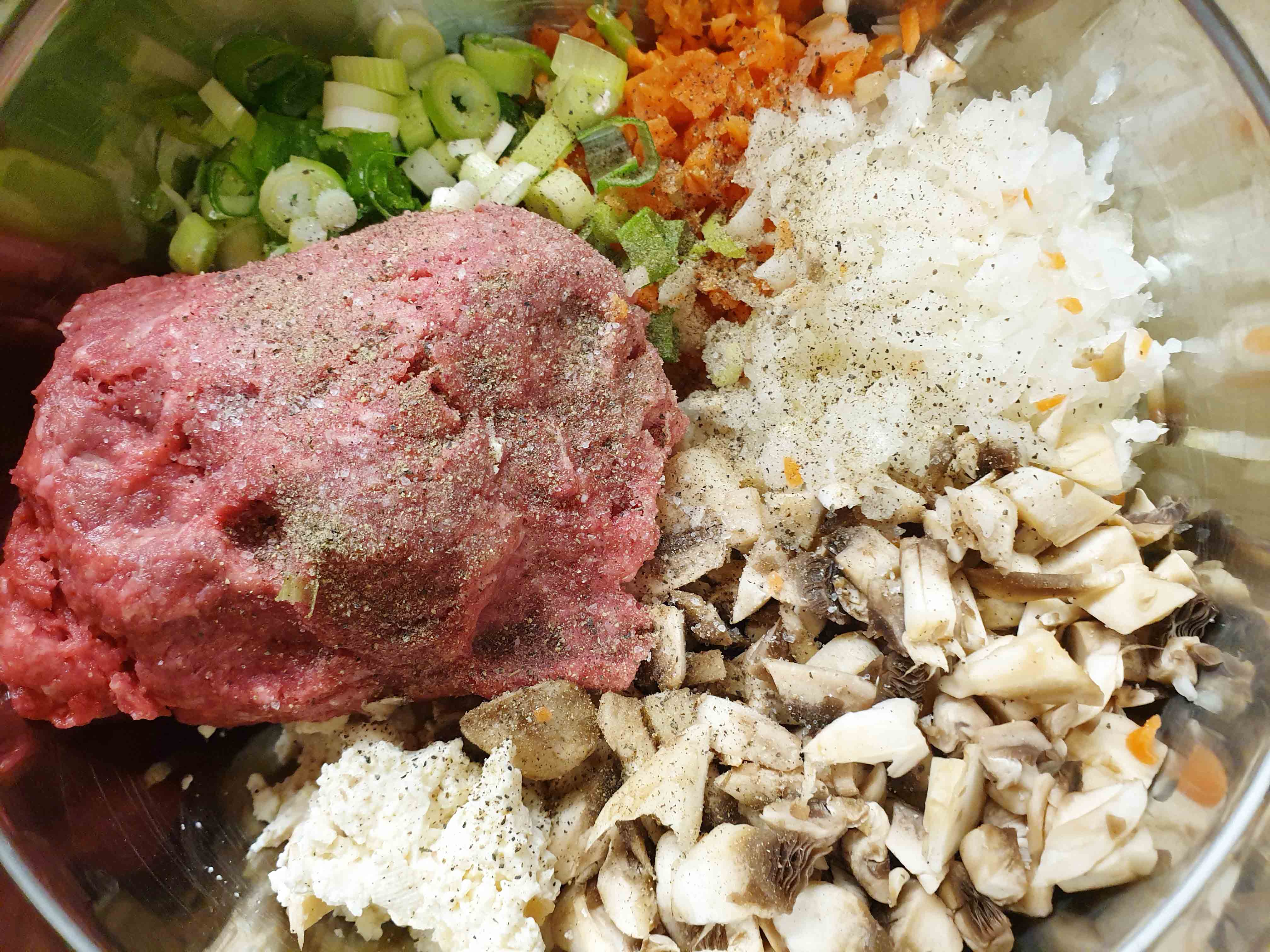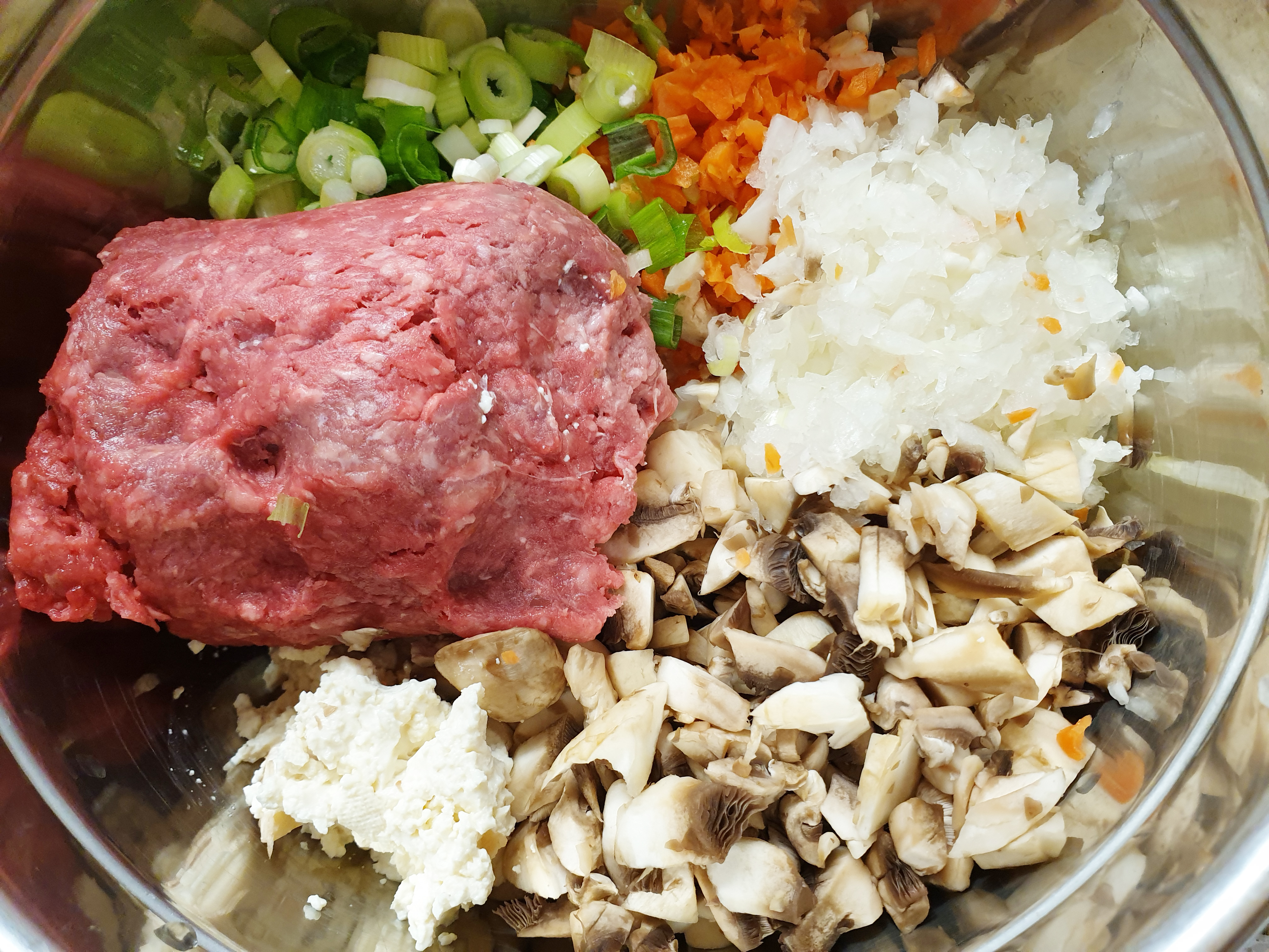 필요한 재료: 다진 돼지고기 또는 소고기 400g , 양송이버섯 5개 , 당근 1/2개, 양파 1/2개, 대파 1/2대 , 두부 반모 , 부침가루 , 계란 2개 , 식용유