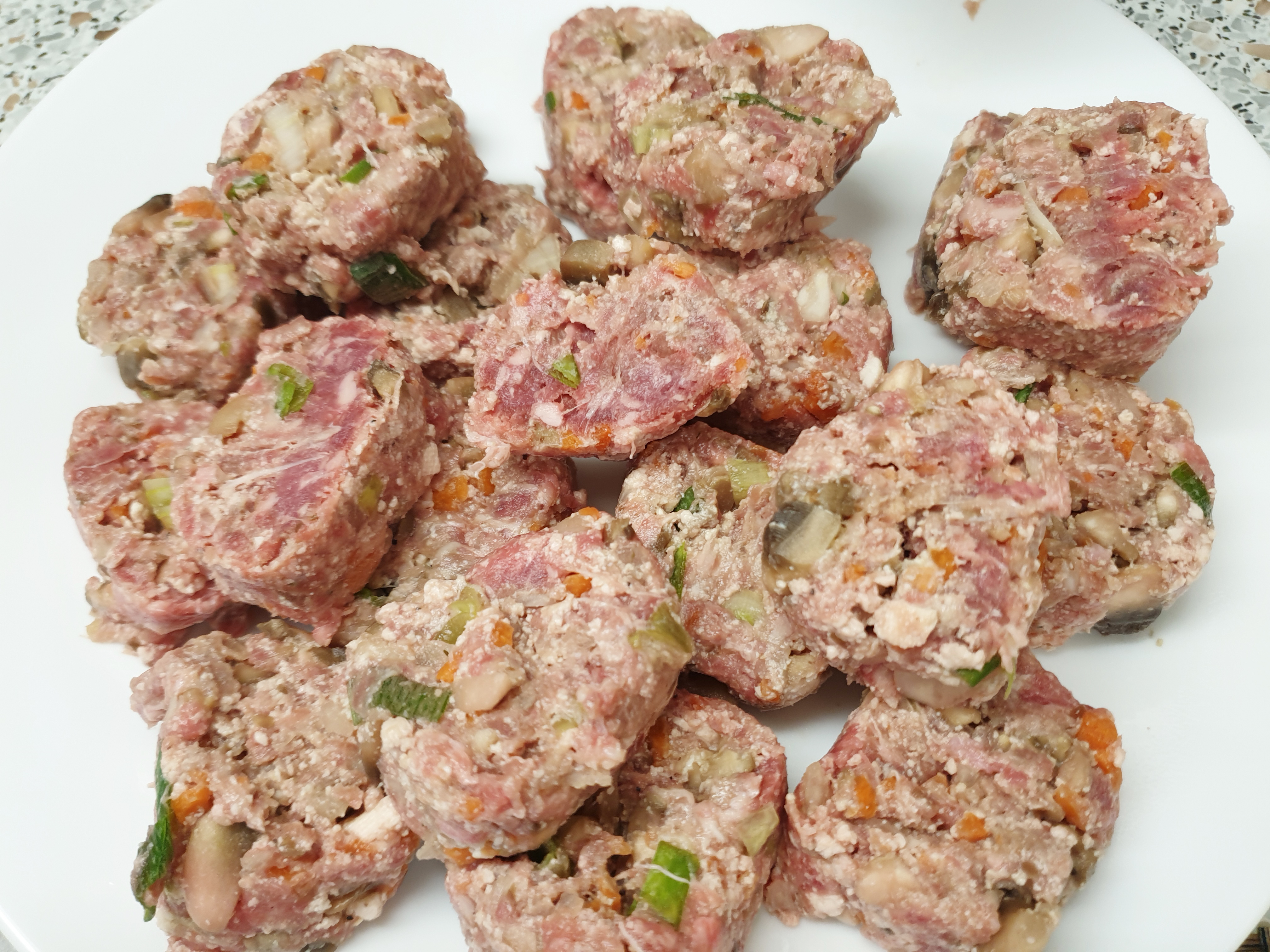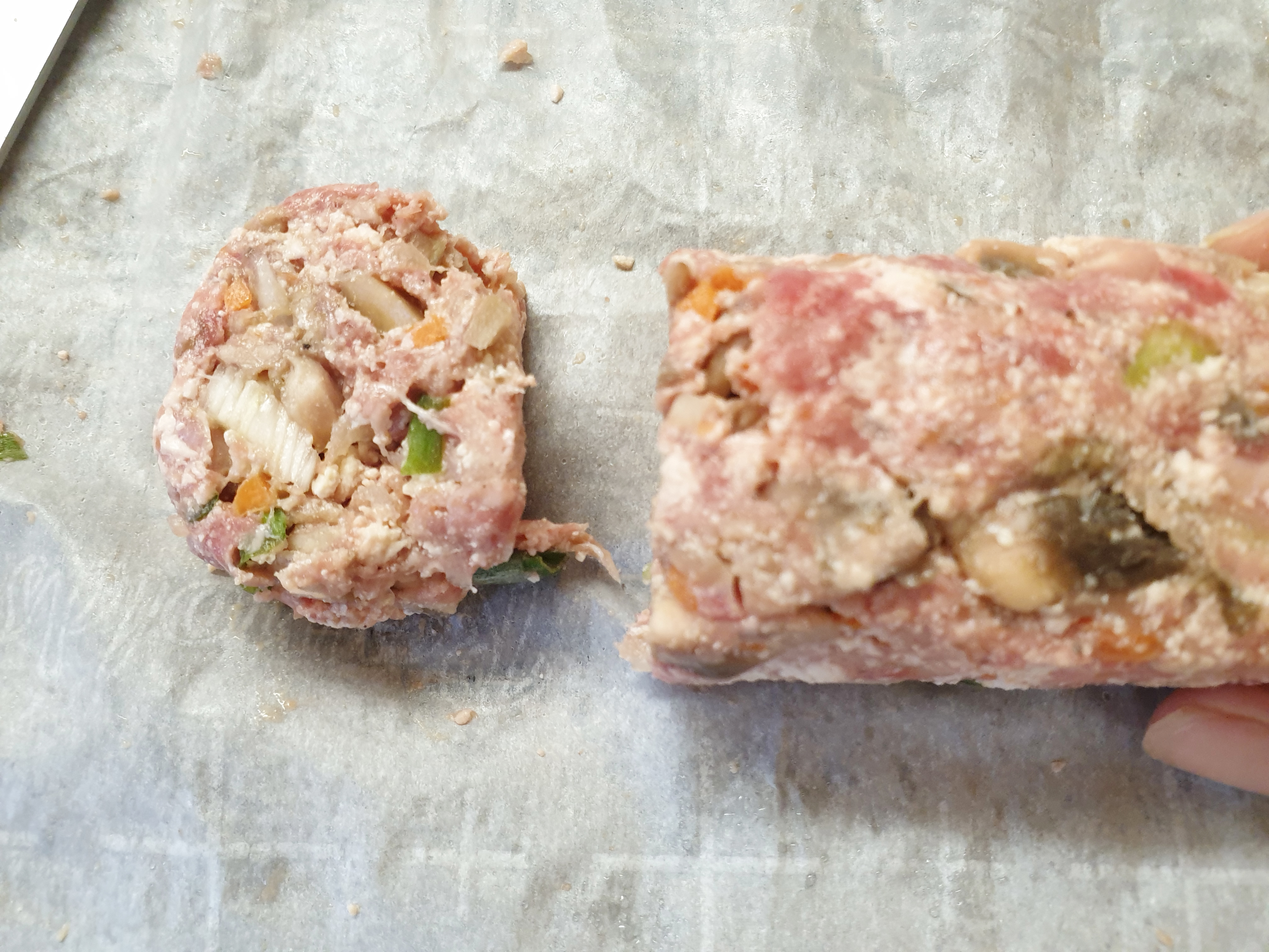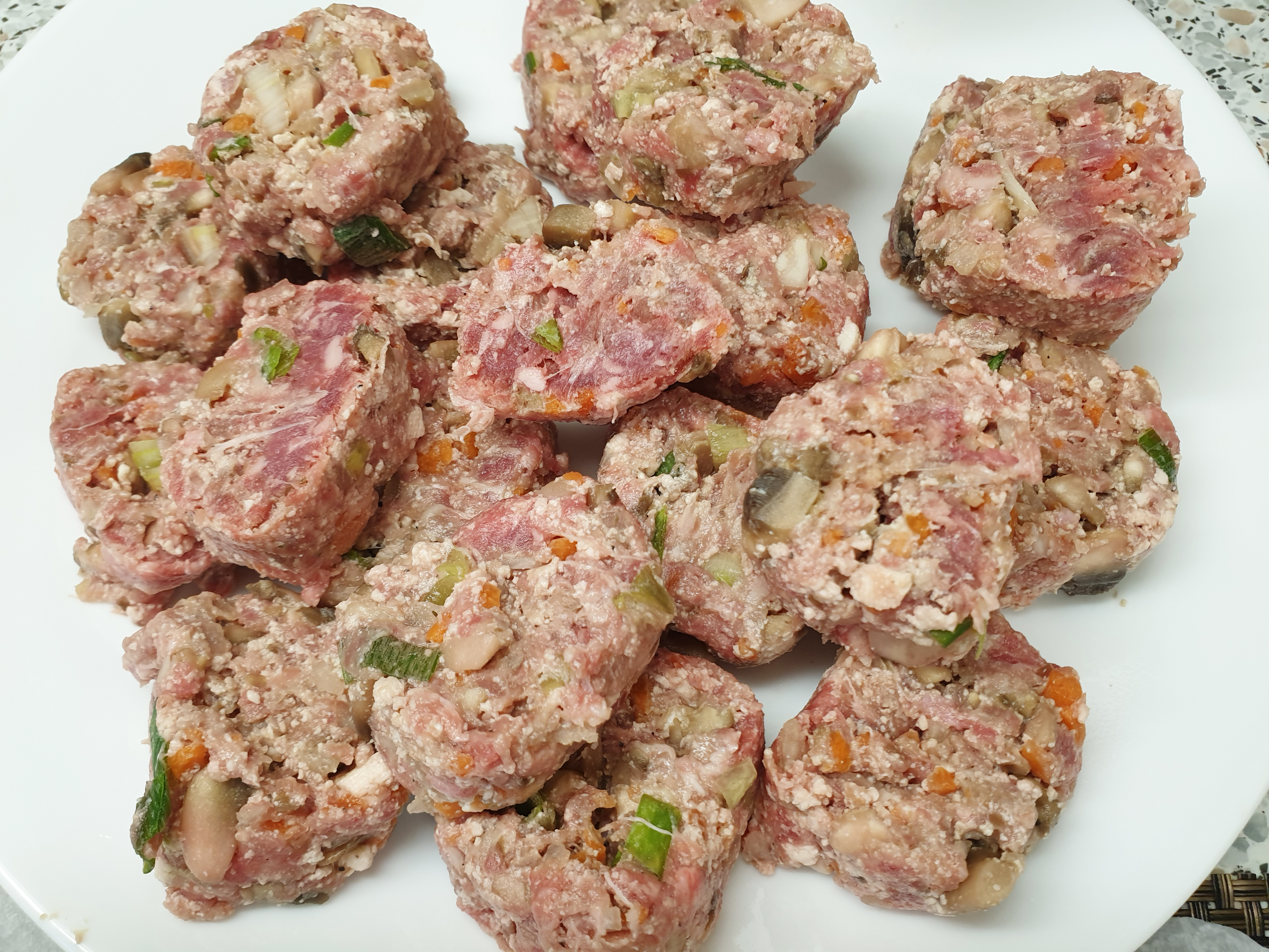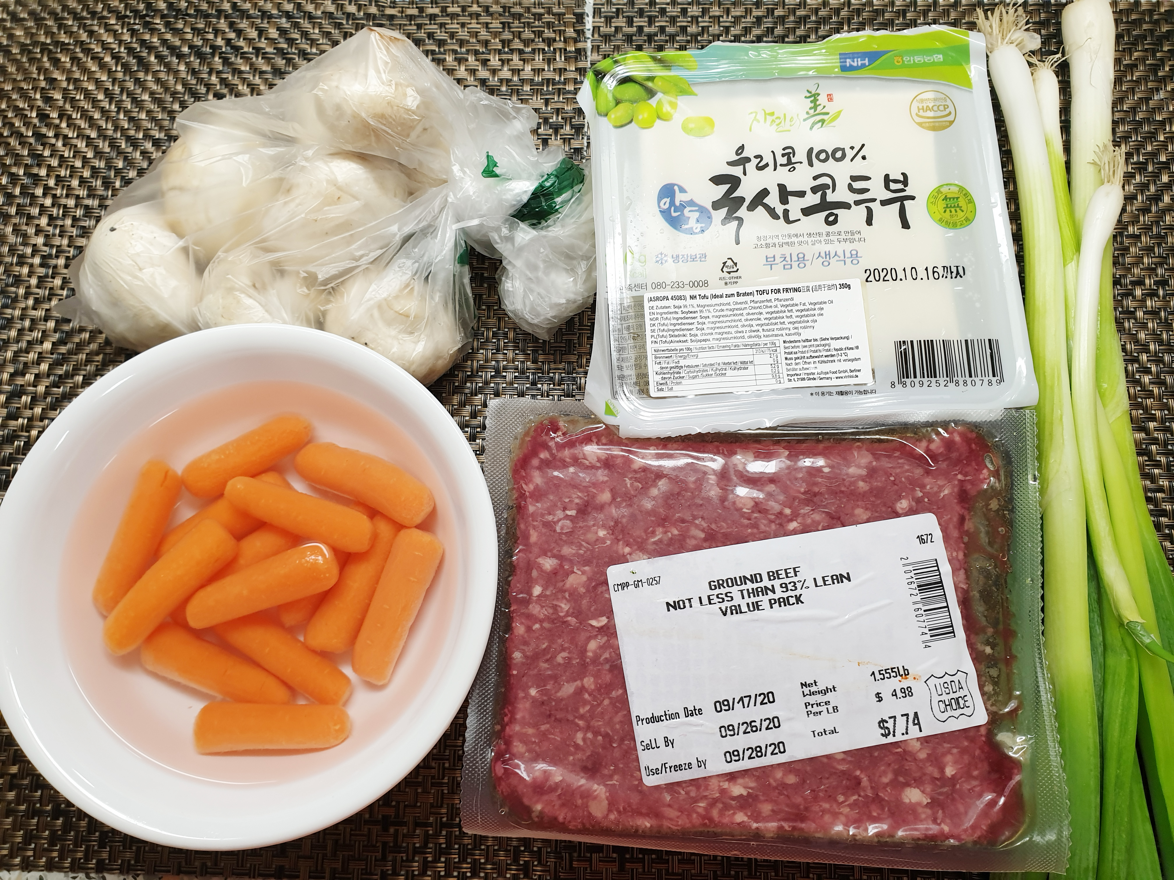 필요한 재료: 다진 돼지고기 또는 소고기 400g , 양송이버섯 5개 , 당근 1/2개, 양파 1/2개, 대파 1/2대 , 두부 반모 , 부침가루 , 계란 2개 , 식용유
