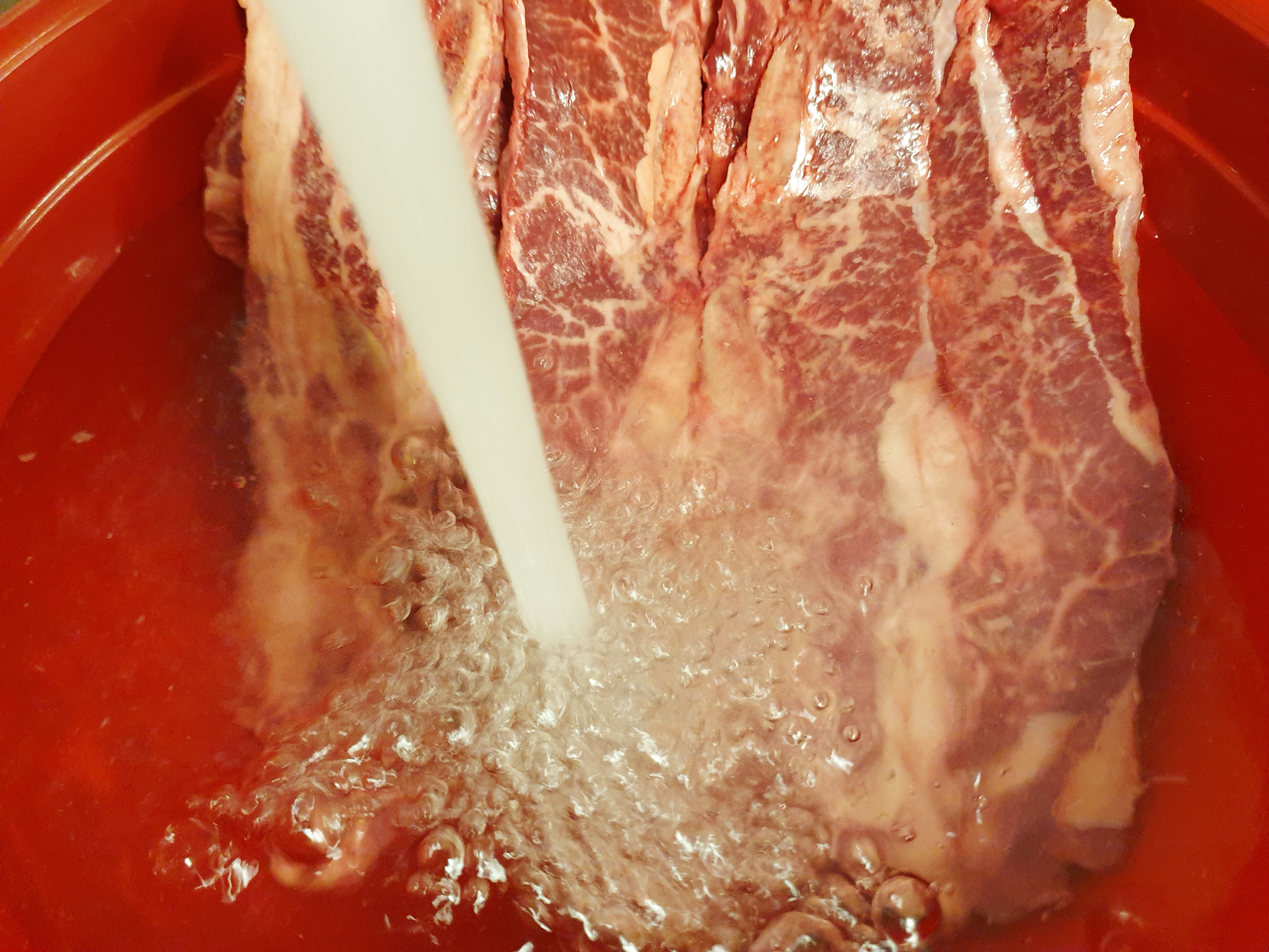 3. 채소가 준비됐다면 la갈비도 흐르는 물에 뼈 부분을 문질러 주면서 붙어 있는 뼛가루를 잘 씻어줍니다. 오른쪽 사진은 씻은 후 la갈비에서 나온 뼛가루인데 정말 많은 뼛가루가 붙어 있었죠?