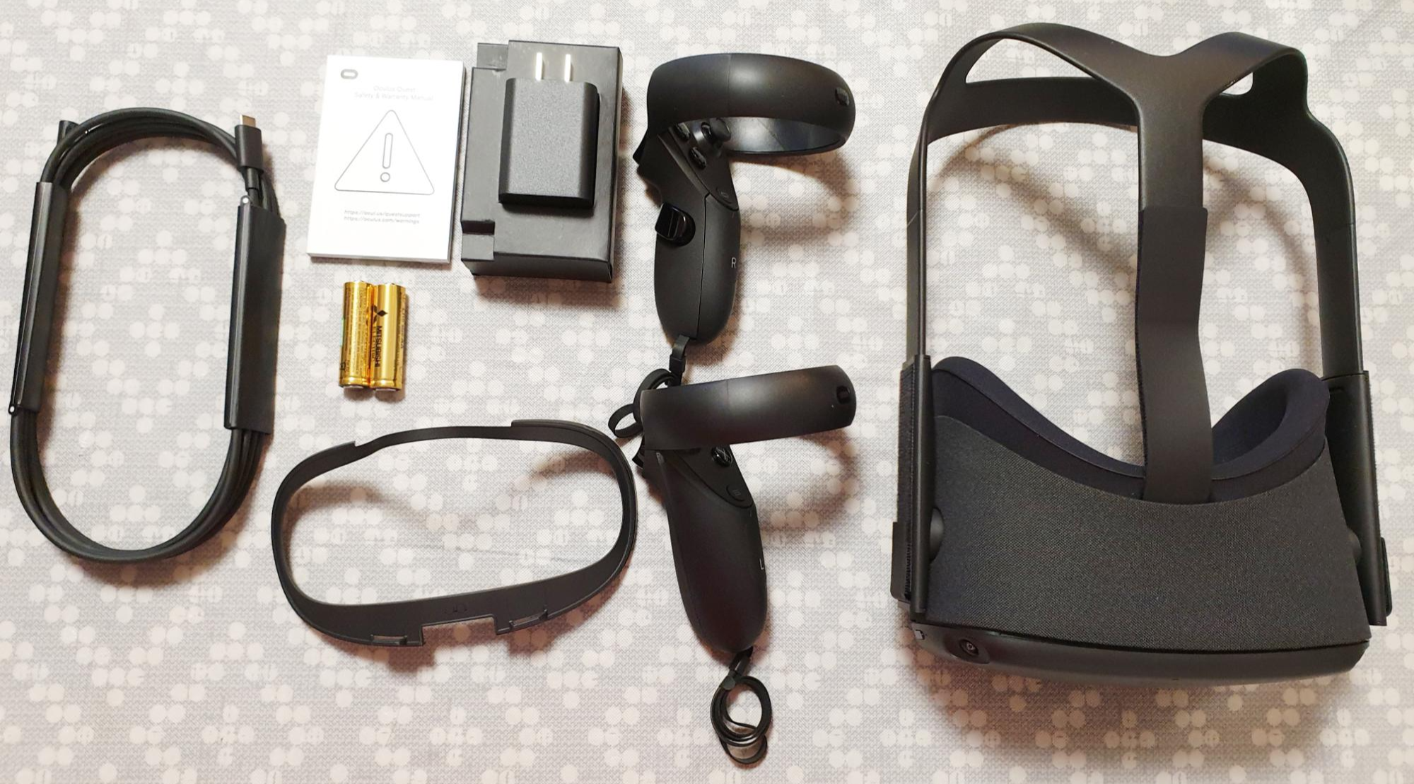 오큘러스 퀘스트 구성은 VR 헤드셋 1 , 컨트롤러 2 , 전원 어댑터 1 , 안경용 액세서리 1 , 충전 케이블 1, 건전지 2 개로 구성되어 있어요!