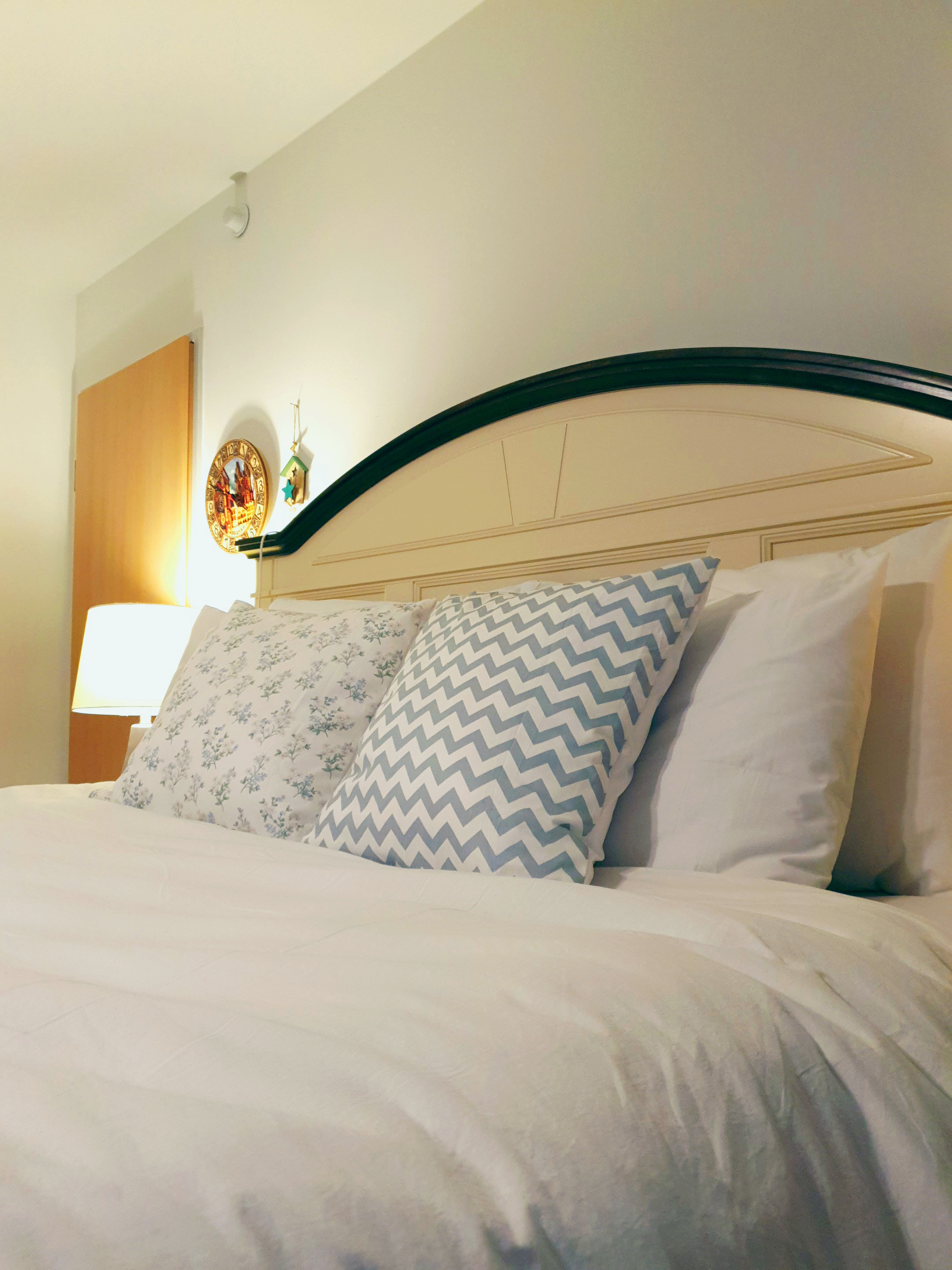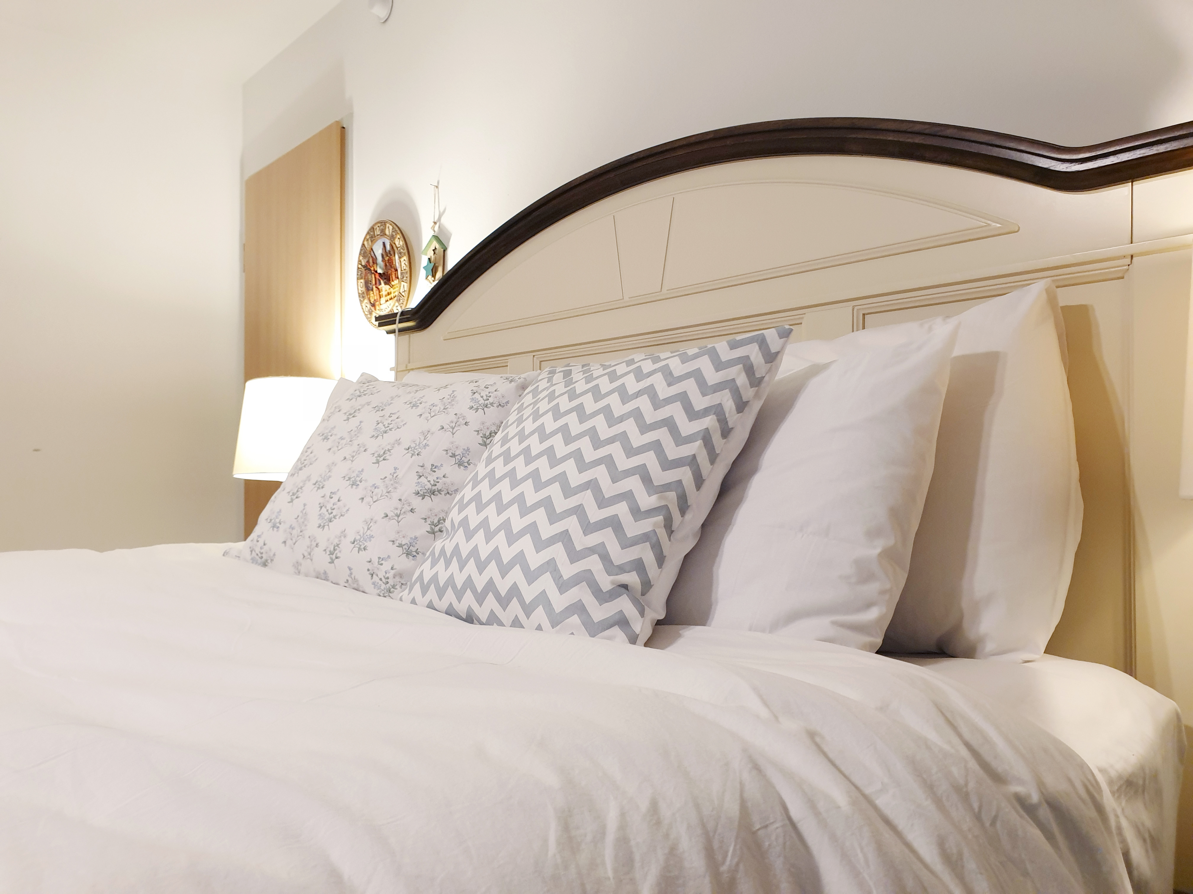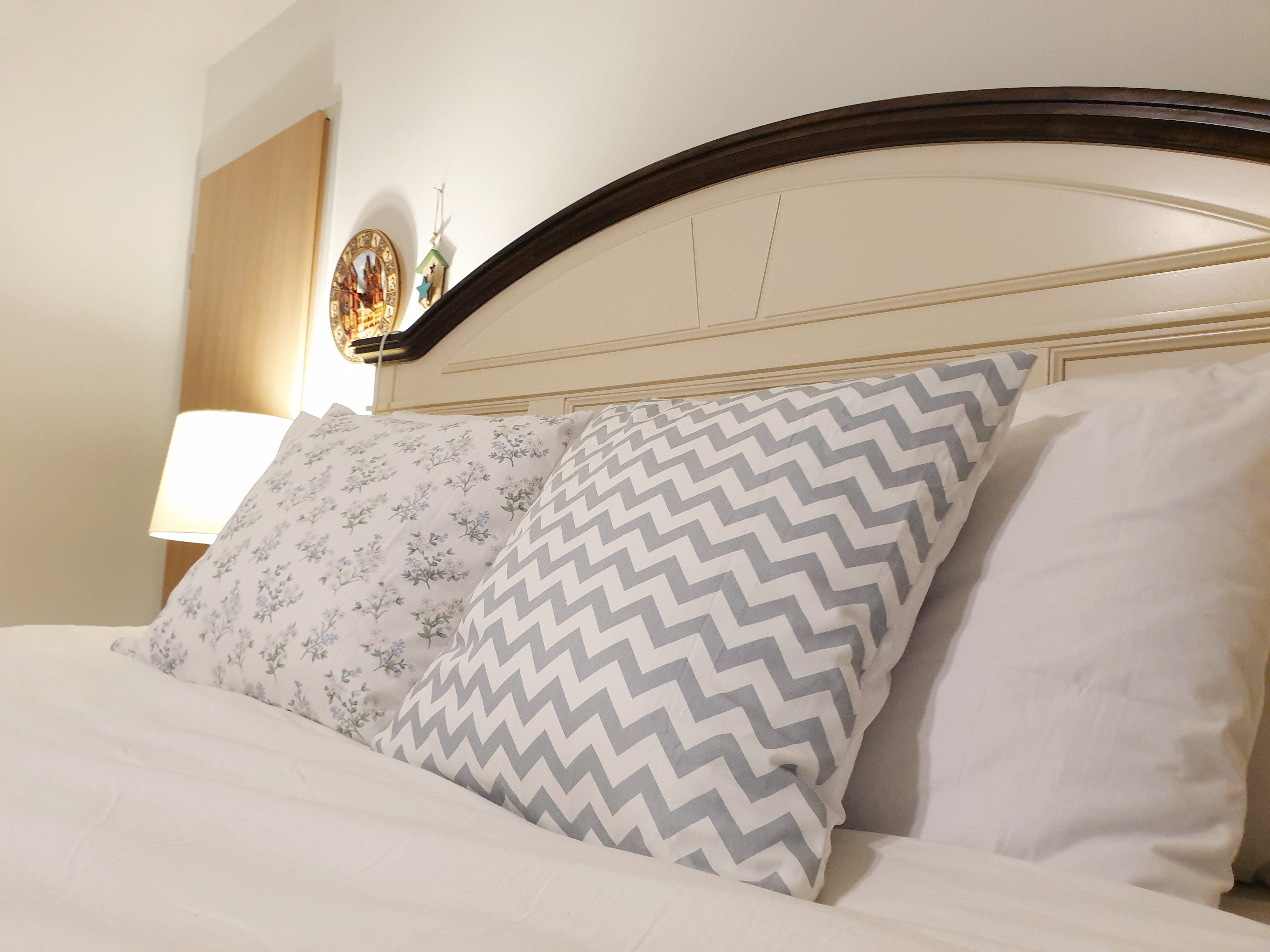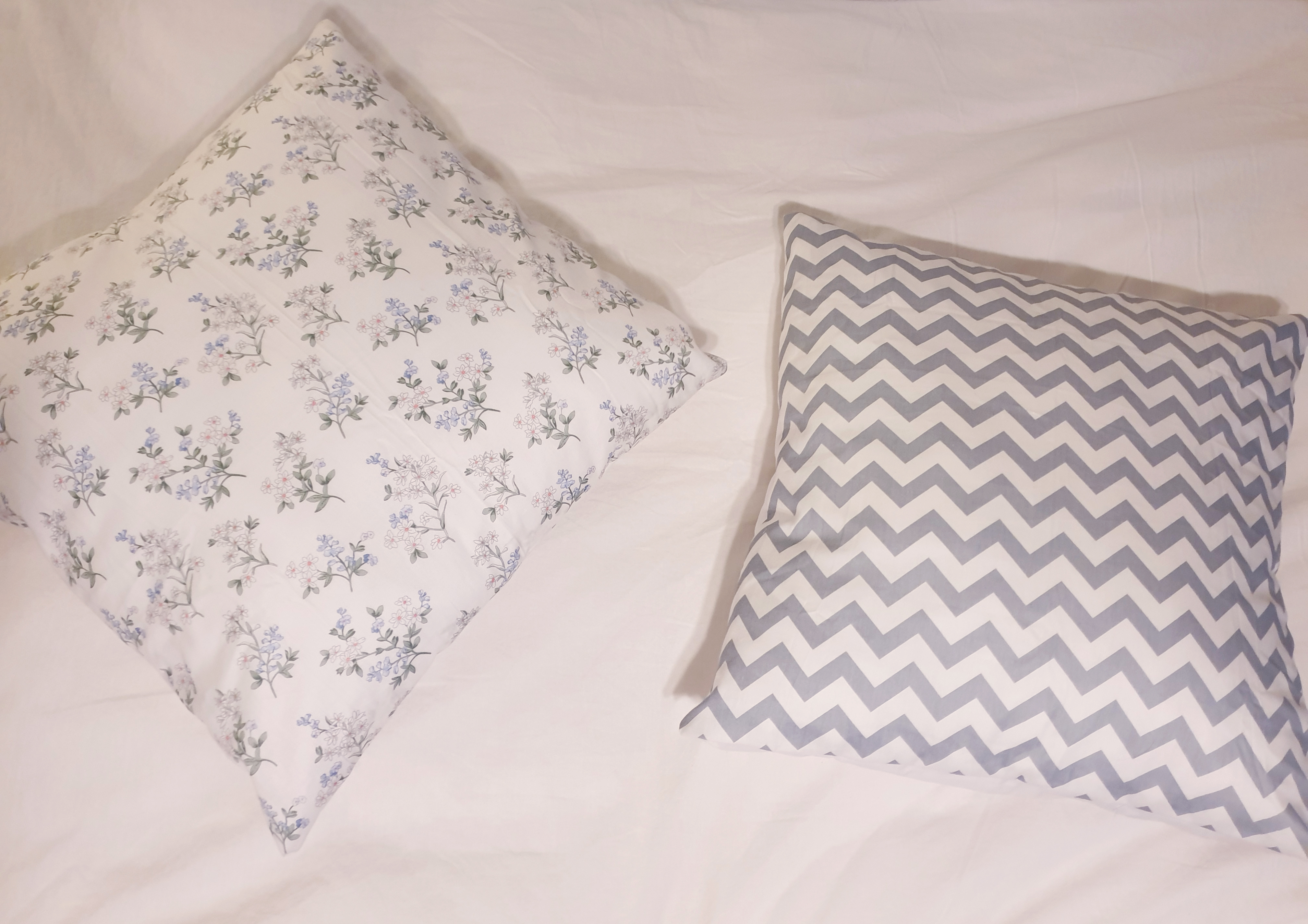 흰색 침구에 너무 튀지 않도록 은은한 색상과 패턴으로 골라 만들어 봤어요~