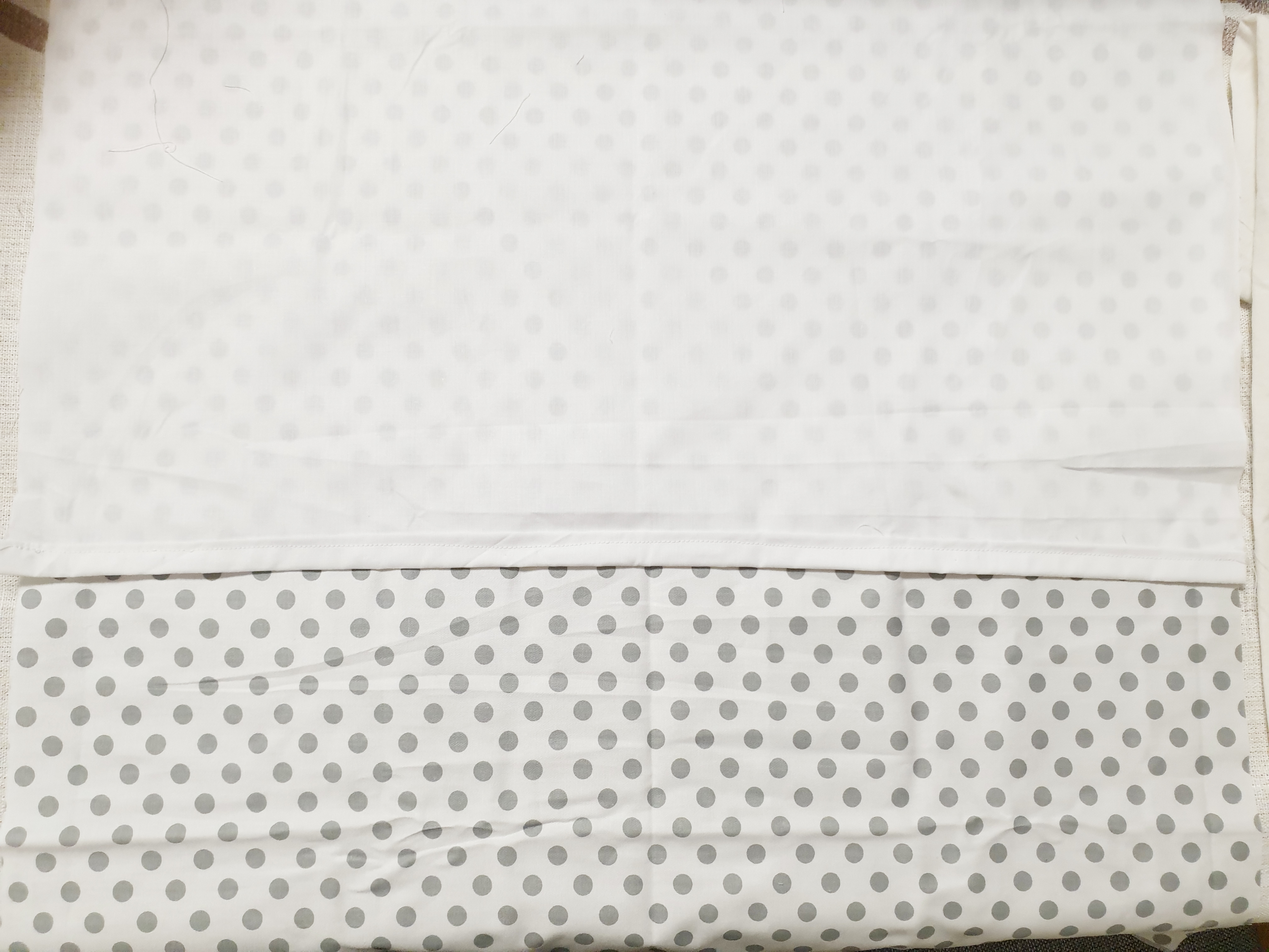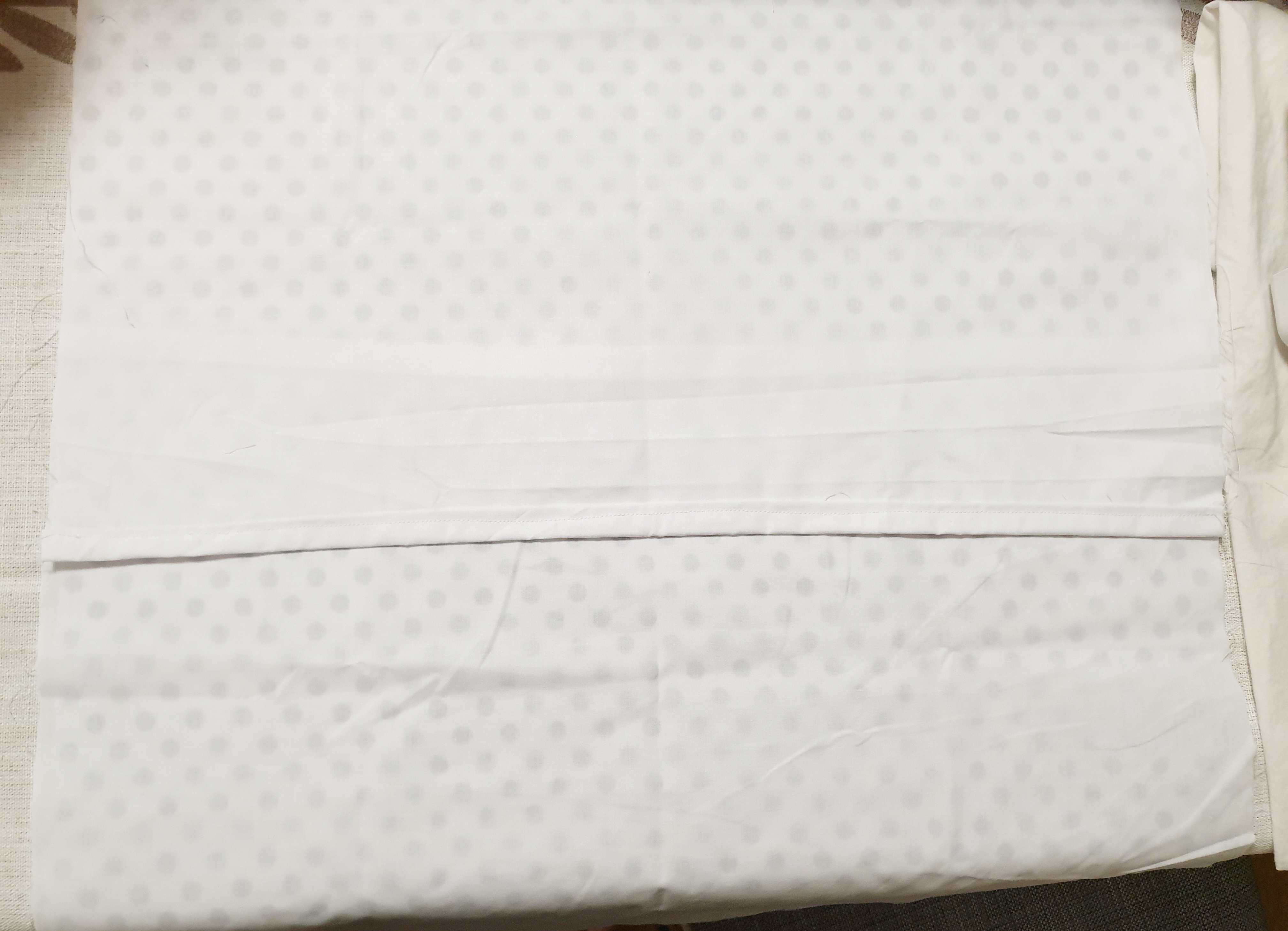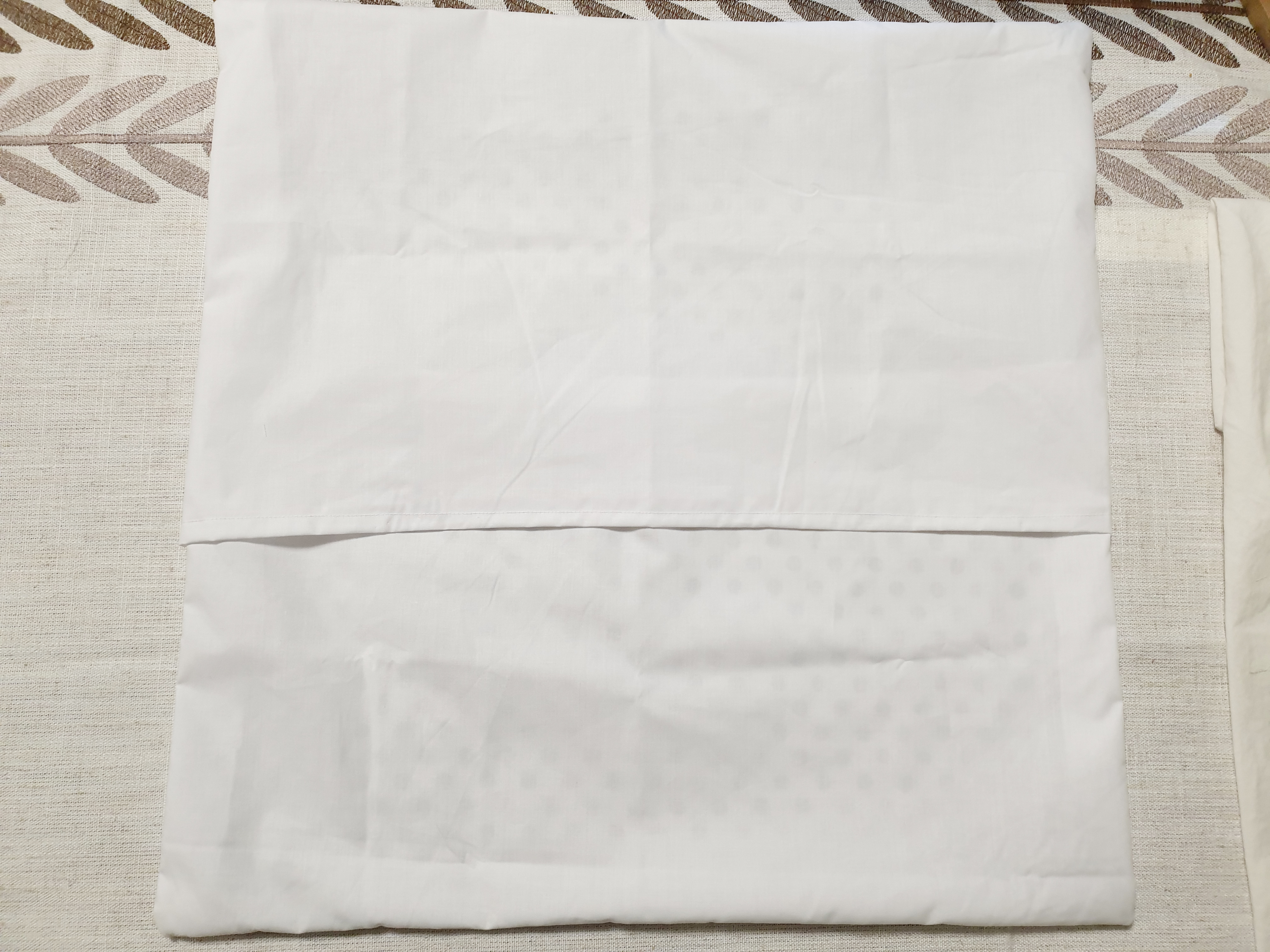 그 위에 뒷면이 될 흰 원단 2장을 접은 선이 보이 도록 둔 후 천의 끝을 잘 맞춰 줍니다.