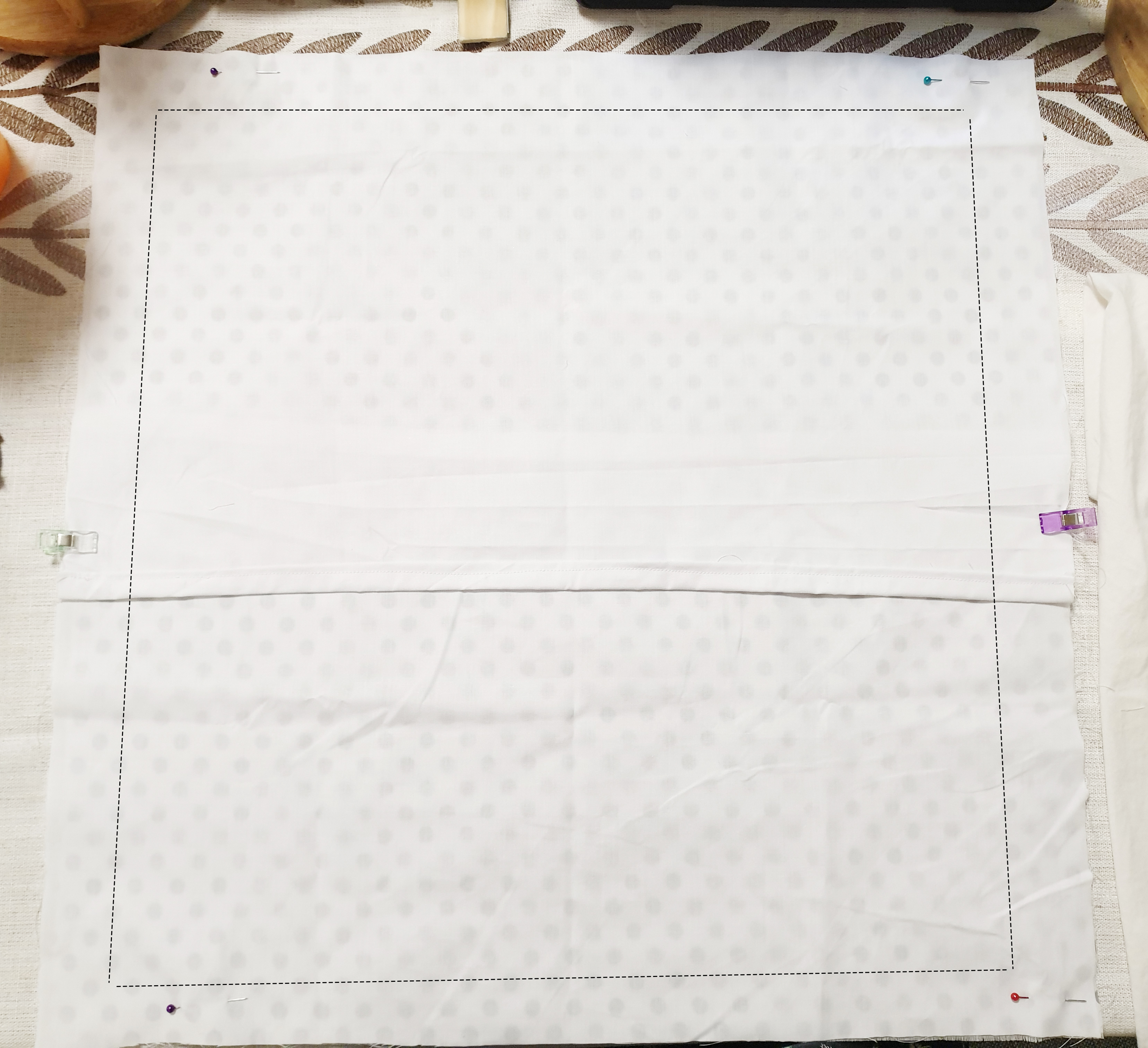 위에 사진처럼 보이도록 준비했다면 원단이 움직이지 않도록 핀으로 여러 곳을 고정해 줍니다.