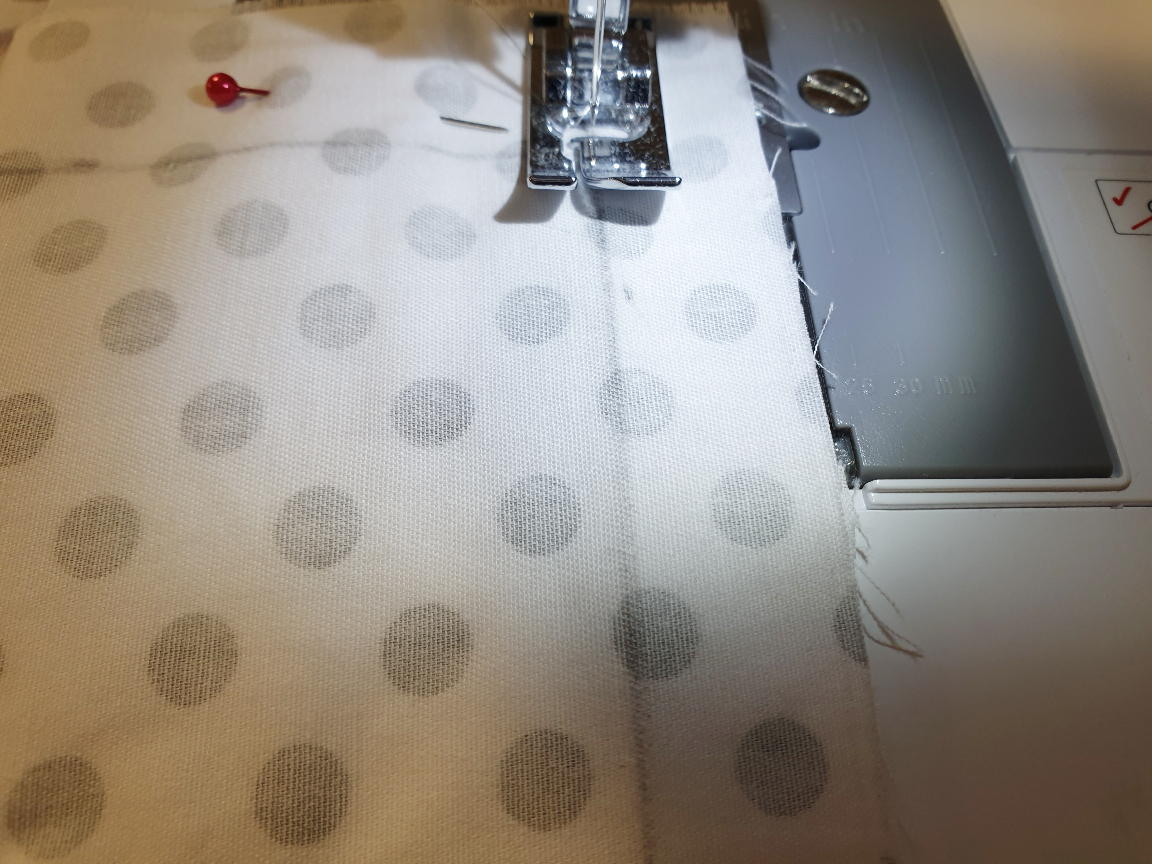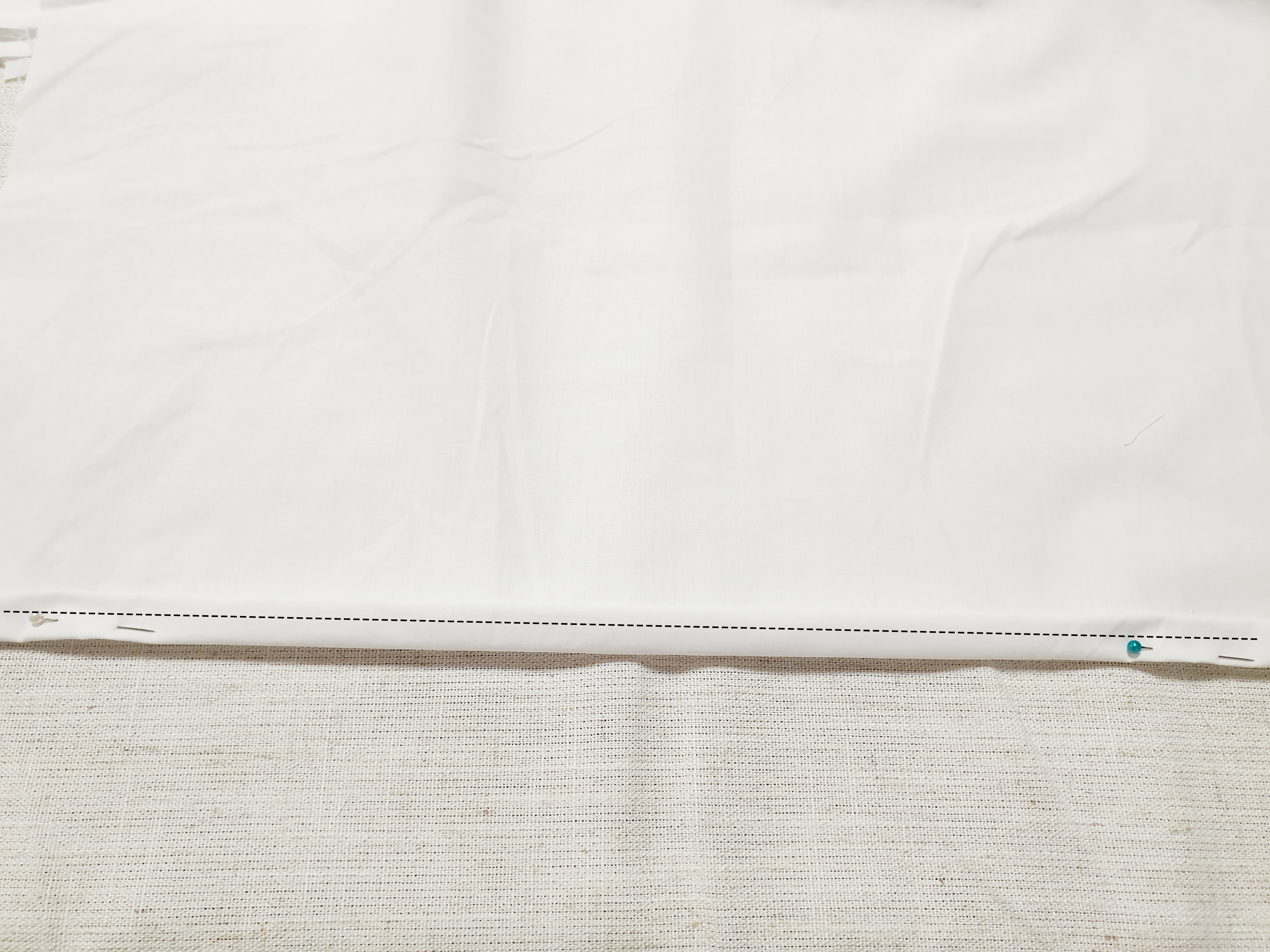 뒷면이 될 원단 2장은 아랫부분을 1CM씩 두 번 접은 후 핀을 꽂아 고정해 주세요!