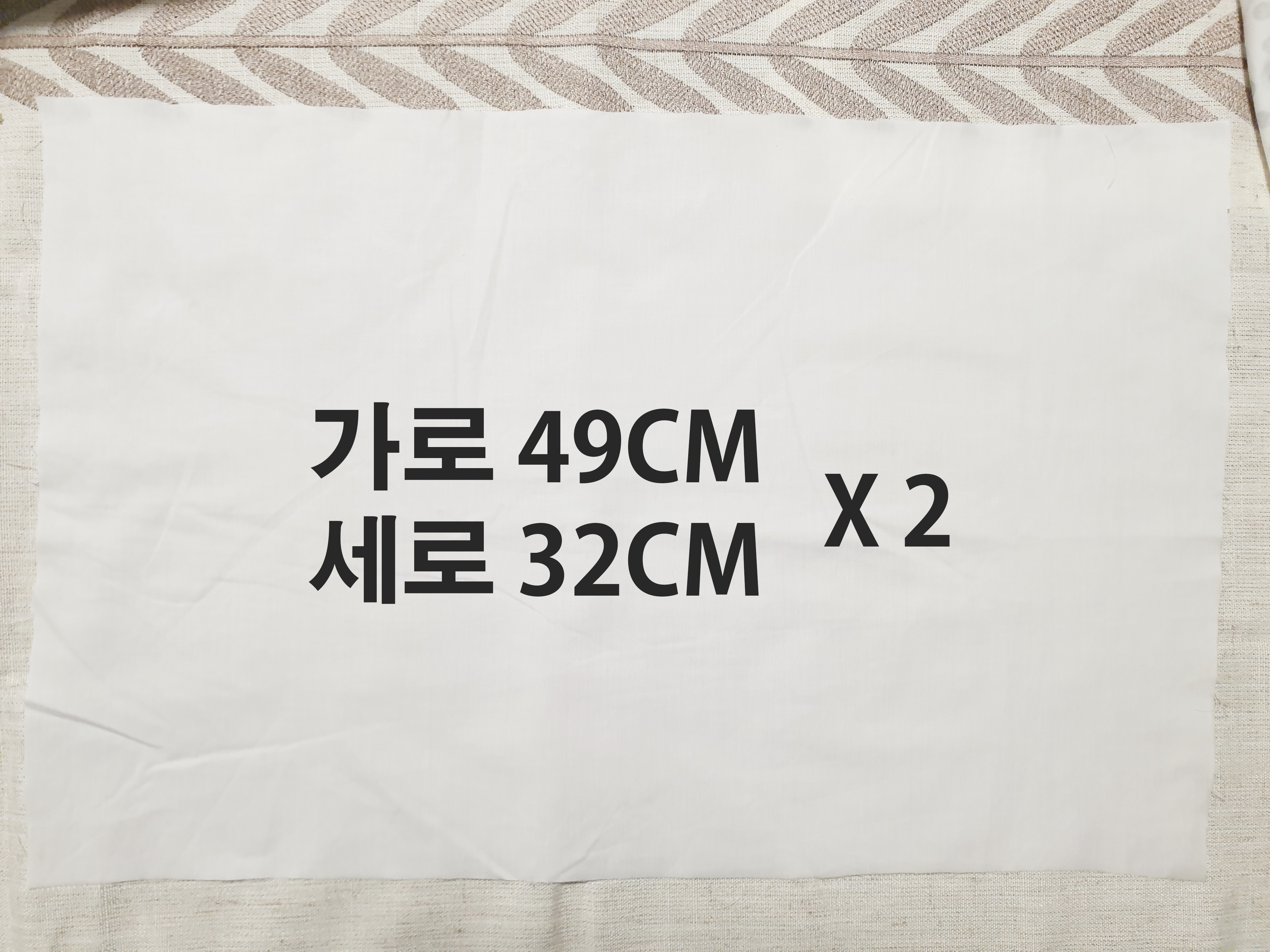 뒷면이 될 49CM X 32 CM (가로 X 세로) 원단 2장을 준비해주세요!