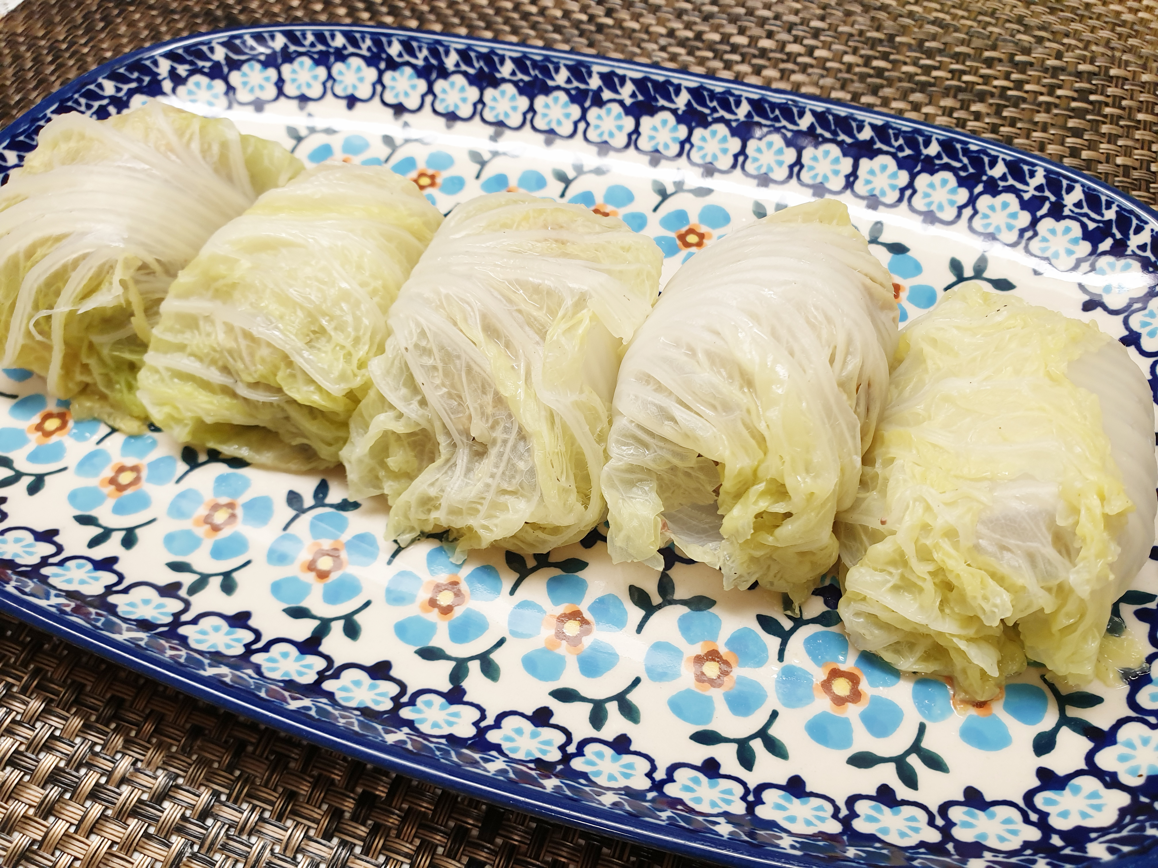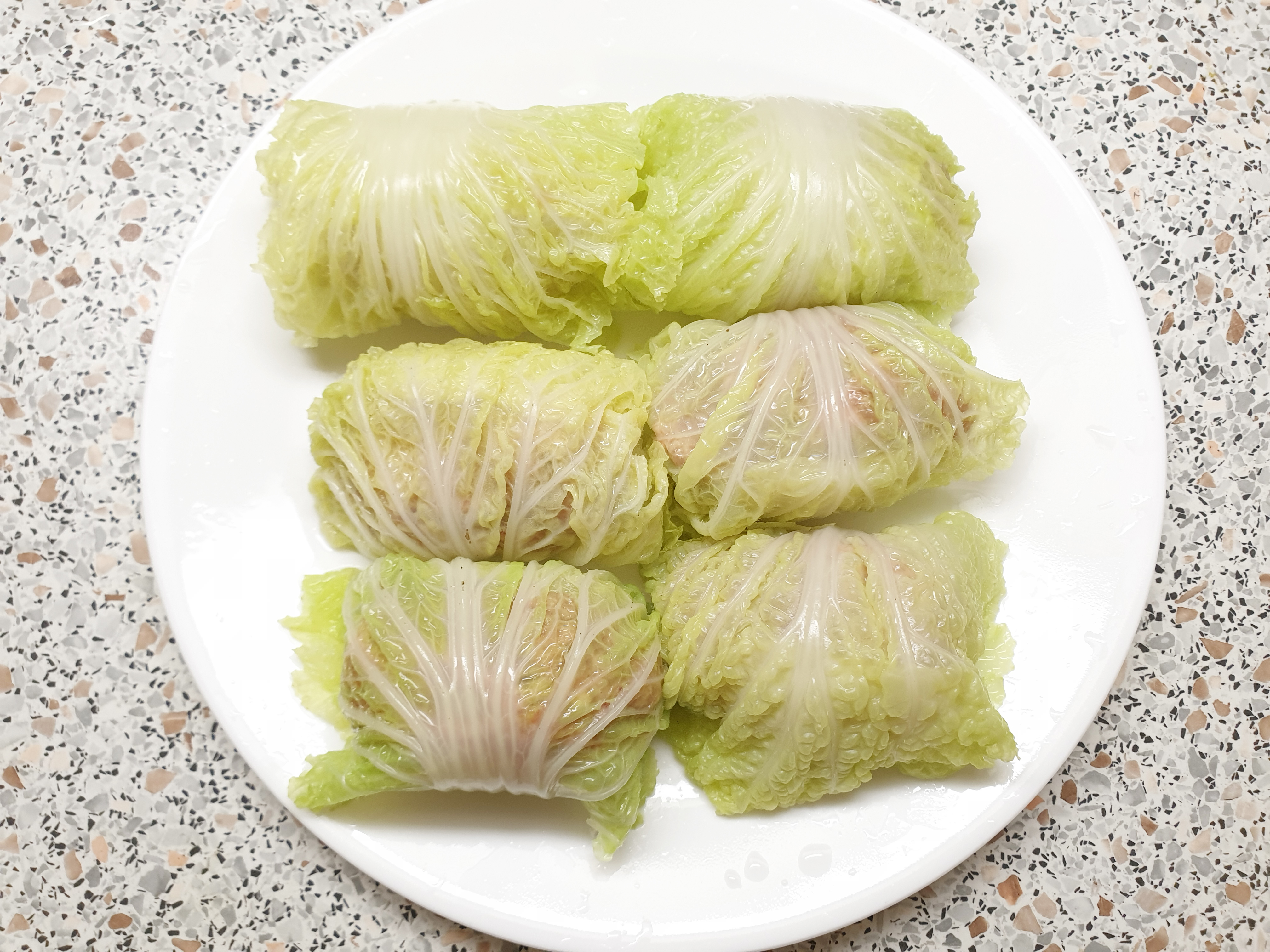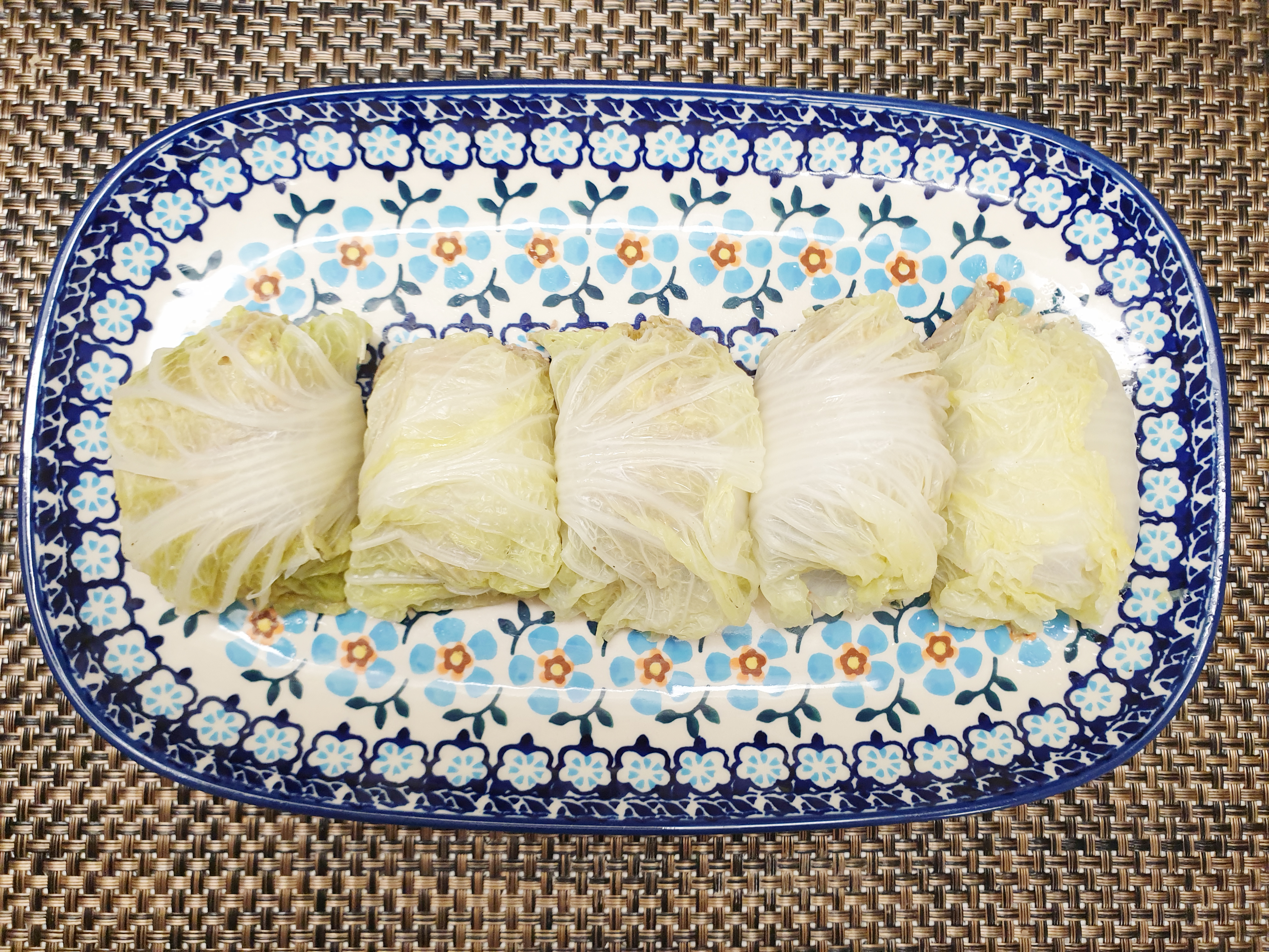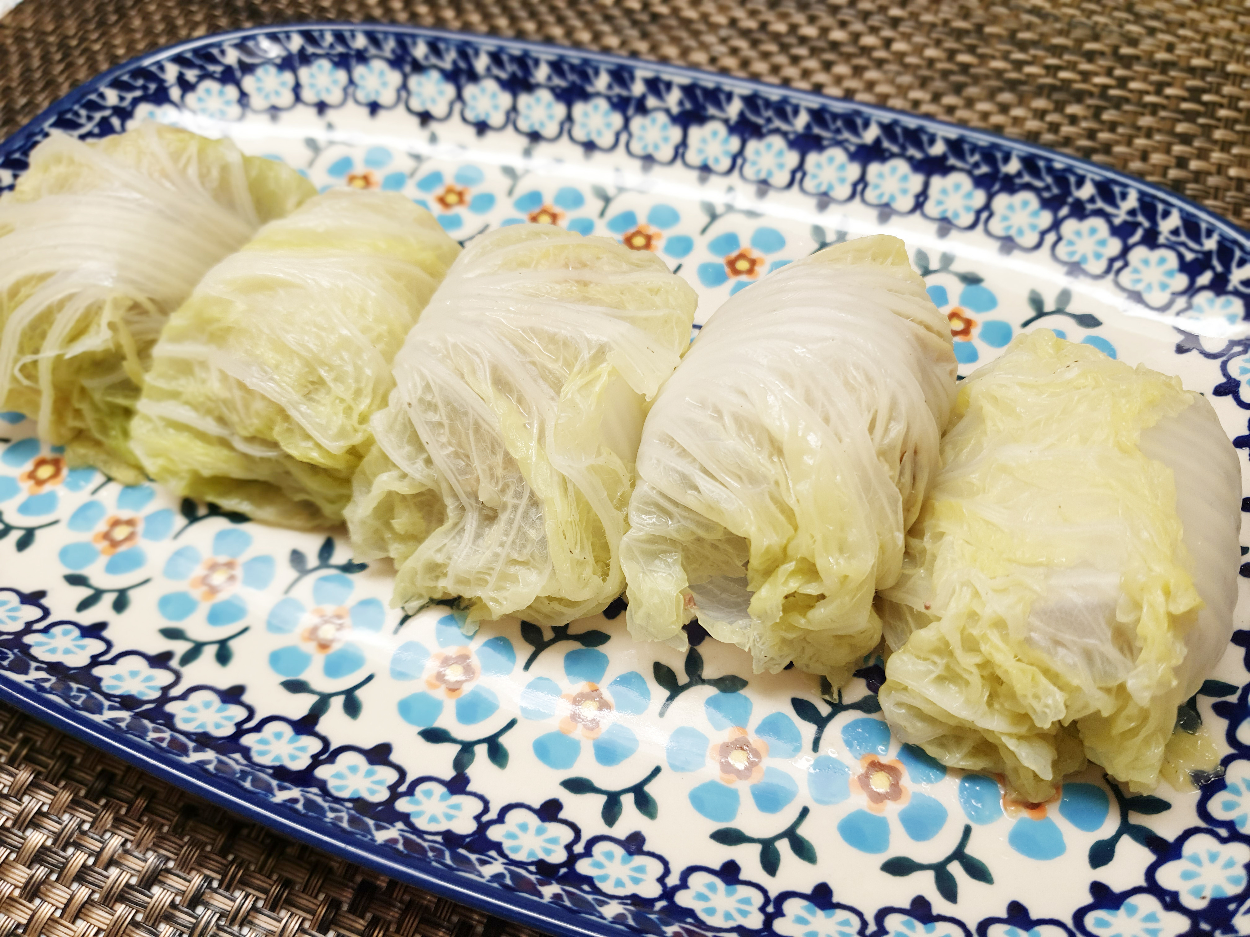 고기소와 배추가 준비됐다면 고기소를 적당한 크기로 모양을 내고 배추에 고기소를 올린 뒤 감싸 돌돌 말아주세요!