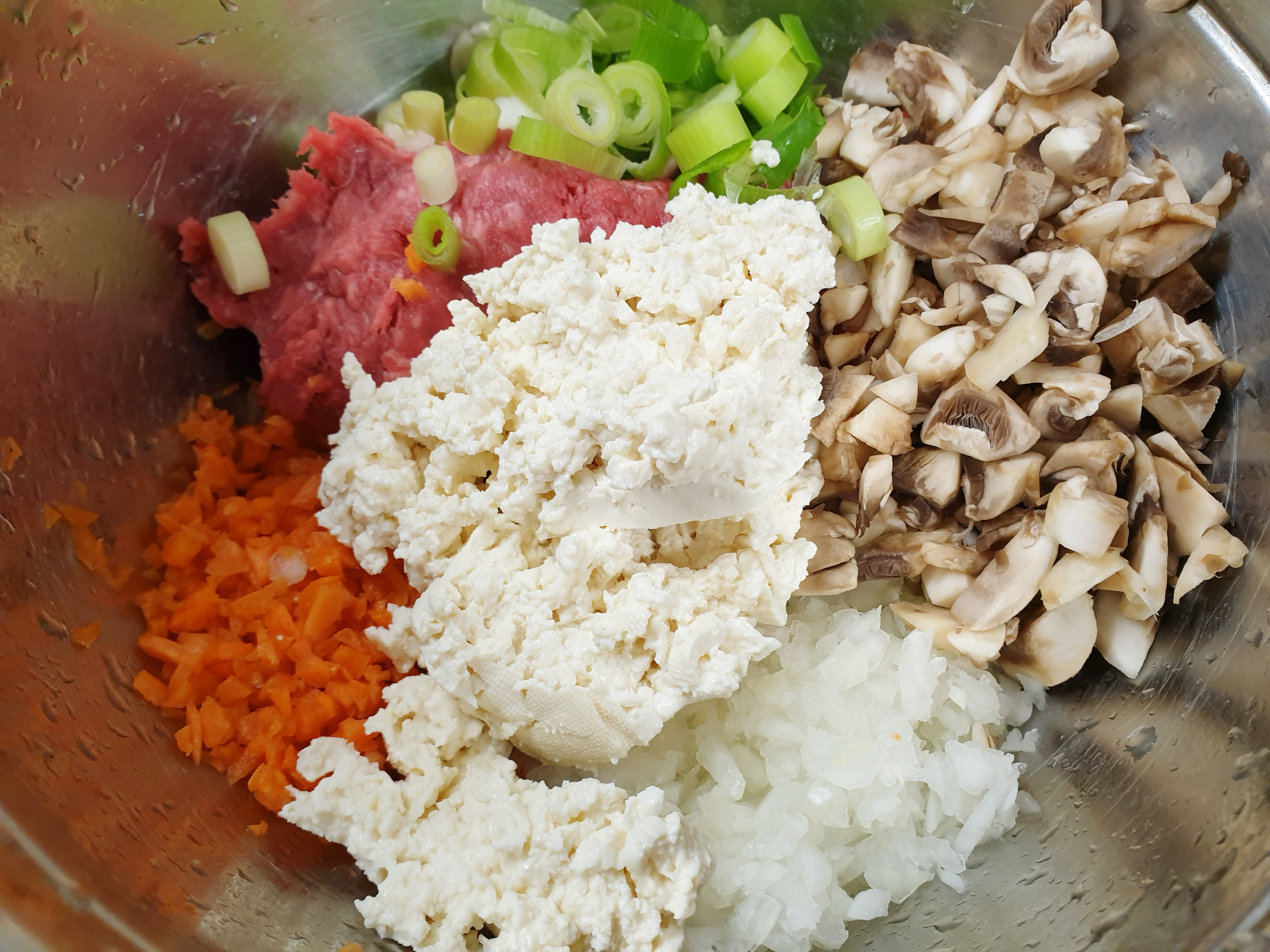 3. 재료 준비가 다 됐다면 믹싱볼에 다진 채소들, 으깬 두부, 다진 고기 250g을 넣고 소금 1 티스푼, 후춧가루 1/2 티스푼, 약간의 참기름을 넣어 열심히 치대 주면 끝!
