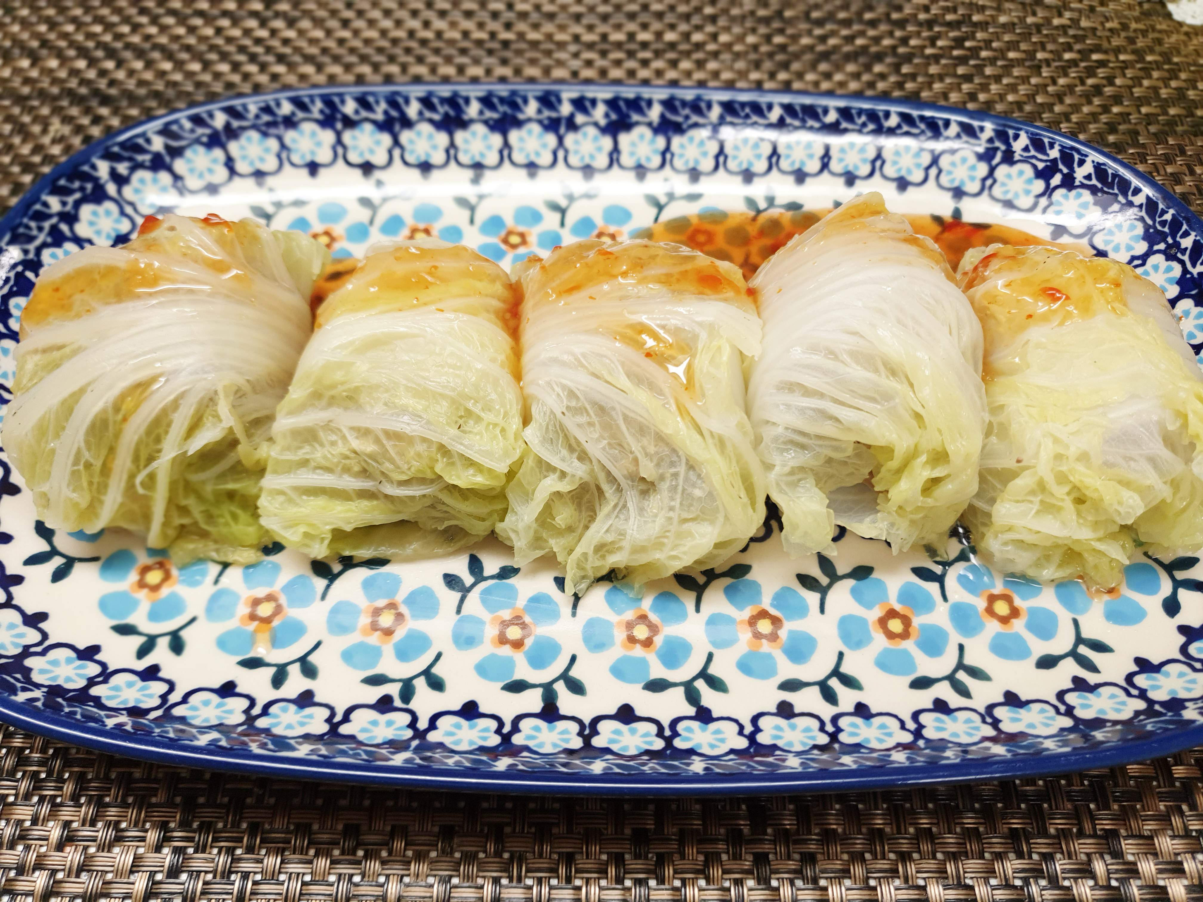 만두피 대신 배추로 감싸 담백함을 더한 배추 만두~ 배추 만두는 그냥 먹어도 맛있고 간장 양념에 찍어도 맛있지만 개인적으로 스위트 칠리소스에 찍어먹는 게 가장 맛있어요~