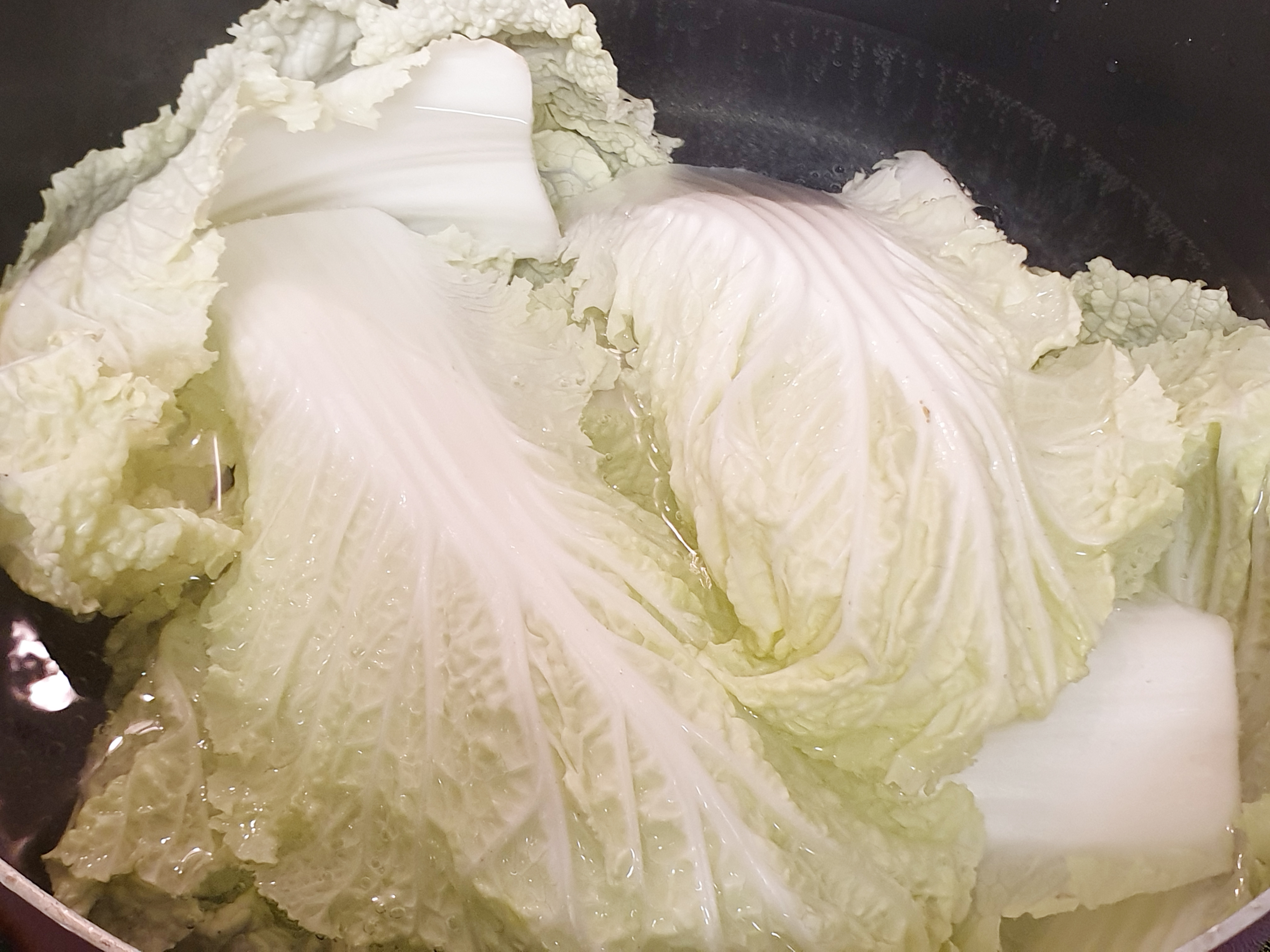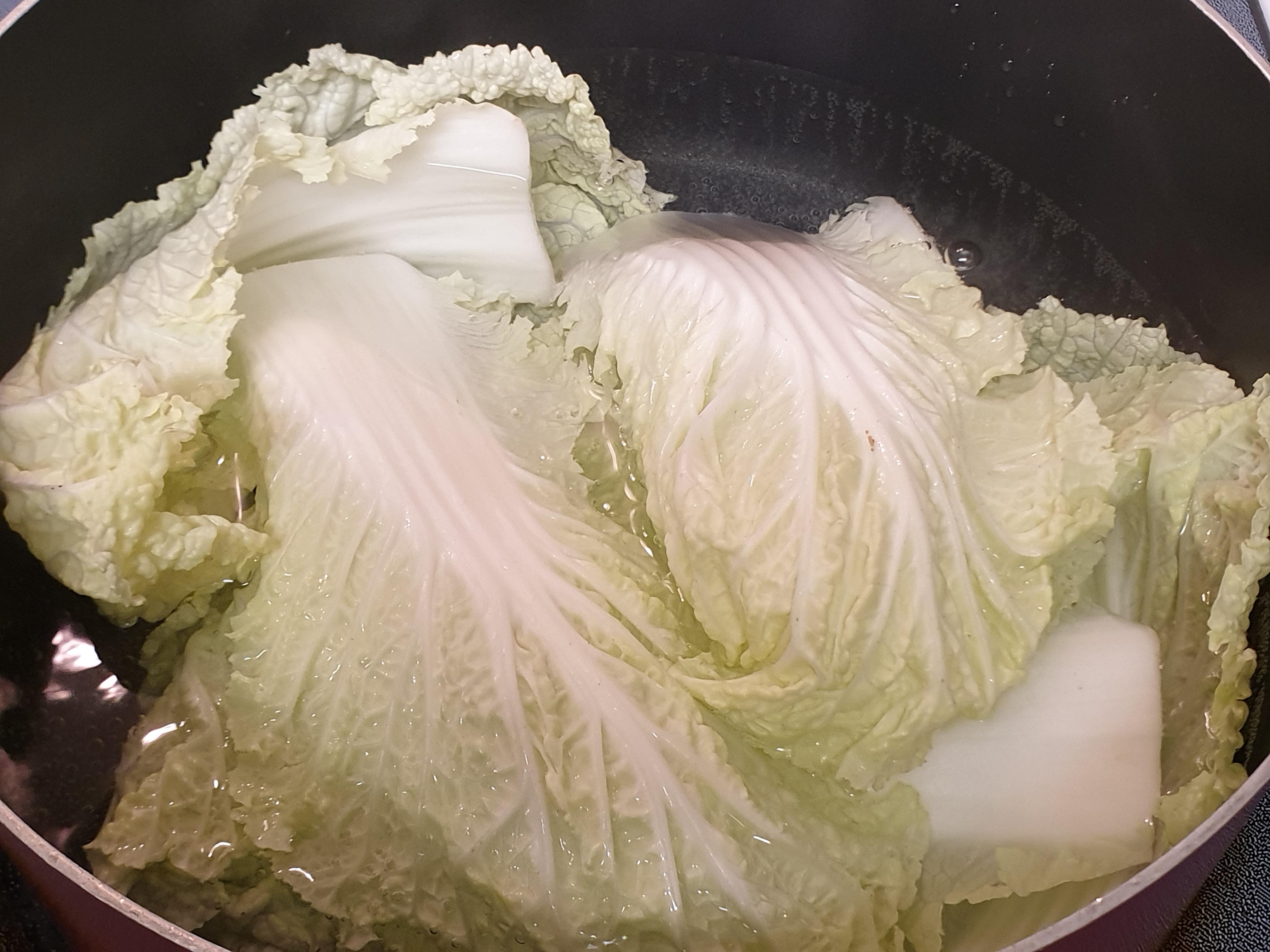 냄비에 배추가 완전히 잠길 정도의 물을 붓고 끓여 준 후 물이 끓기 시작하면 배추를 넣어 4~5분간 데쳐주세요! (배추를 너무 오래 데치지 마세요!)