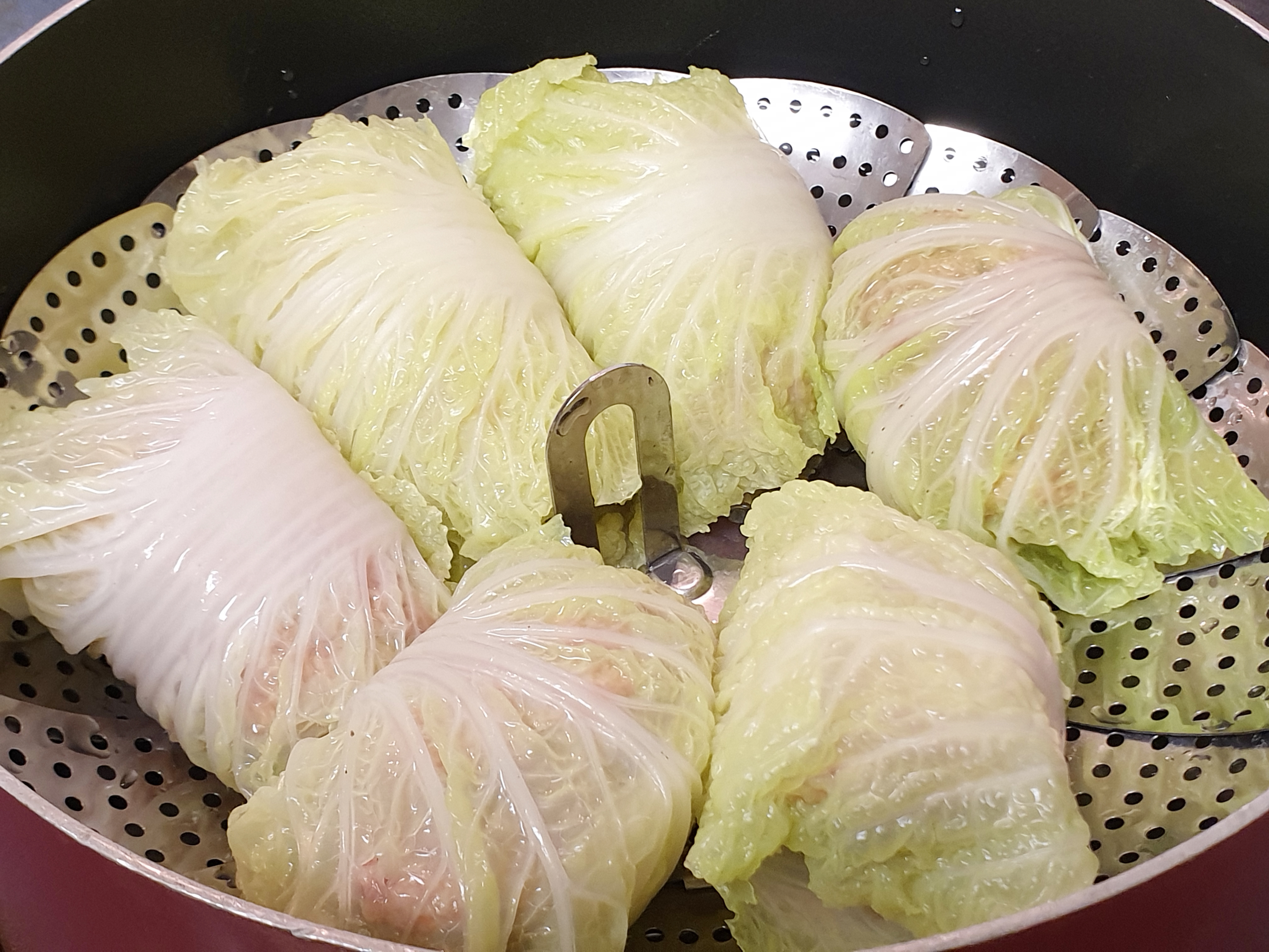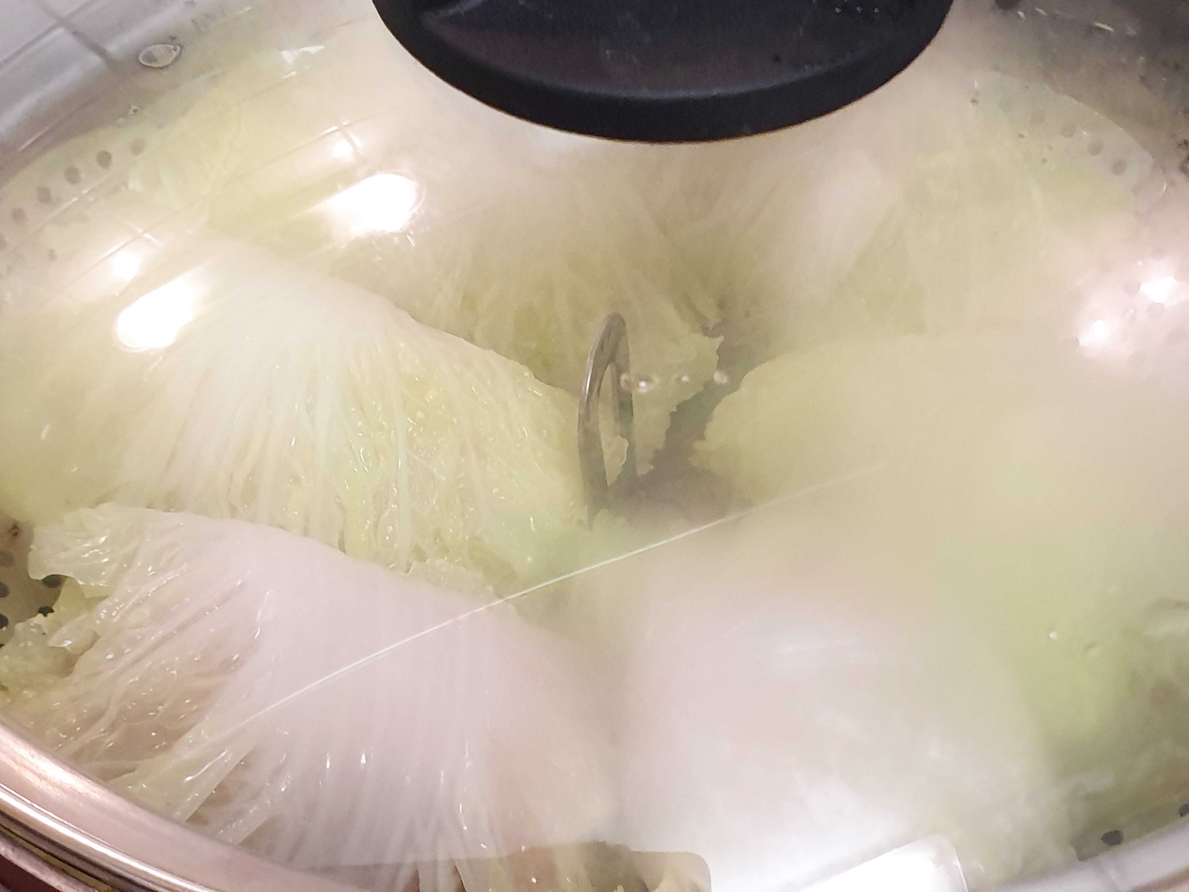 그다음 불은 중불보다 약한 불에 둔 후 찜기 또는 냄비에 찜판을 넣어 물을 붓고 김이 올라오기 시작하면 배추 만두를 올리고 뚜껑을 닫은 뒤 10~15분간 쪄줍니다.