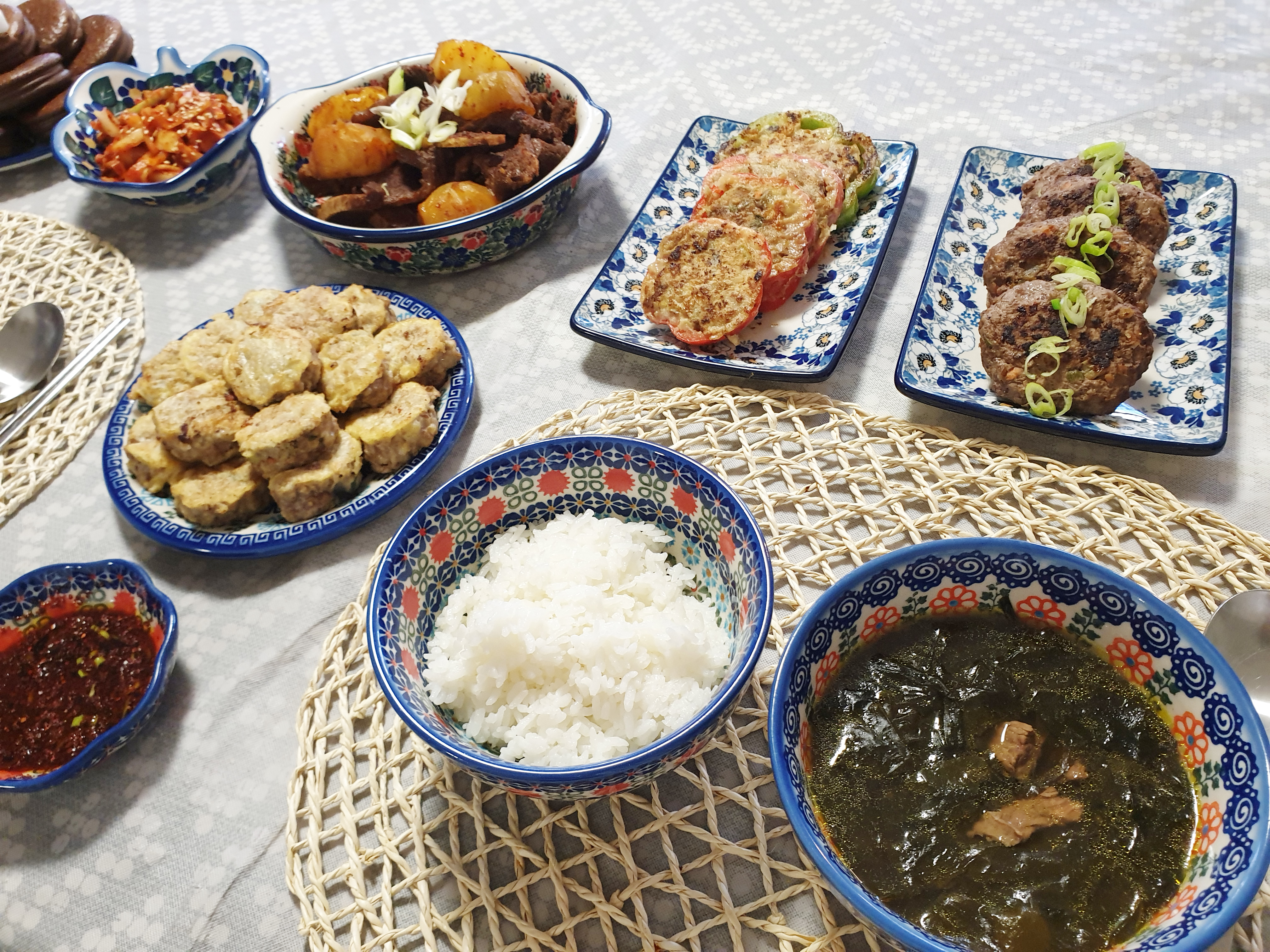 생일 때 빠질 수 없는 미역국과 느끼함을 줄이기 위한 매운 LA갈비찜 그리고 남편이 한번도 먹어 보지 못한 피망전, 동그랑땡, 떡갈비도 만들고 느끼함을 없애기 위해 양파 무침까지! 썰고 부치고 끓이고 허덕이며 열심히 남편 생일상 준비~