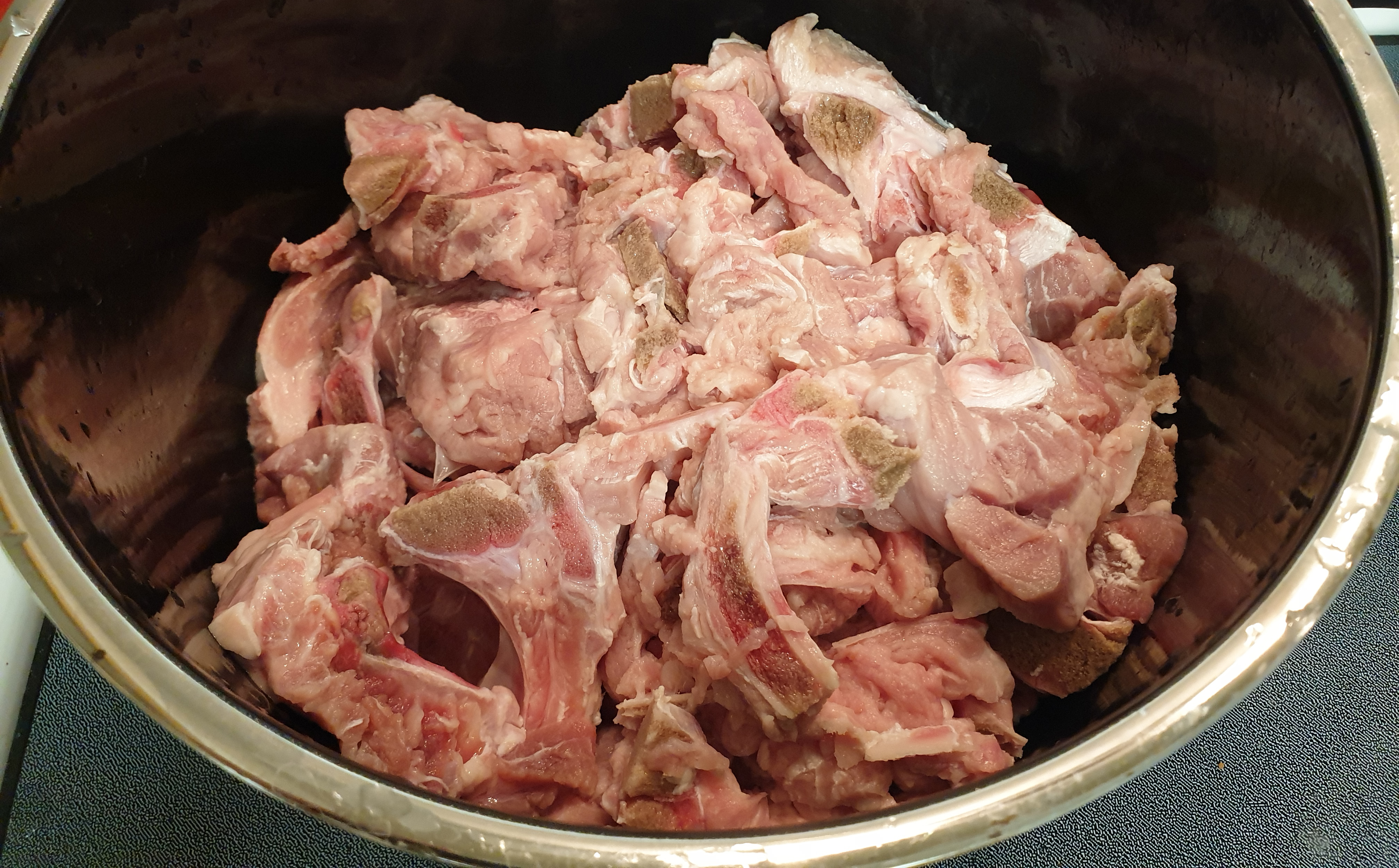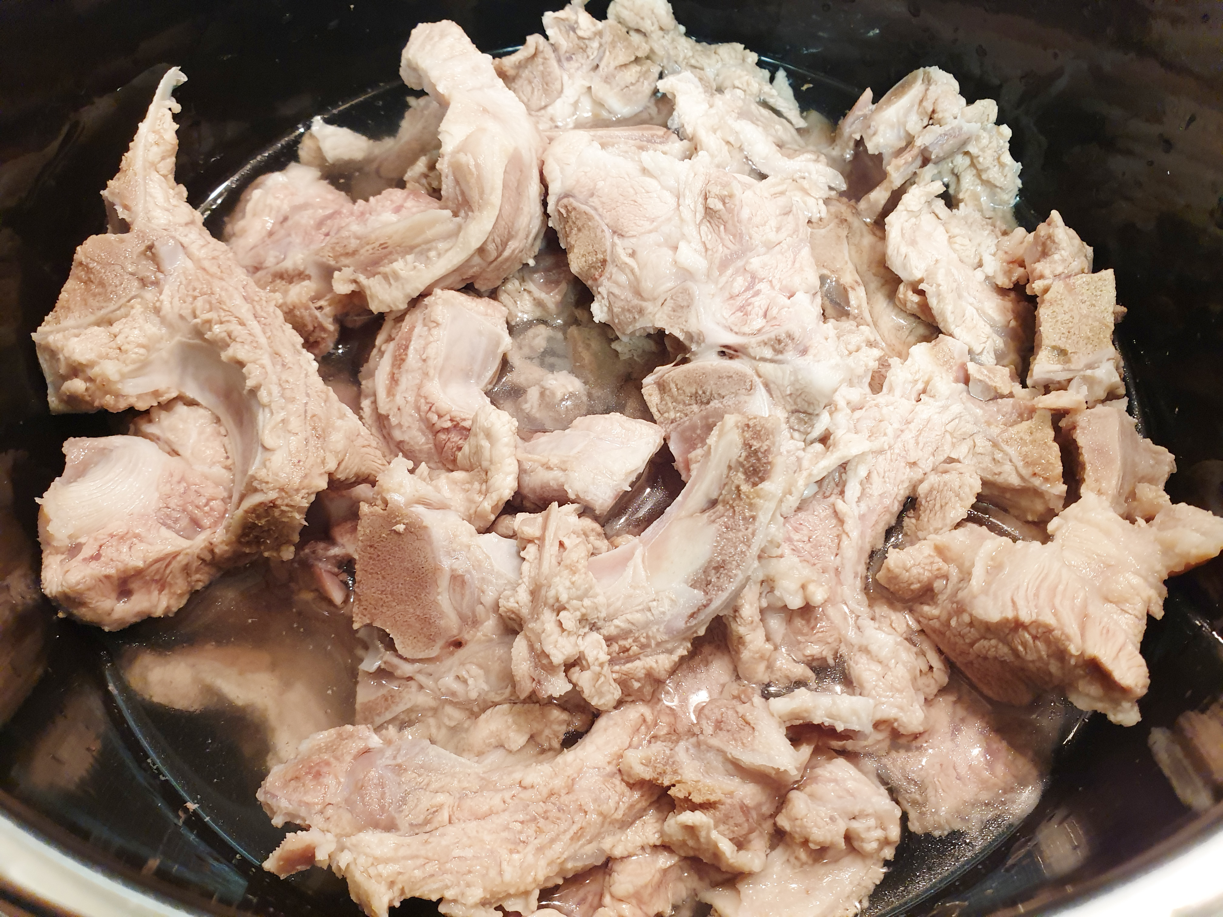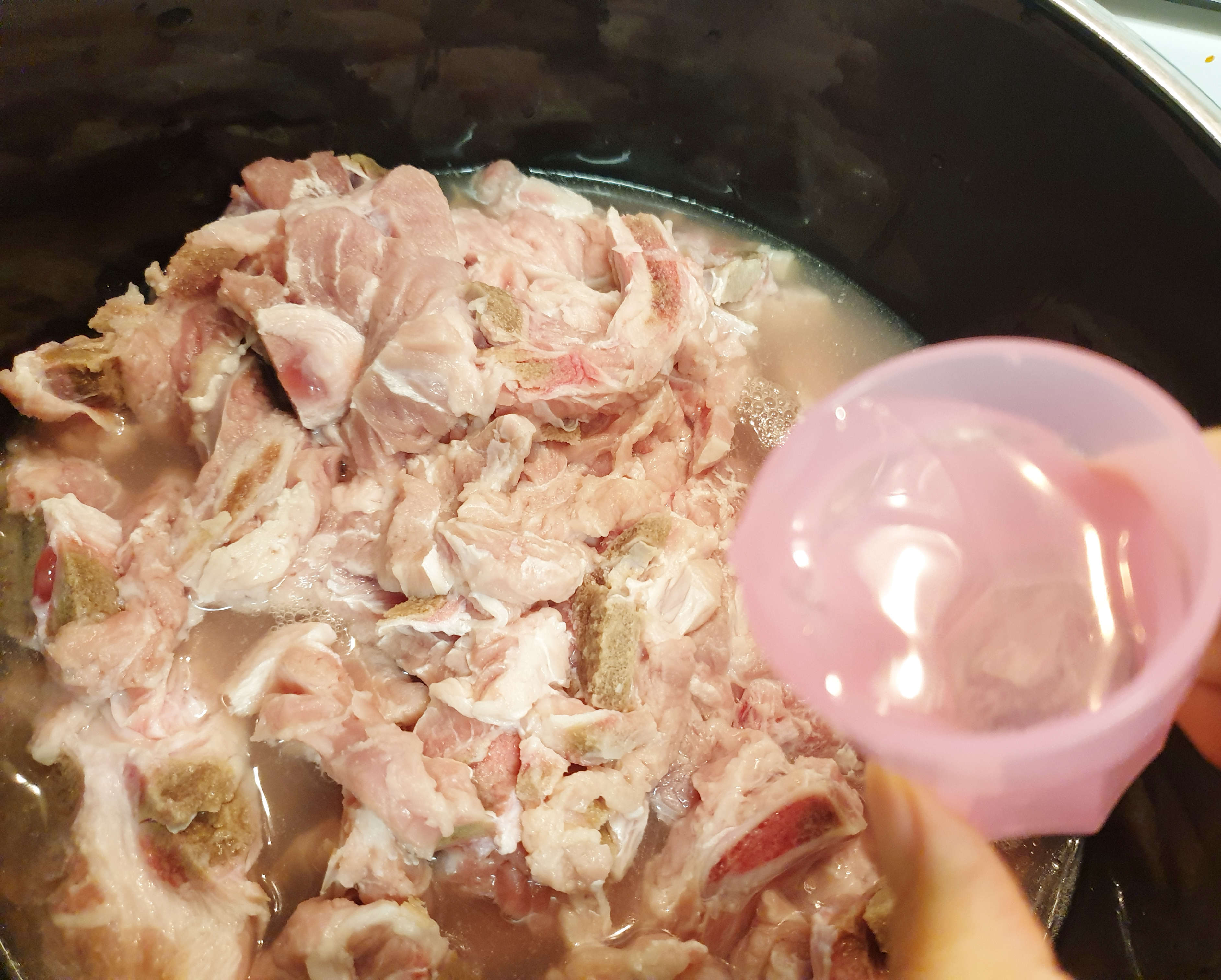 4. 냄비도 깨끗이 씻어 준비하고 불은 중불에 맞춰 준 후 돼지등뼈를 넣고 돼지 등뼈가 살짝 잠길 정도로 물을 부어 주세요~