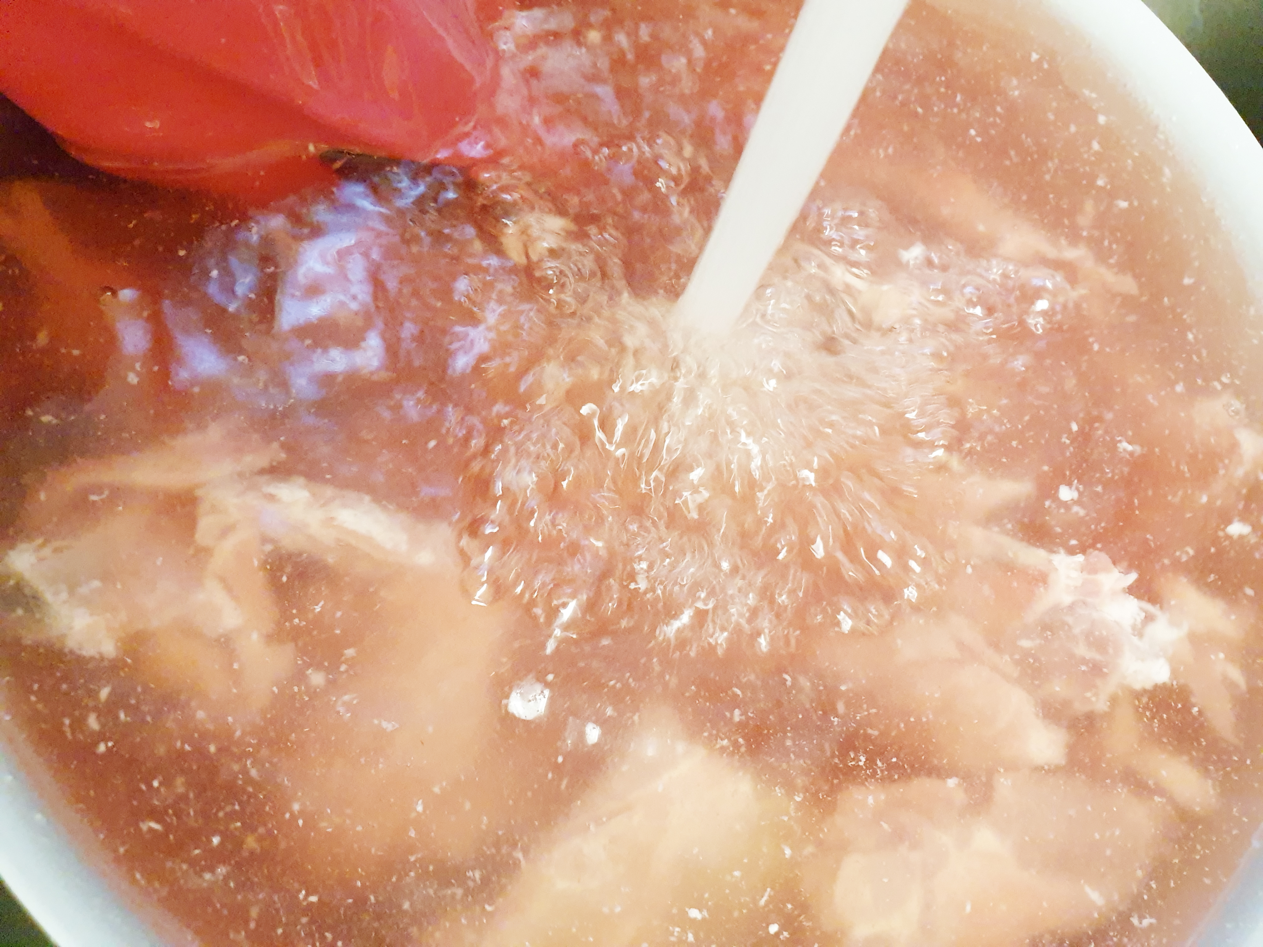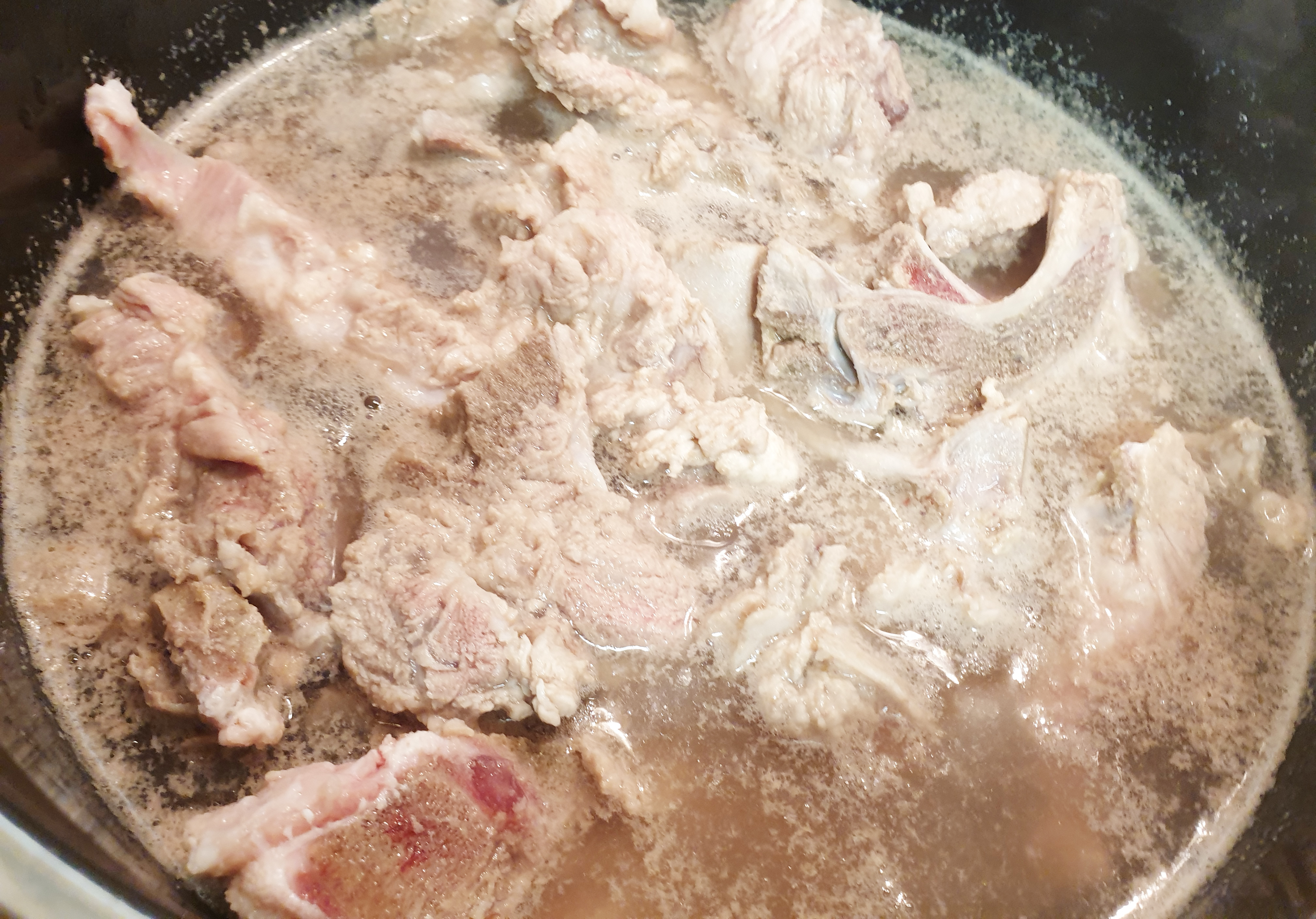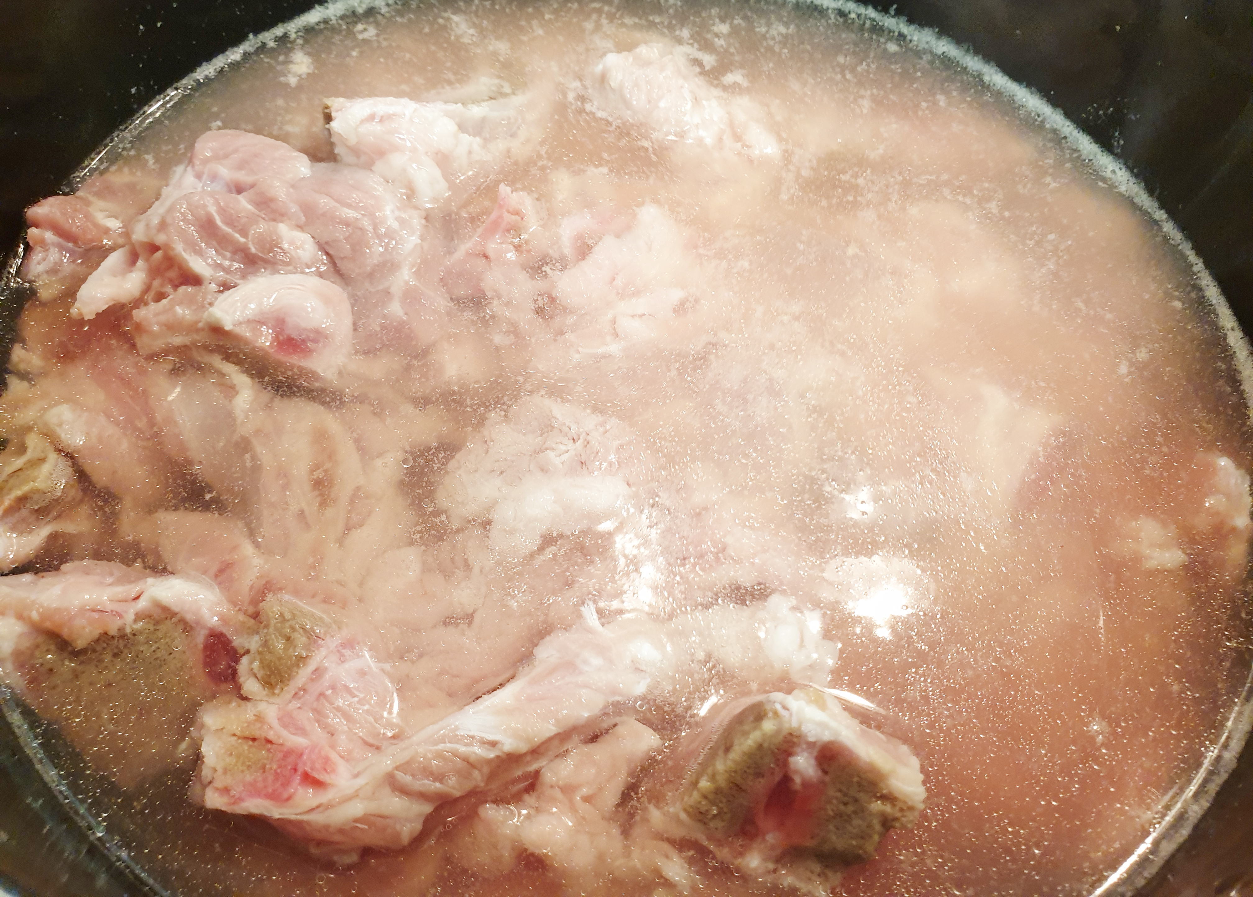 2. 그다음 큰 냄비에 돼지 등뼈를 넣고 물을 돼지 등뼈가 완전히 잠기도록 부어 준 후 맛술 또는 소주 한잔을 넣은 뒤 10분 정도 삶아 주세요! ( 핏물을 빨리 빼고 불순물과 잡내를 없애기 위해 한번 삶아 주는 게 좋아요!)