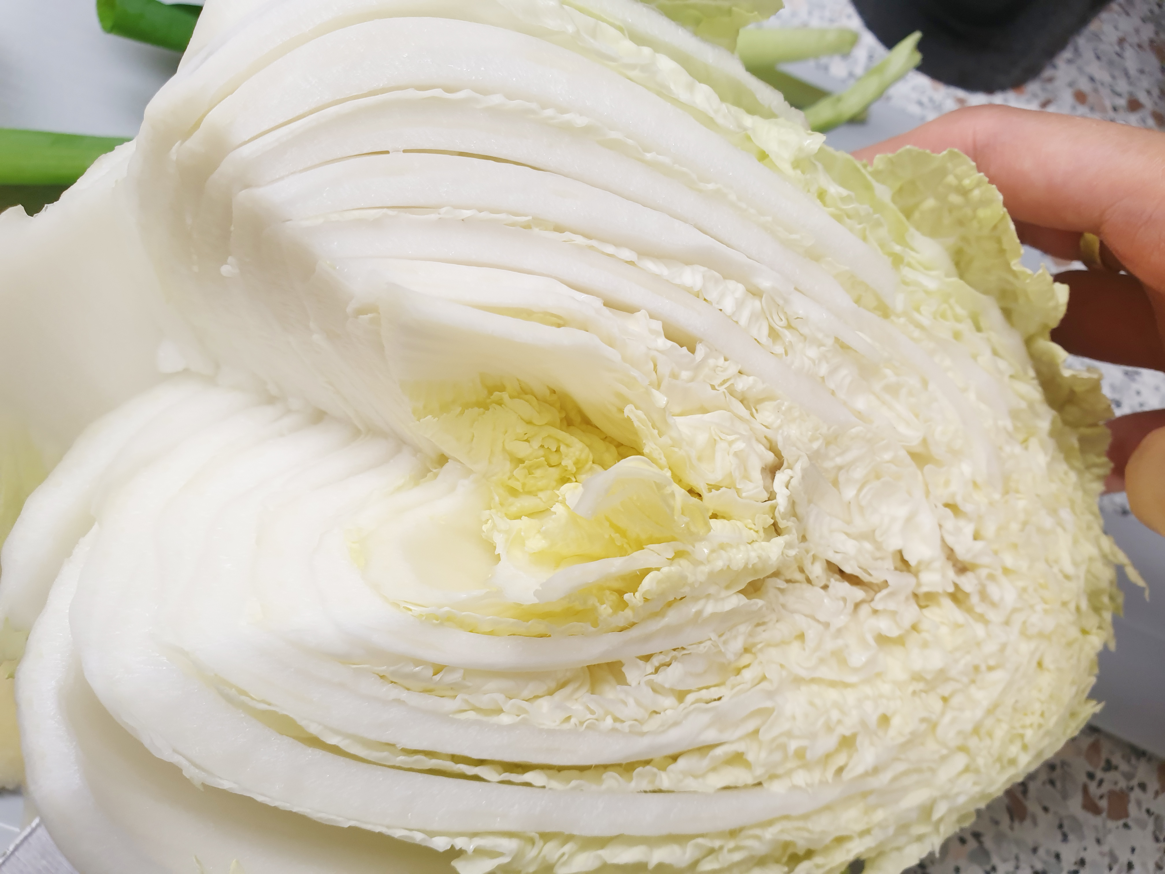배추(1포기)- 배춧잎이 잘 분리될 수 있도록 꼭지 부분을 잘라 내고 흐르는 물에 씻어 주세요!