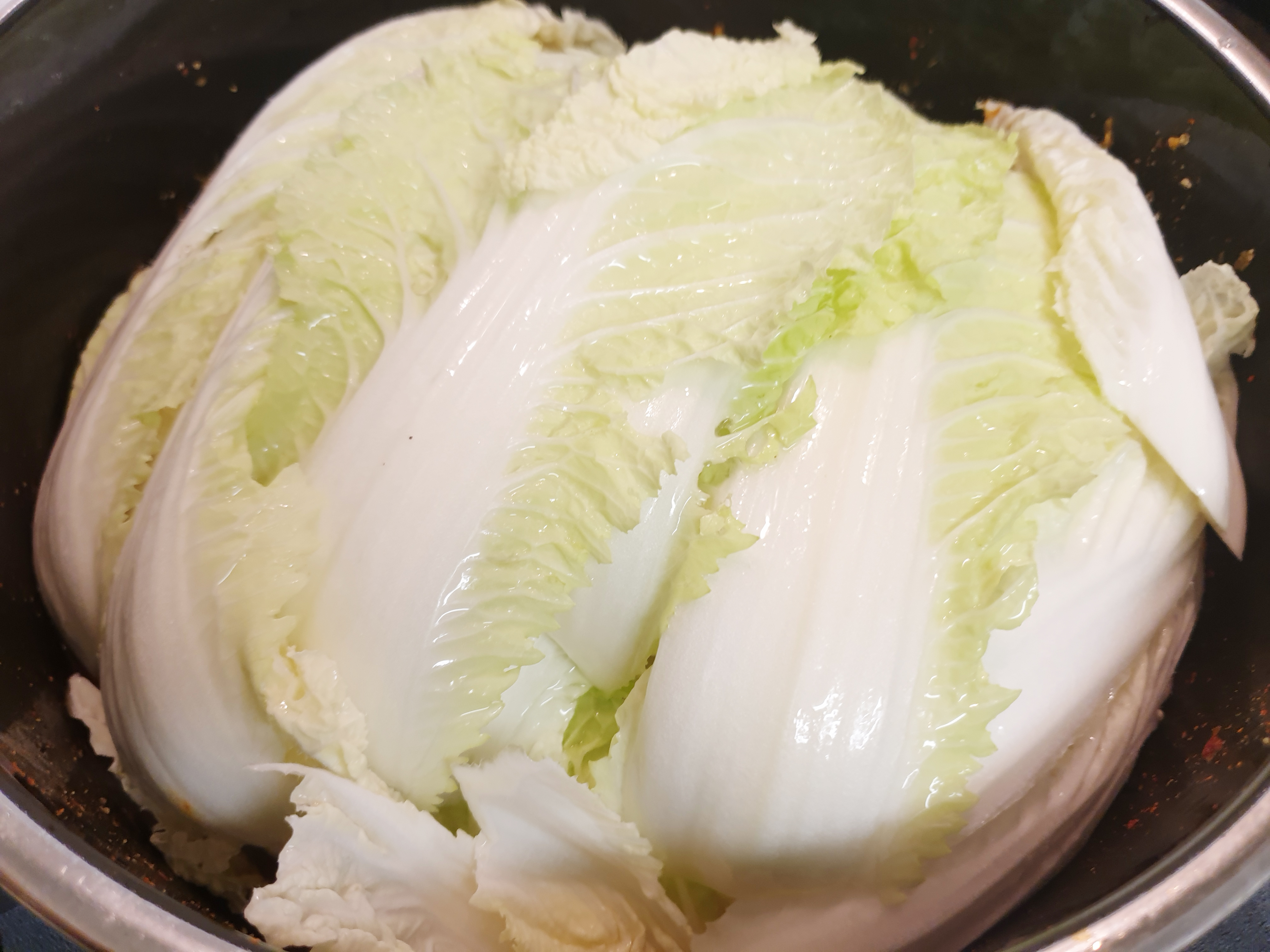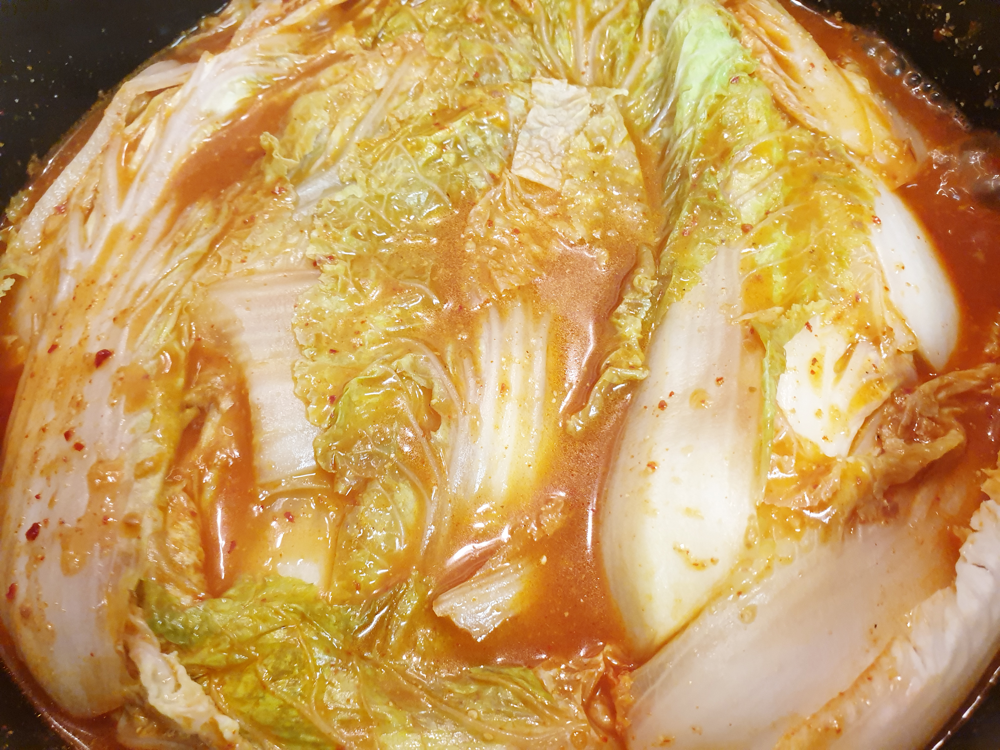 9. 그다음 배추를 넣고 배추의 숨이 죽을 때까지 약 30분간 끓여주세요~! ( 냄비 높이가 낮아 배추가 다 안 들어가면 배추 숨이 죽으면 배추를 추가해 넣어 주고 다시 숨이 죽을 때까지 끓여 주면 됩니다. )