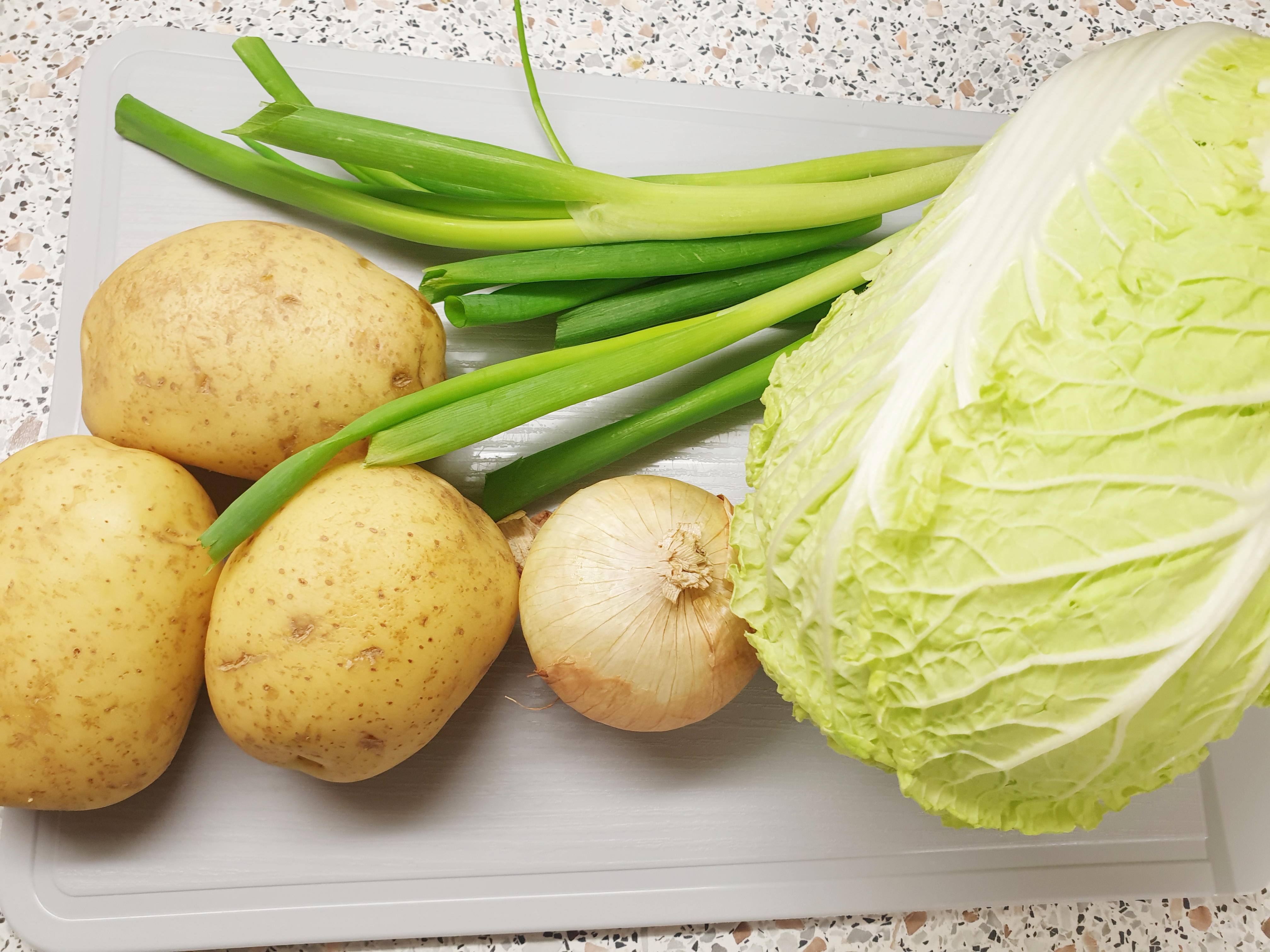 필요한 재료 (감자탕 4인분 기준) : 돼지 등뼈 1.5~2kg , 감자 3개 , 대파 1대 , 양파 1/2개 , 알배추 1포기 (작은 사이즈)
