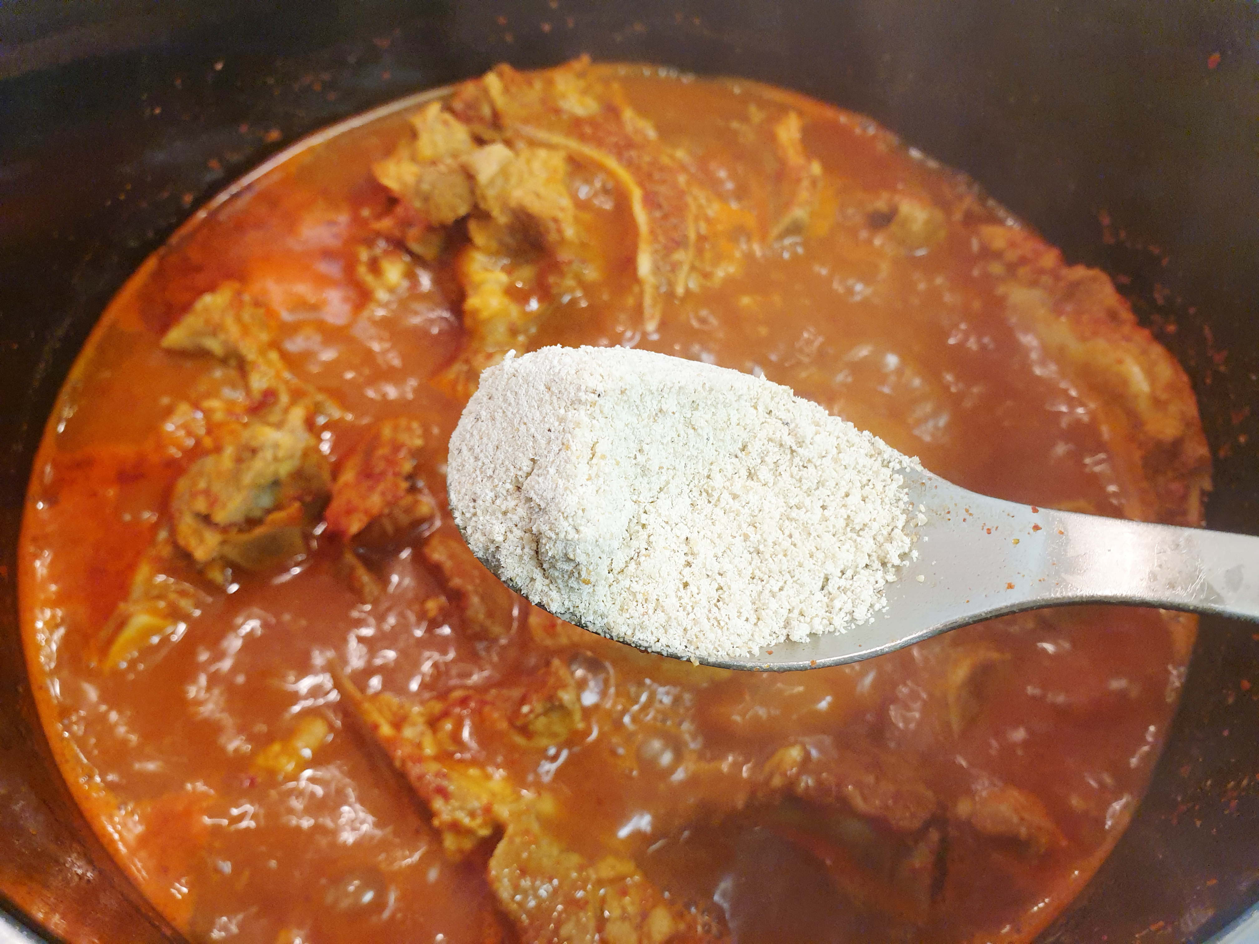 8. 채소가 준비됐다면 불을 줄여주고 취향에 따라 들깻가루 3~5큰술을 넣어 줍니다.