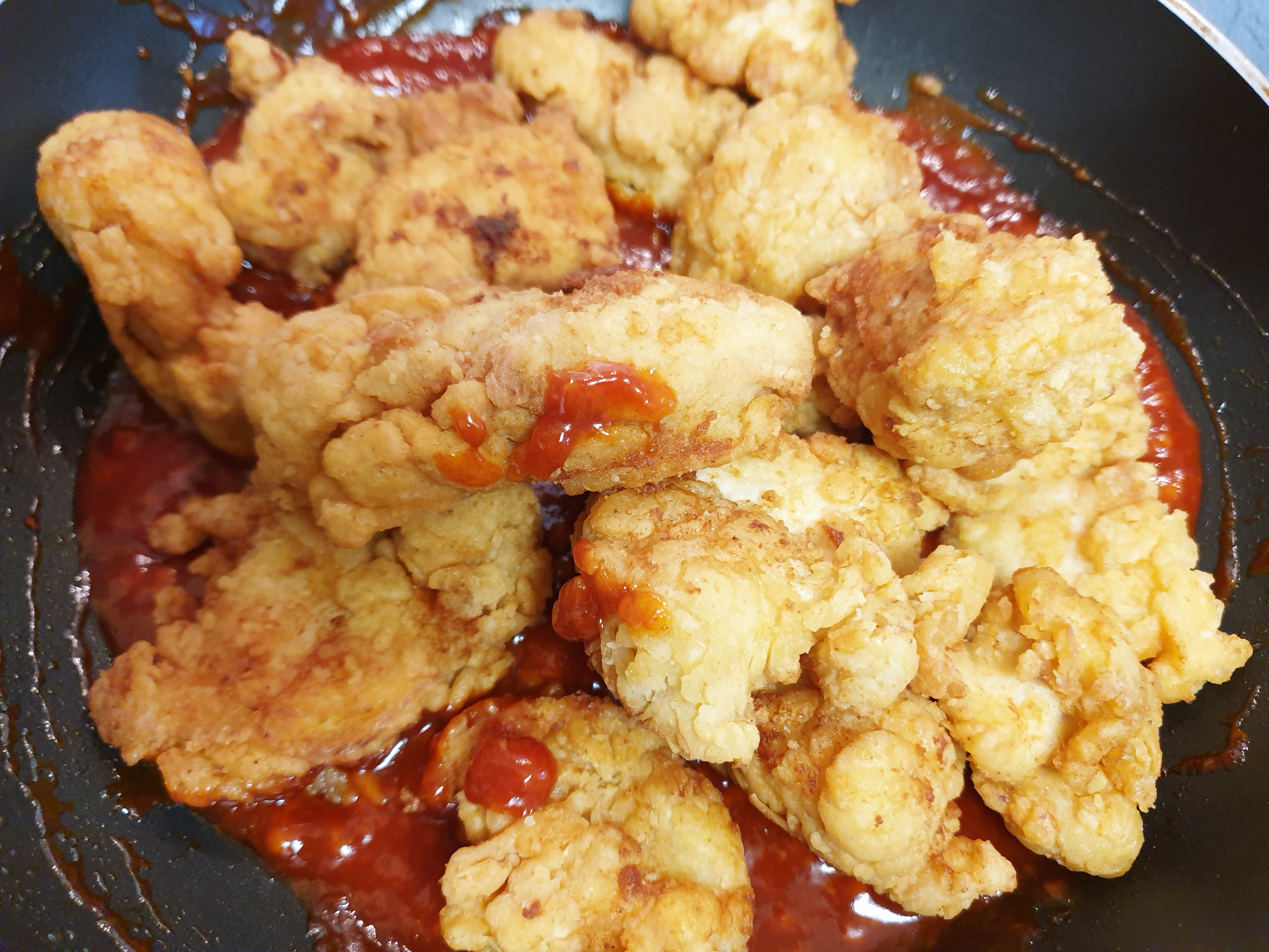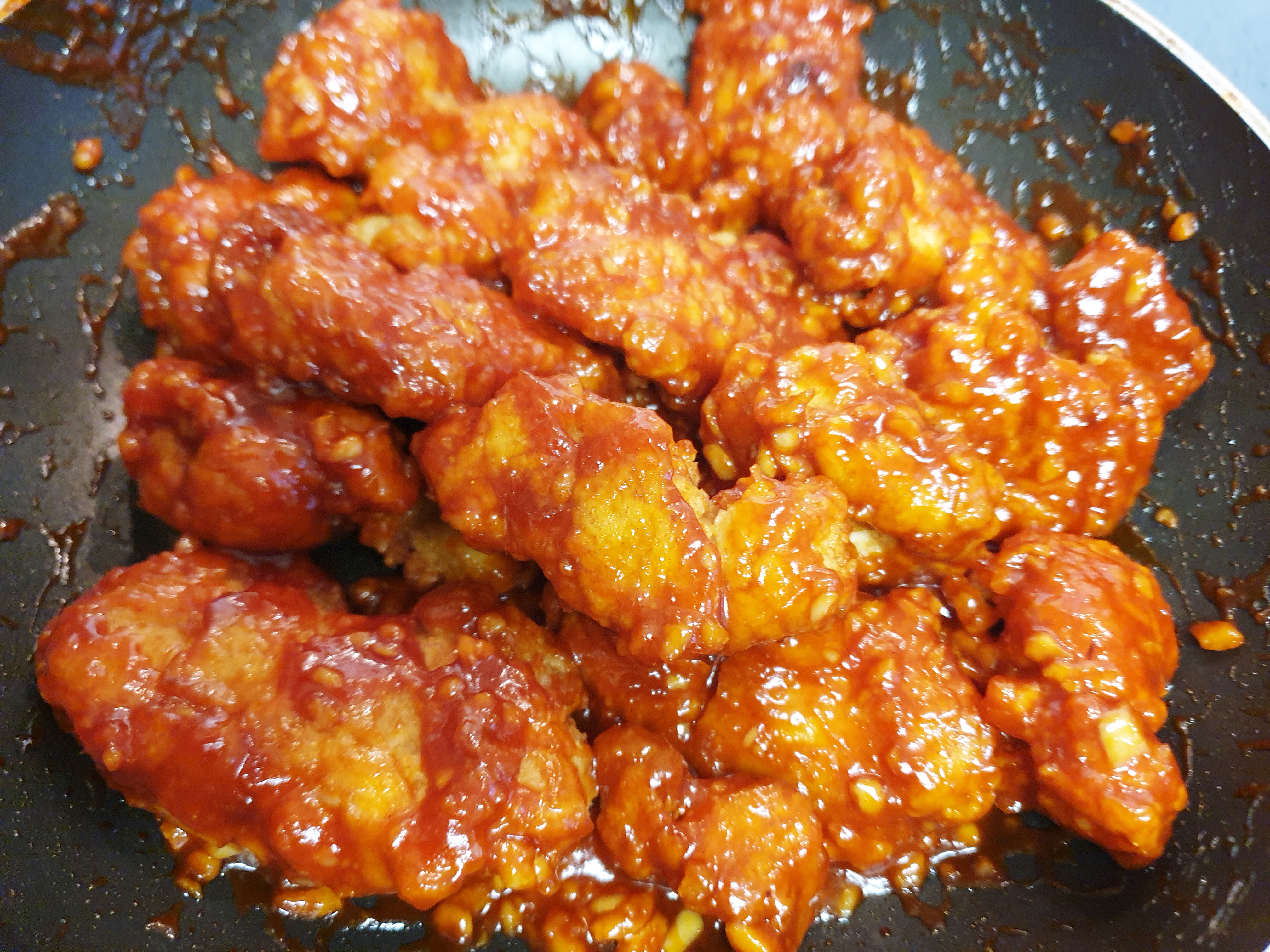 9. 양념 치킨 소스가 끓을 때쯤 튀긴 닭을 반 정도 넣고 골고루 버무려 주면 끝!