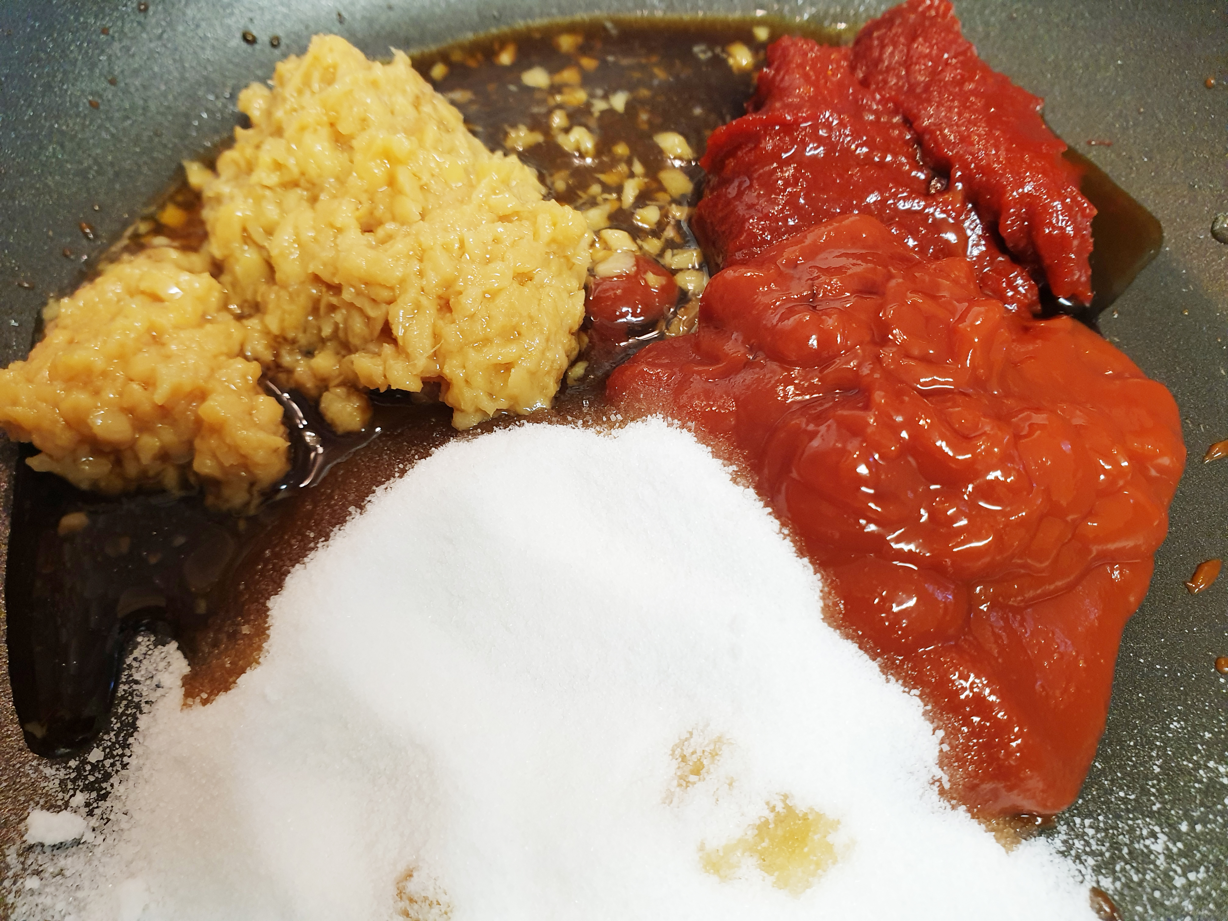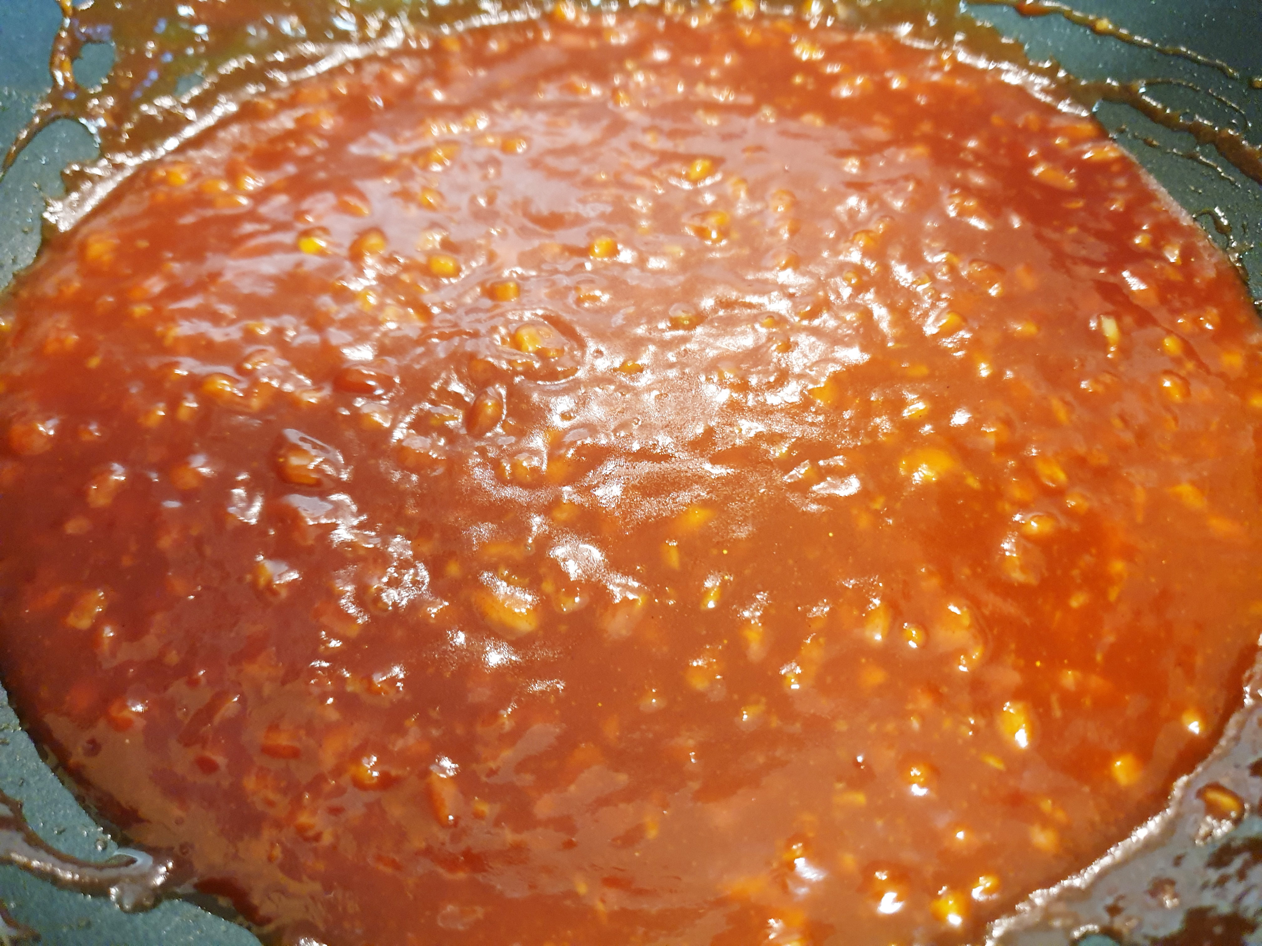 8. 프라이팬을 준비하고 약불에 맞춘 후 고추장 1큰술 , 케첩 3스푼 , 설탕 3큰술 , 간장 1큰술 , 물 2큰술 , 다진 마늘 1큰술 , 볶음 깨를 넣고 잘 저어 줍니다.