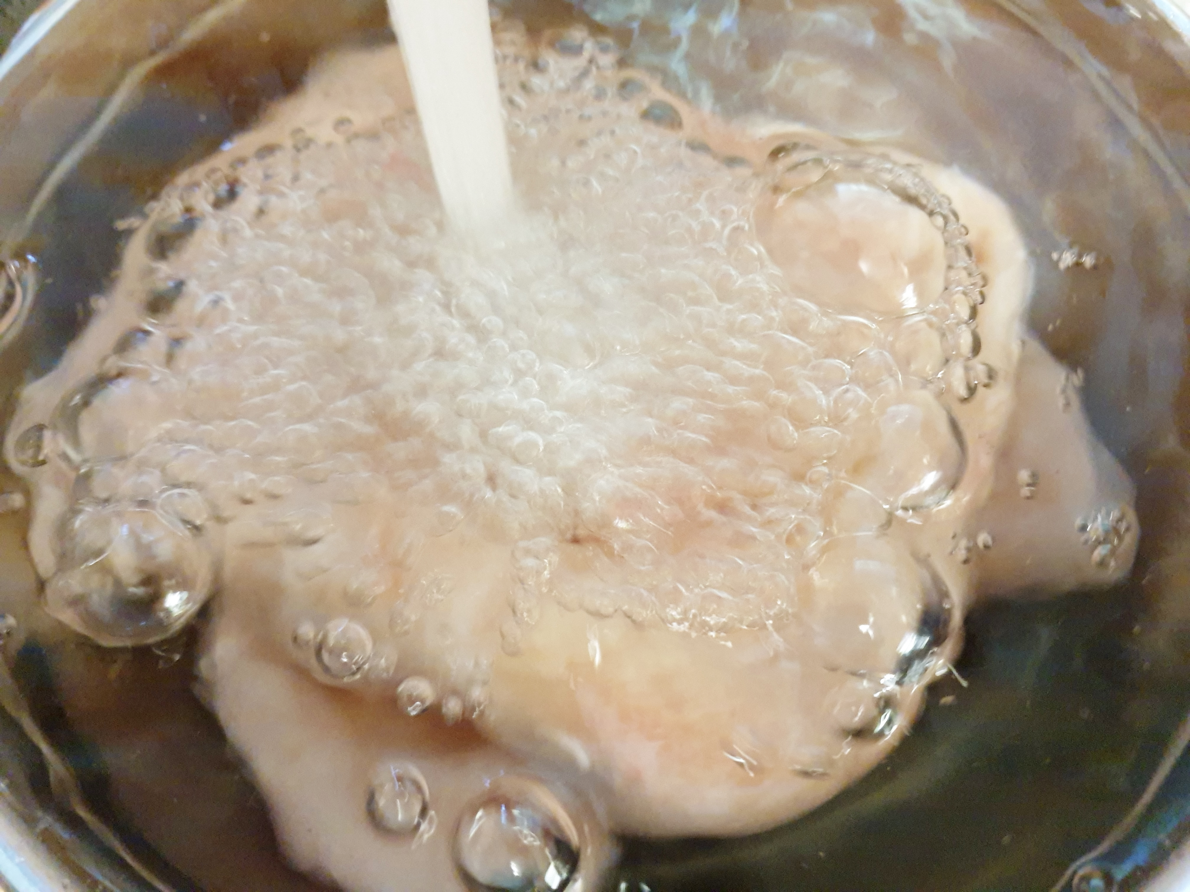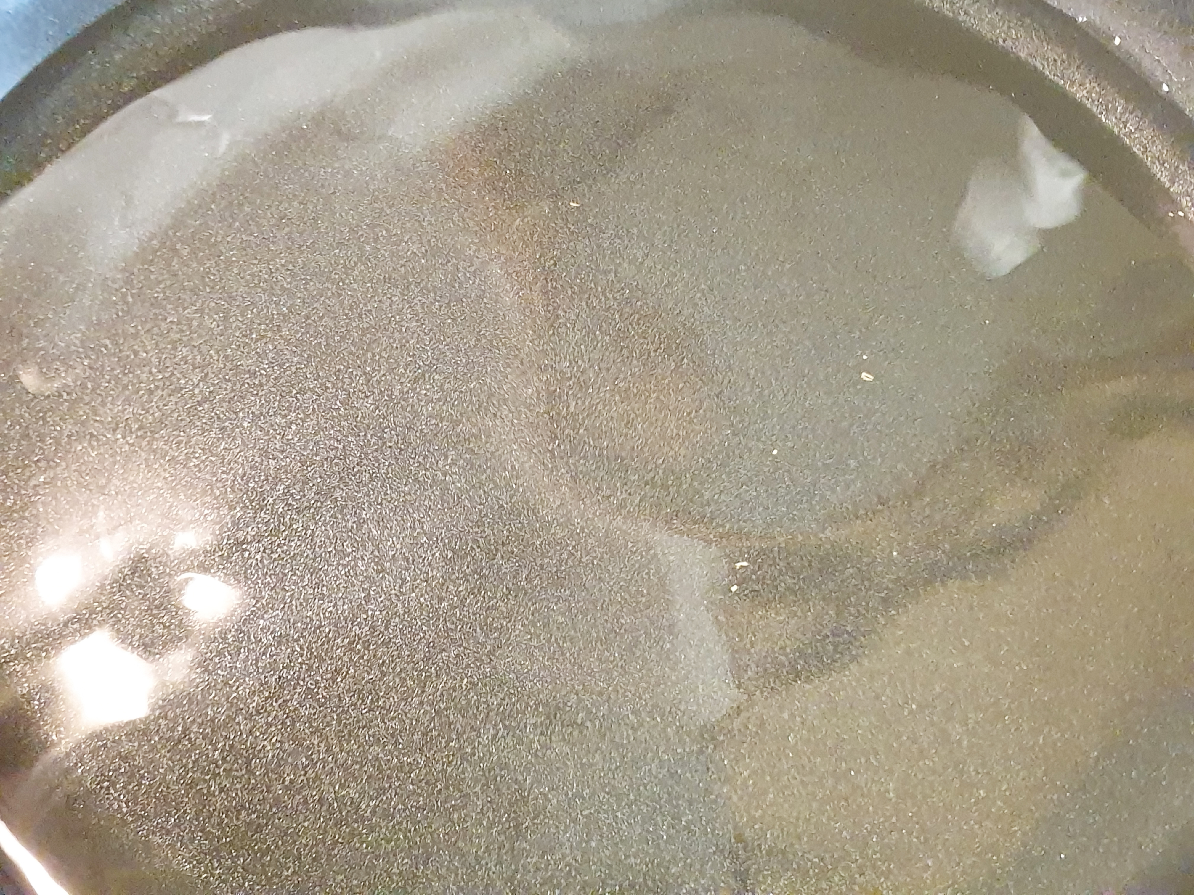 5. 웍이나 프라이팬에 식용유를 충분히 부어 주고 중불보다 센불에 둔 뒤 기름을 달궈 줍니다. 기름 냄새가 솔솔 올라오면 반죽을 조금 넣어보고 끓어오르면 만들어둔 반죽을 넣으시면 됩니다.