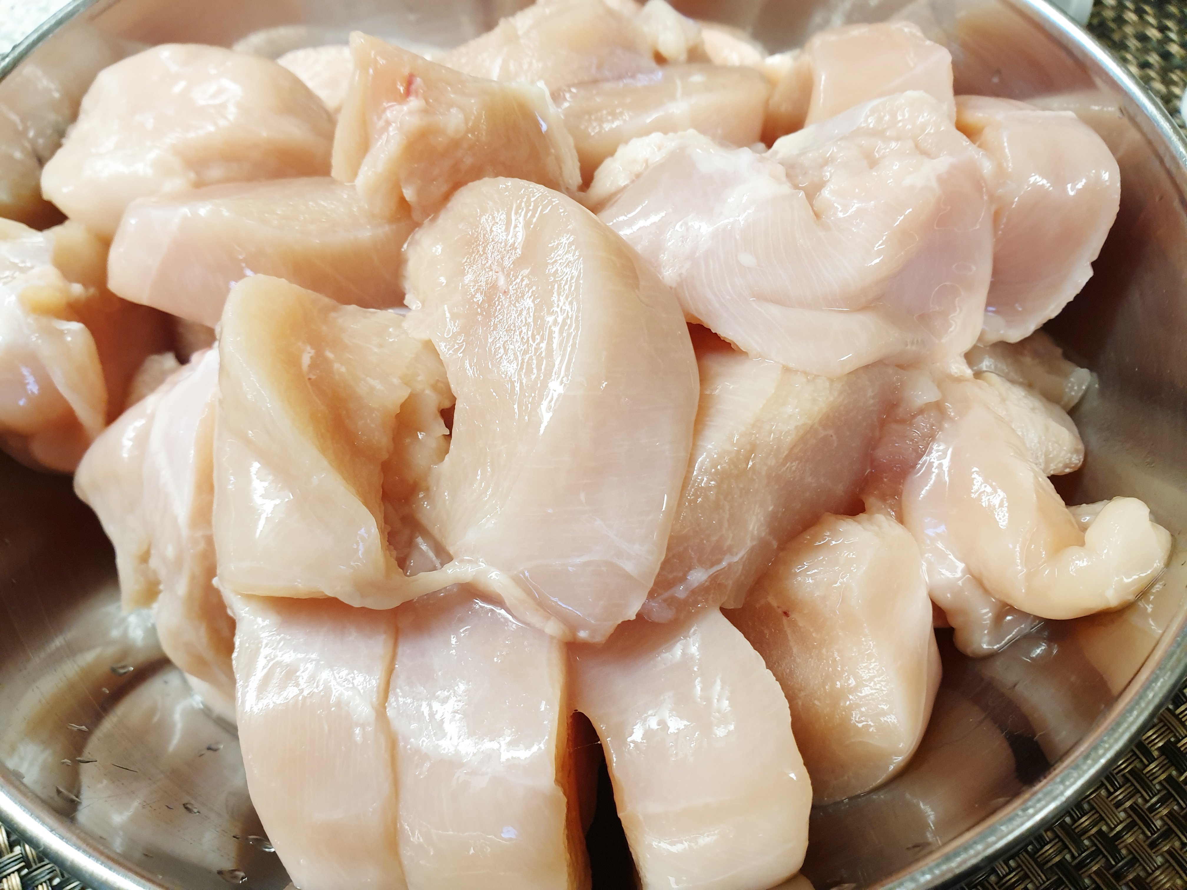 1. 먼저 순살 닭고기 (원하는 부위 1.2kg)를 흐르는 물에 씻어 준비합니다. 식감을 부드럽게 하고 싶다면 우유에 1시간 이상 재워두세요!