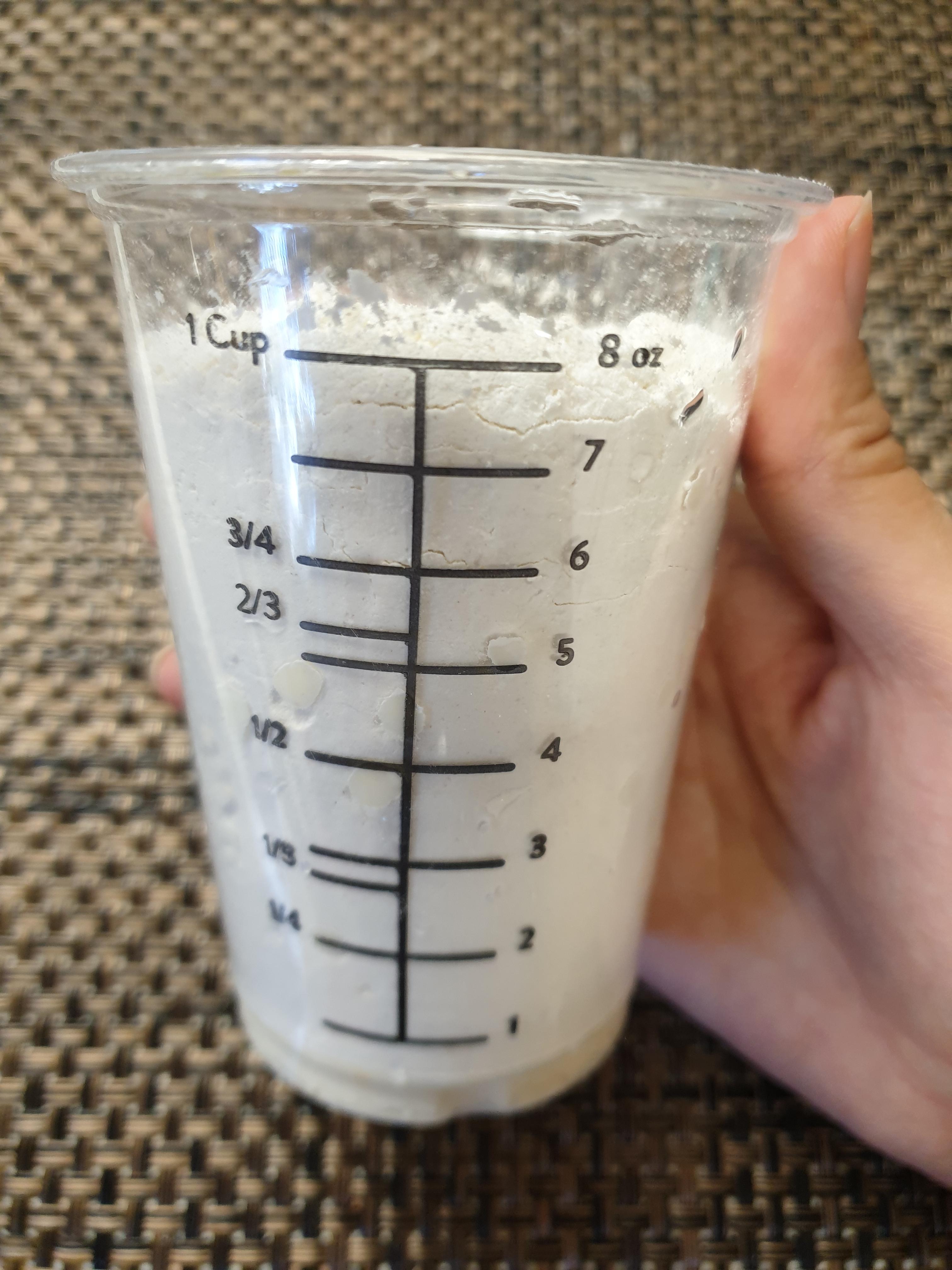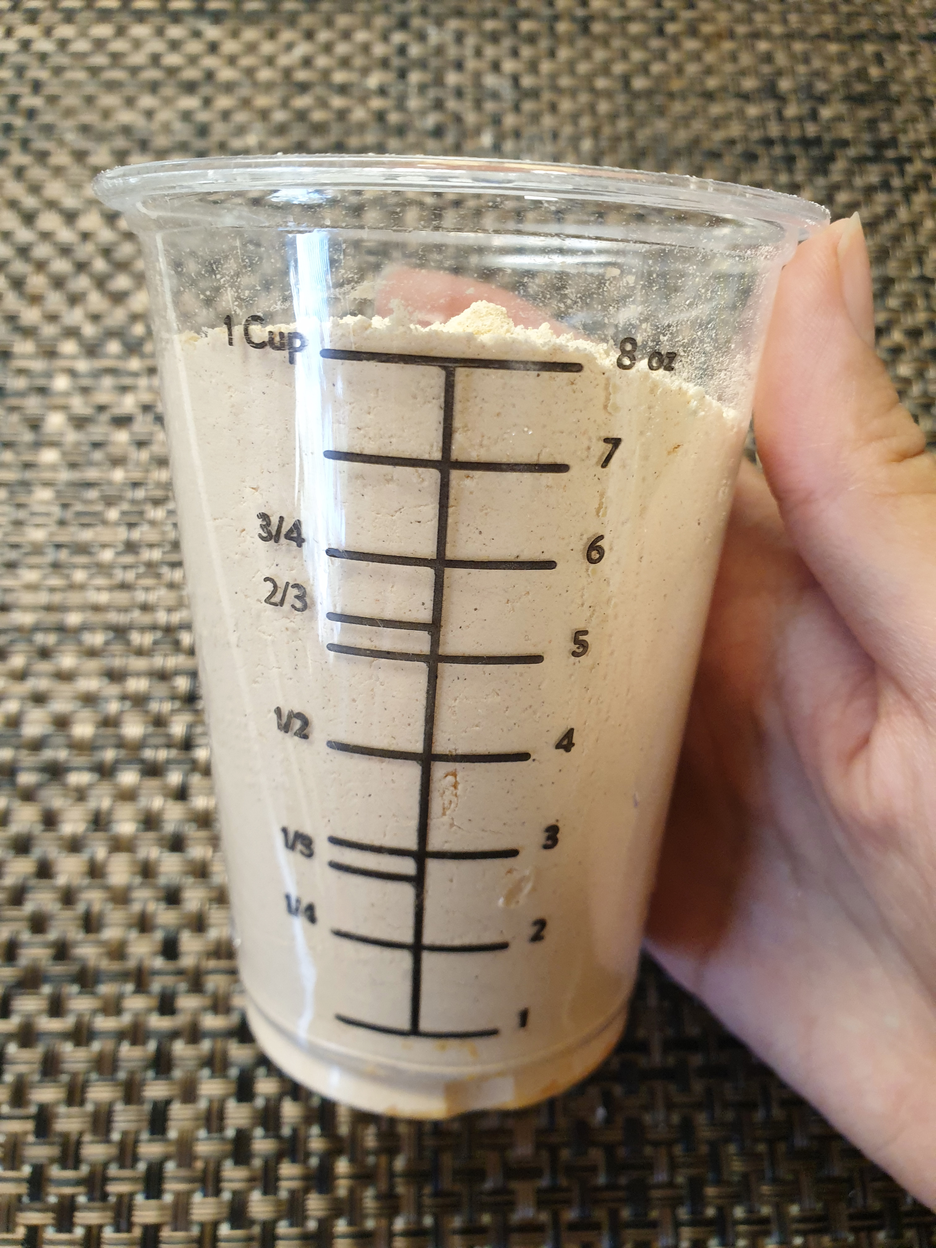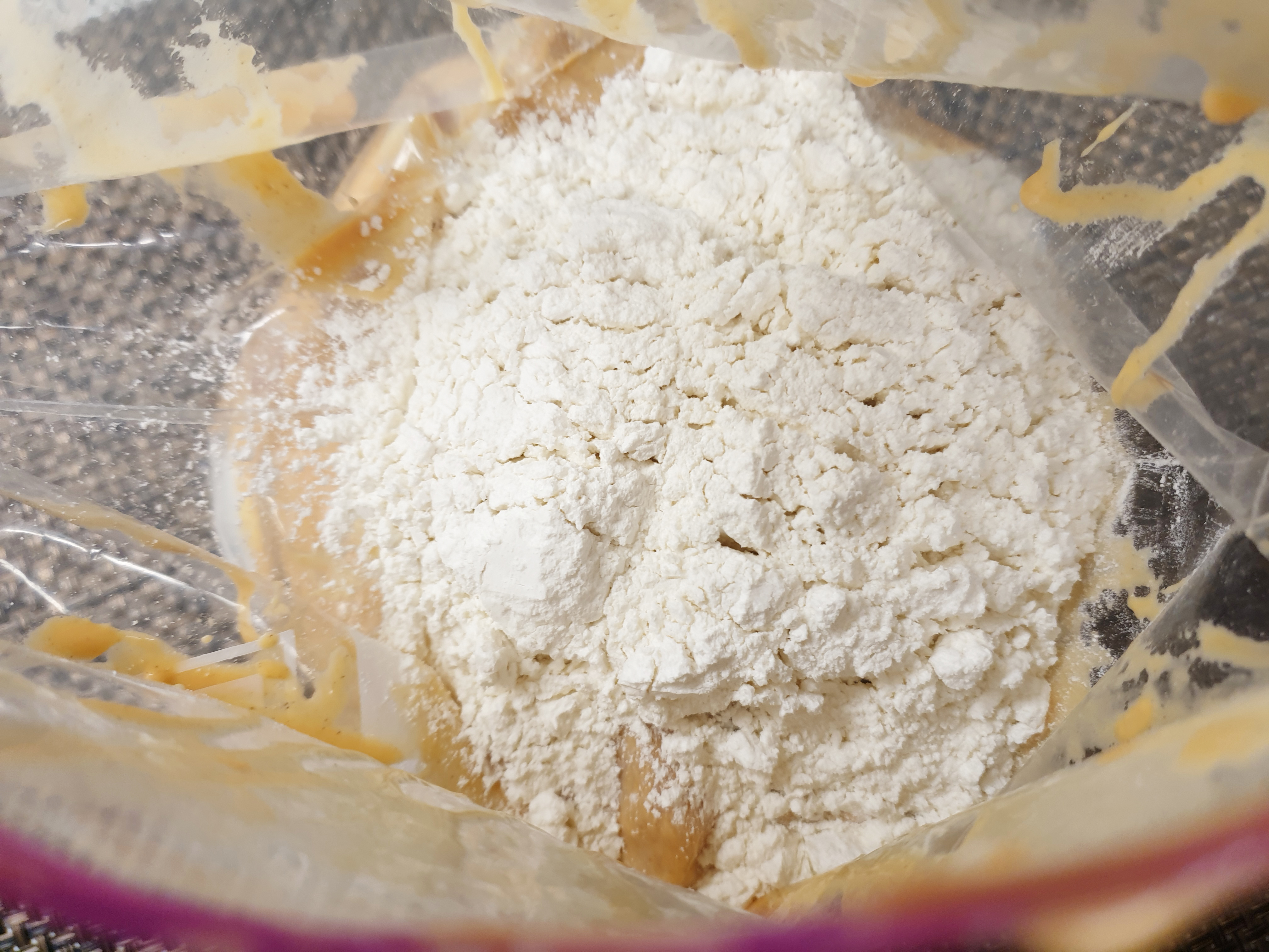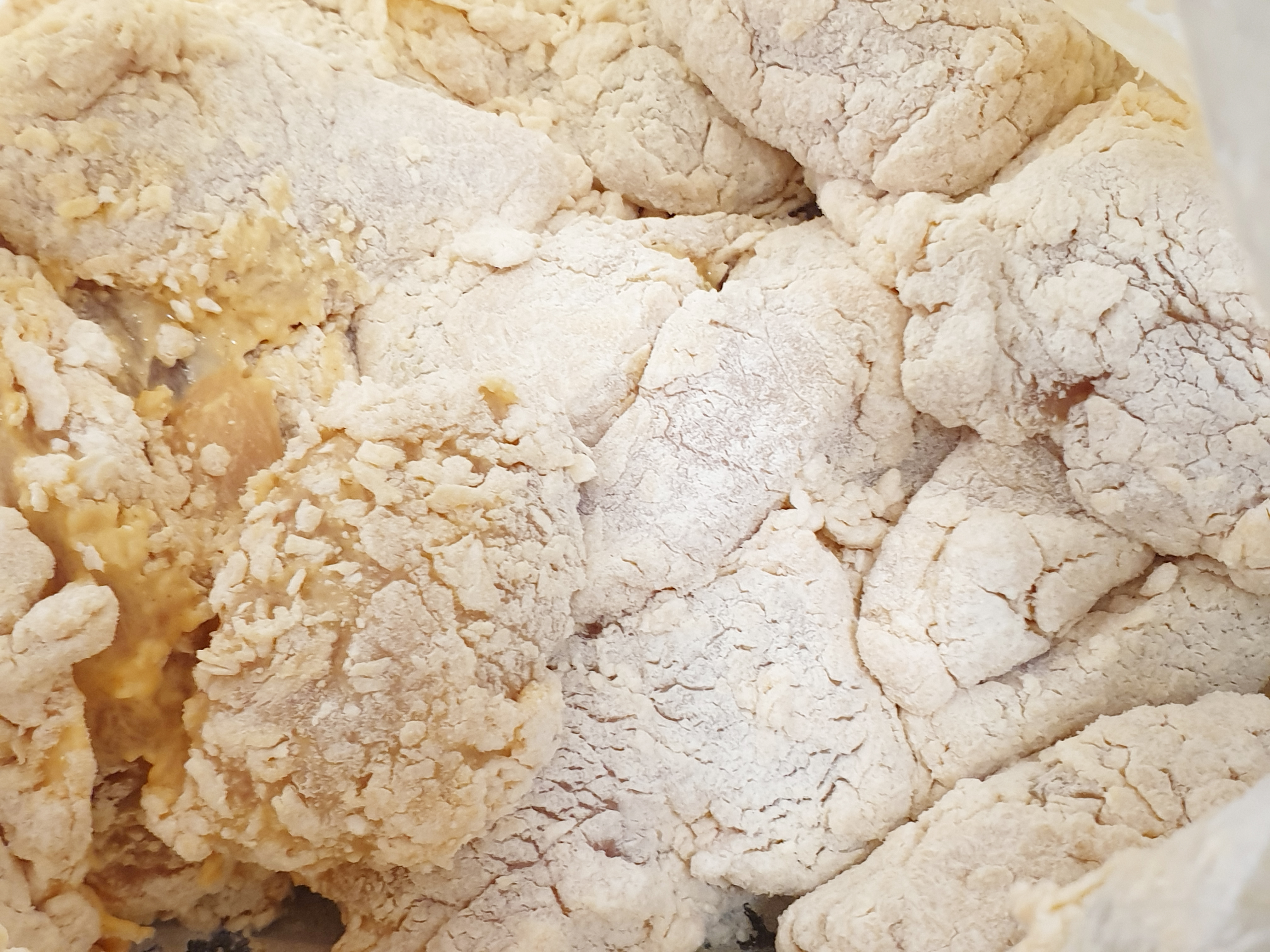 4. 그다음 일회용 봉투나 큰 통에 튀김가루 1컵(230ml)을 넣고 닭고기 반죽을 넣은 뒤 다시 1컵을 부어 주고 가루가 잘 묻을 수 있도록 열심히 흔들어 줍니다. (일반 튀김가루를 사용한다면 소금과 후추를 넣어 간을 더해주세요!)