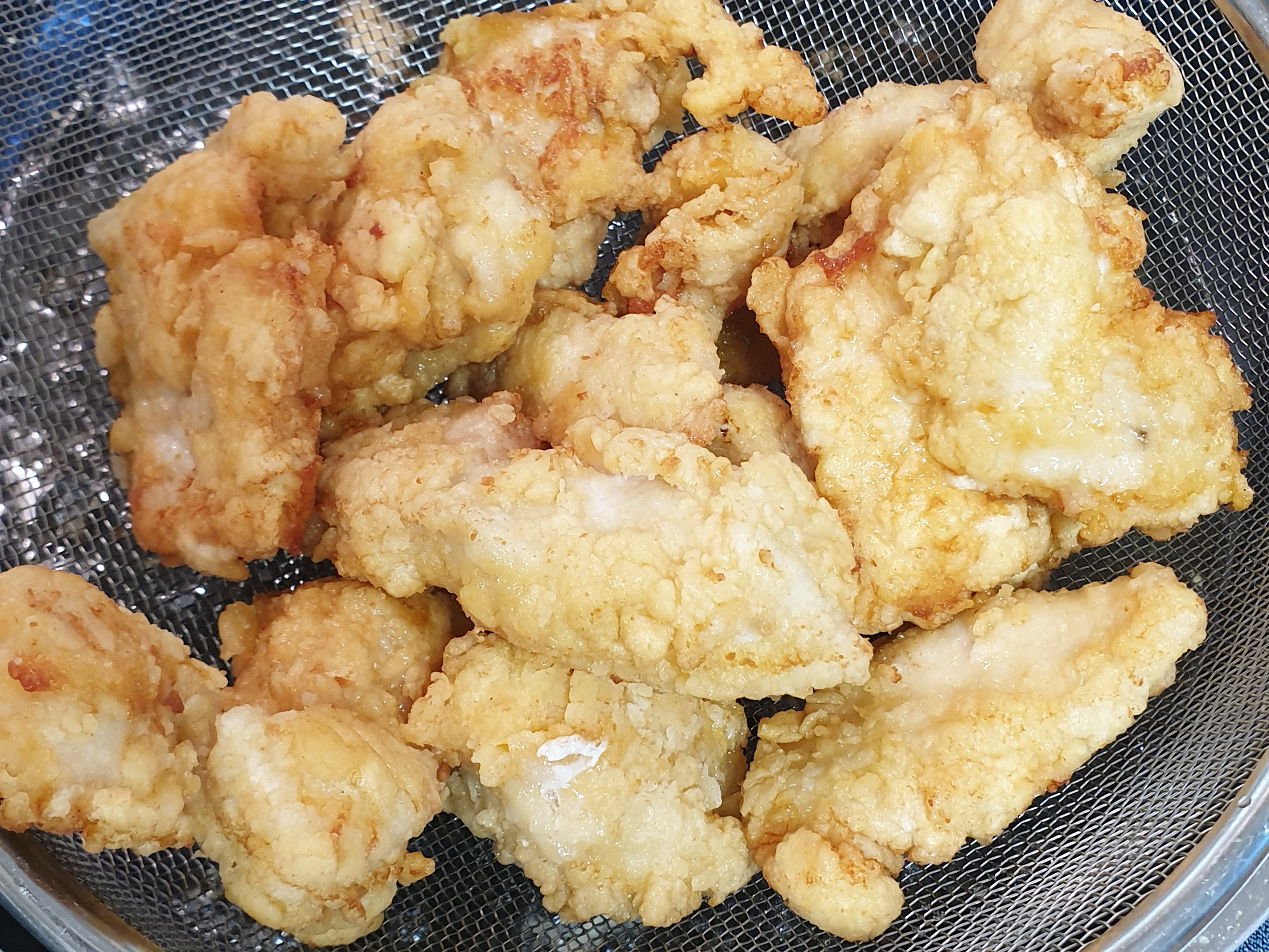 7. 10분 뒤 건져내어 기름기를 빼주고 식힌 다음 더 바삭한 식감을 위해 다시 5분간 튀겨줍니다.