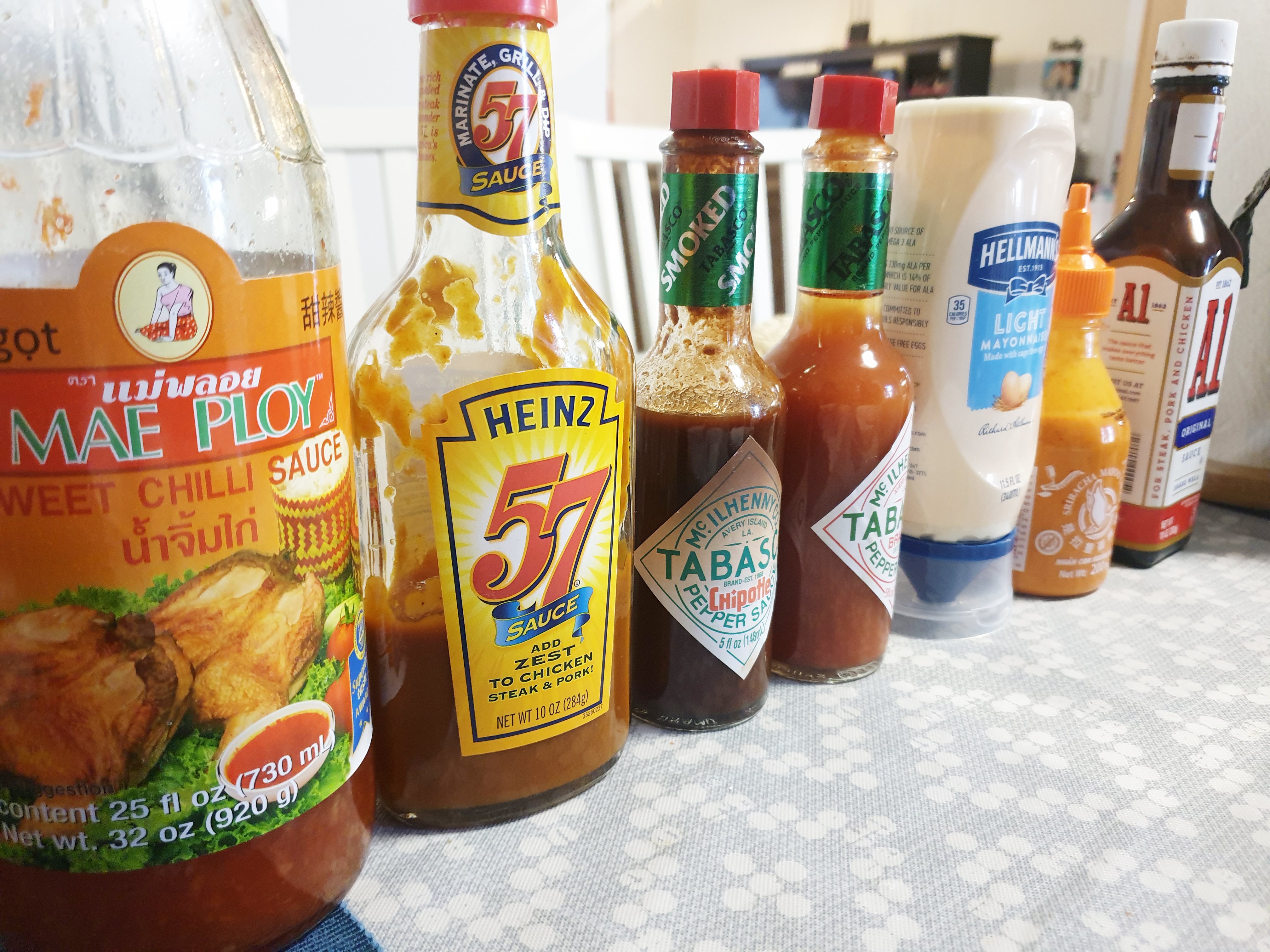 치킨 먹는다고 설레는 마음으로 집에 있는 소스를 다 꺼내온 우리 남편 ㅋㅋㅋ 전 개인적으로 후라이드 치킨엔 소금과 후추 약간 섞어 찍어 먹는 게 제일 맛있는 것 같아요 ㅎㅎ