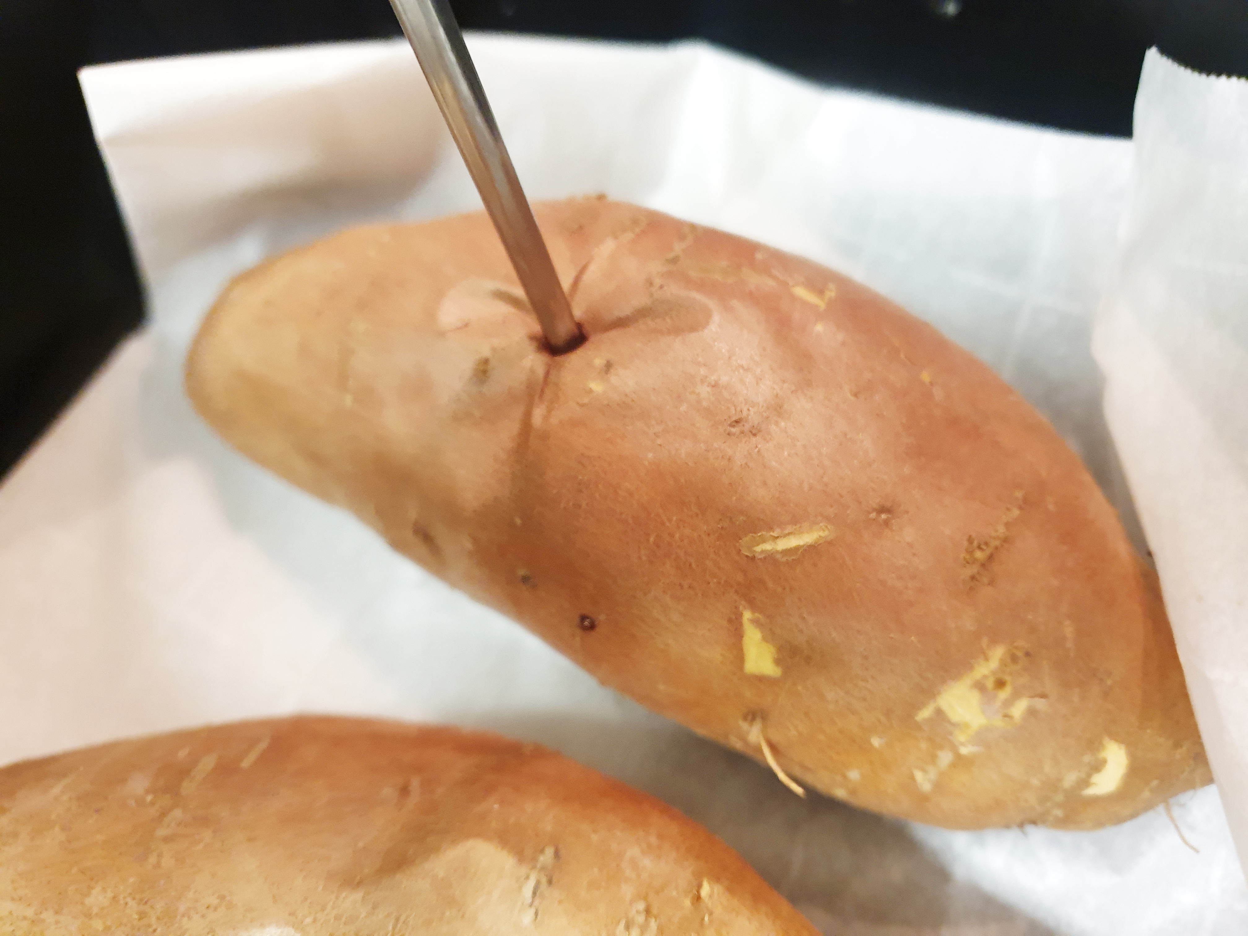 구워진 고구마를 익었는지 확인하는 방법은 젓가락을 이용해서 고구마를 꾹~ 찔러보세요 잘 들어간다면 익은 거니 맛있게 드시면 됩니다. ^^