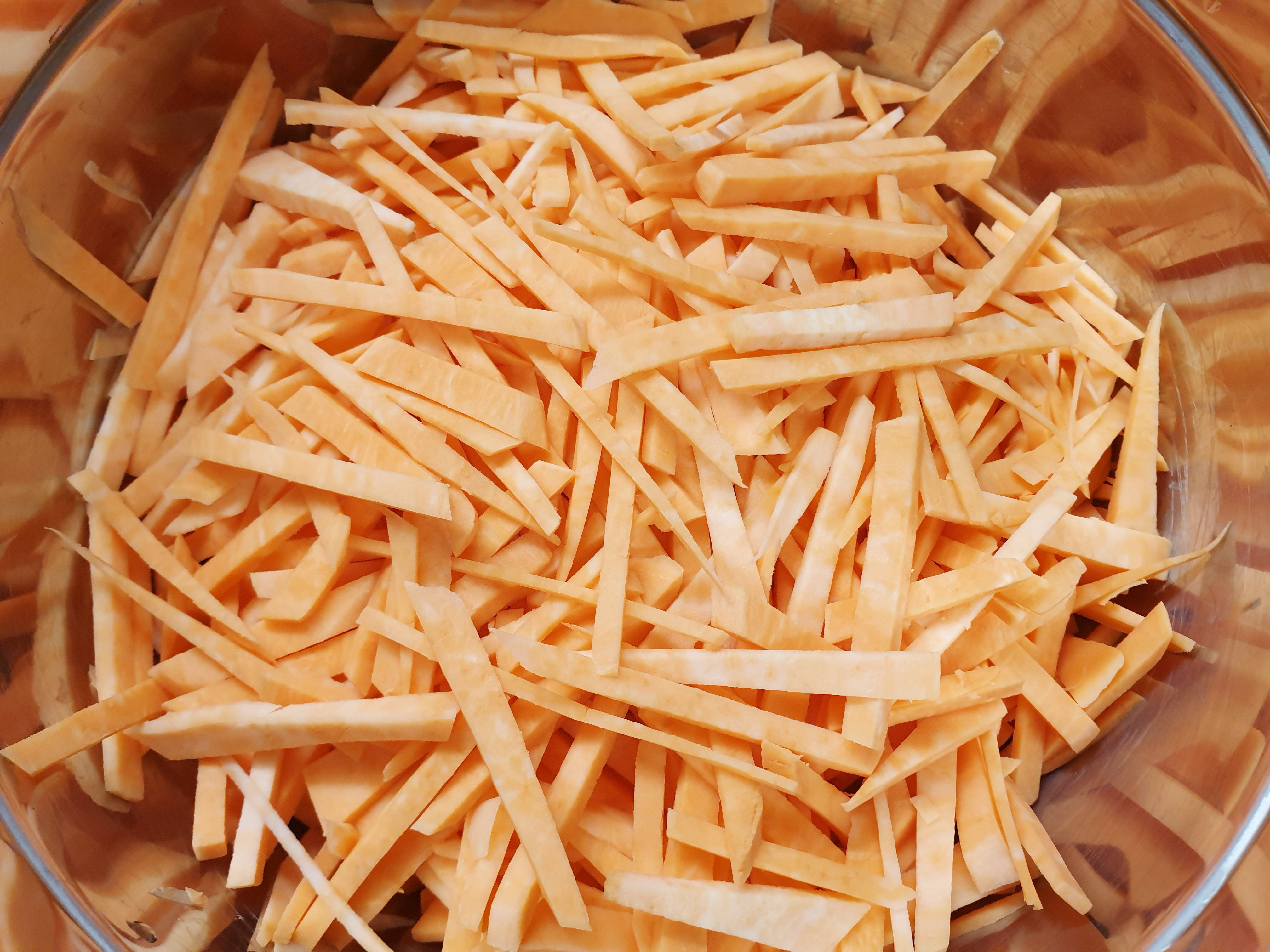 2. 그다음 채칼이나 칼을 이용해 고구마 채를 썰어줍니다. (칼로 채를 썰때 고구마가 딱딱해서 다칠 수 있으니 꼭 손 조심하세요!)