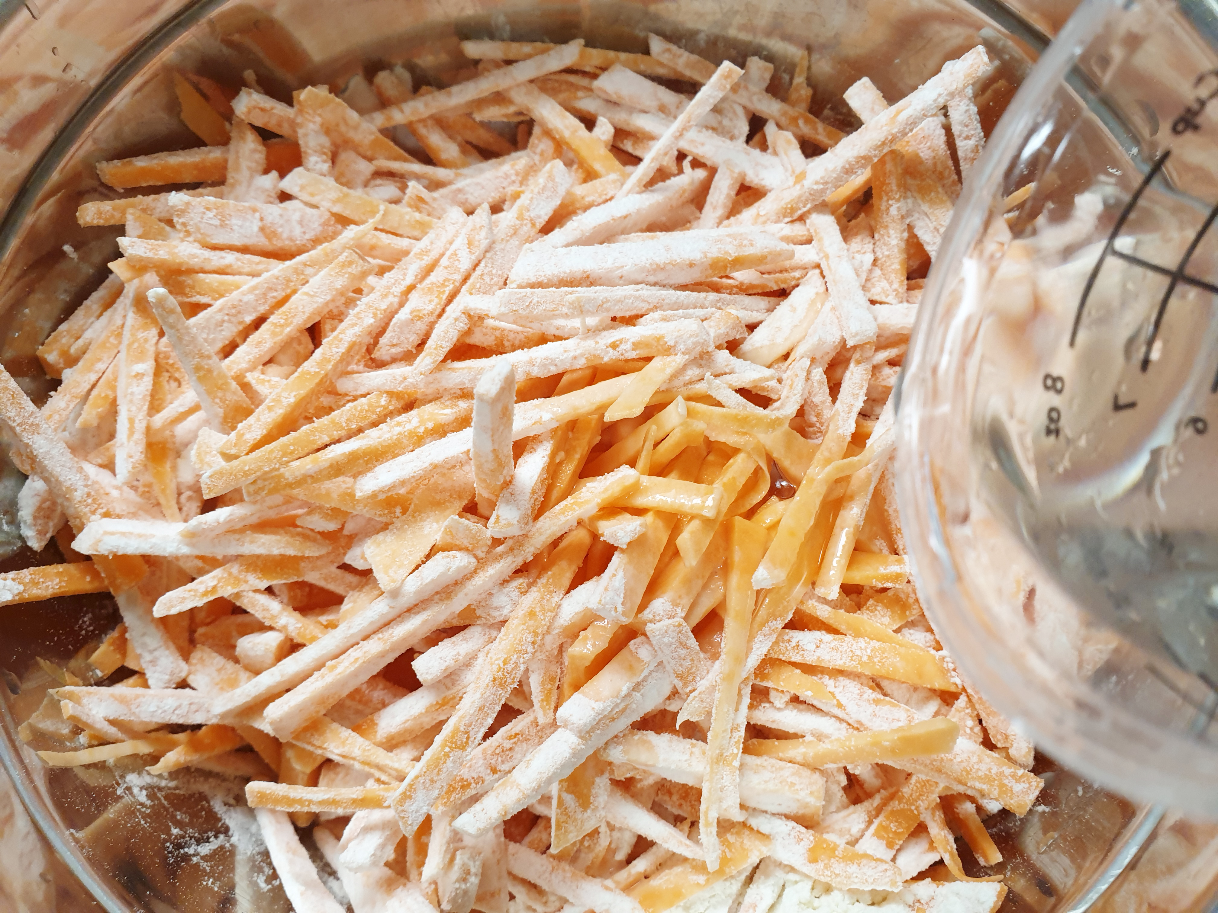 3. 믹싱볼에 채 썬 고구마와 물 110ml , 부침가루 5큰술을 넣고 섞어줍니다. 독일 고구마는 물러서 바삭한 식감을 위해 전분 1큰술도 넣어줬어요!
