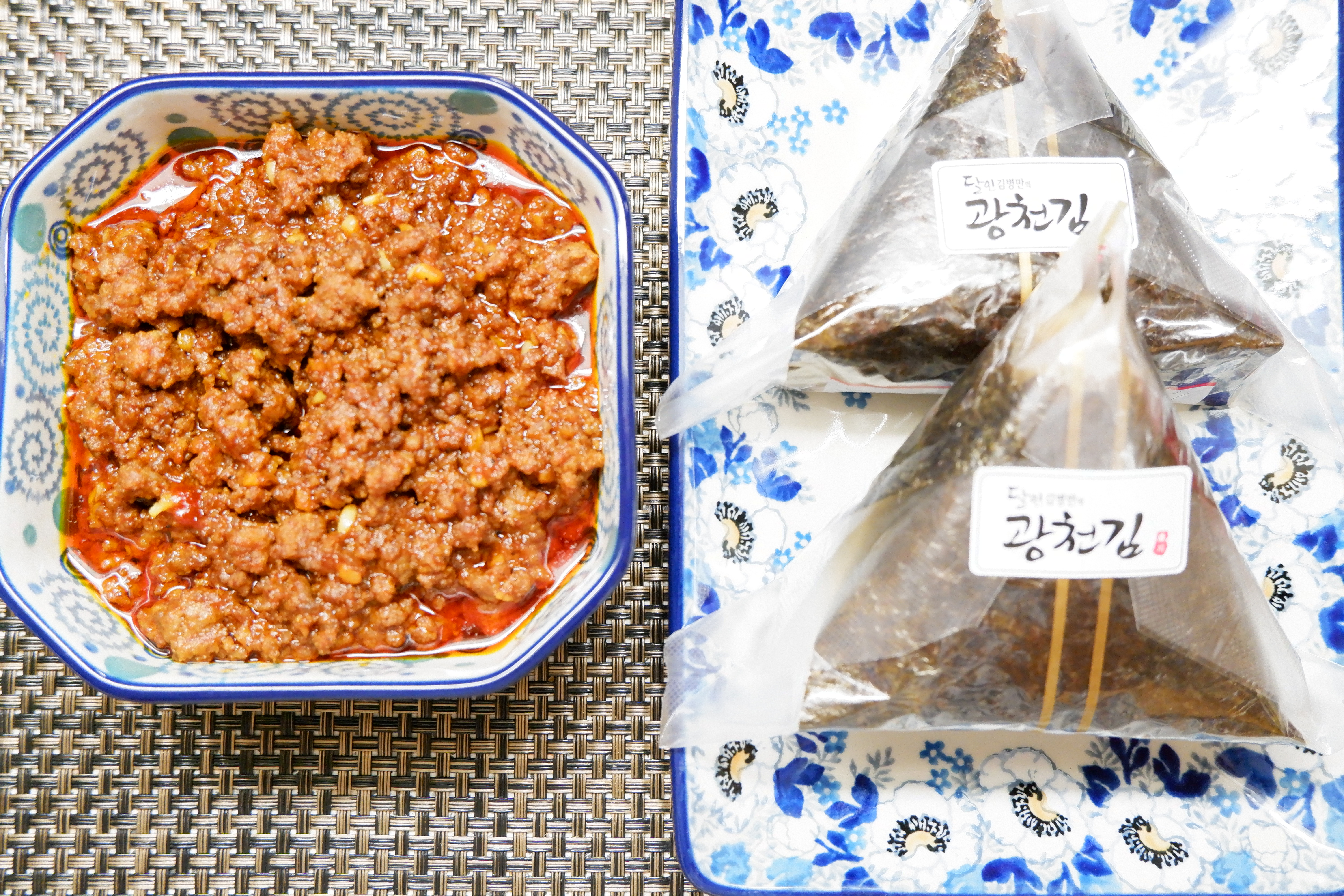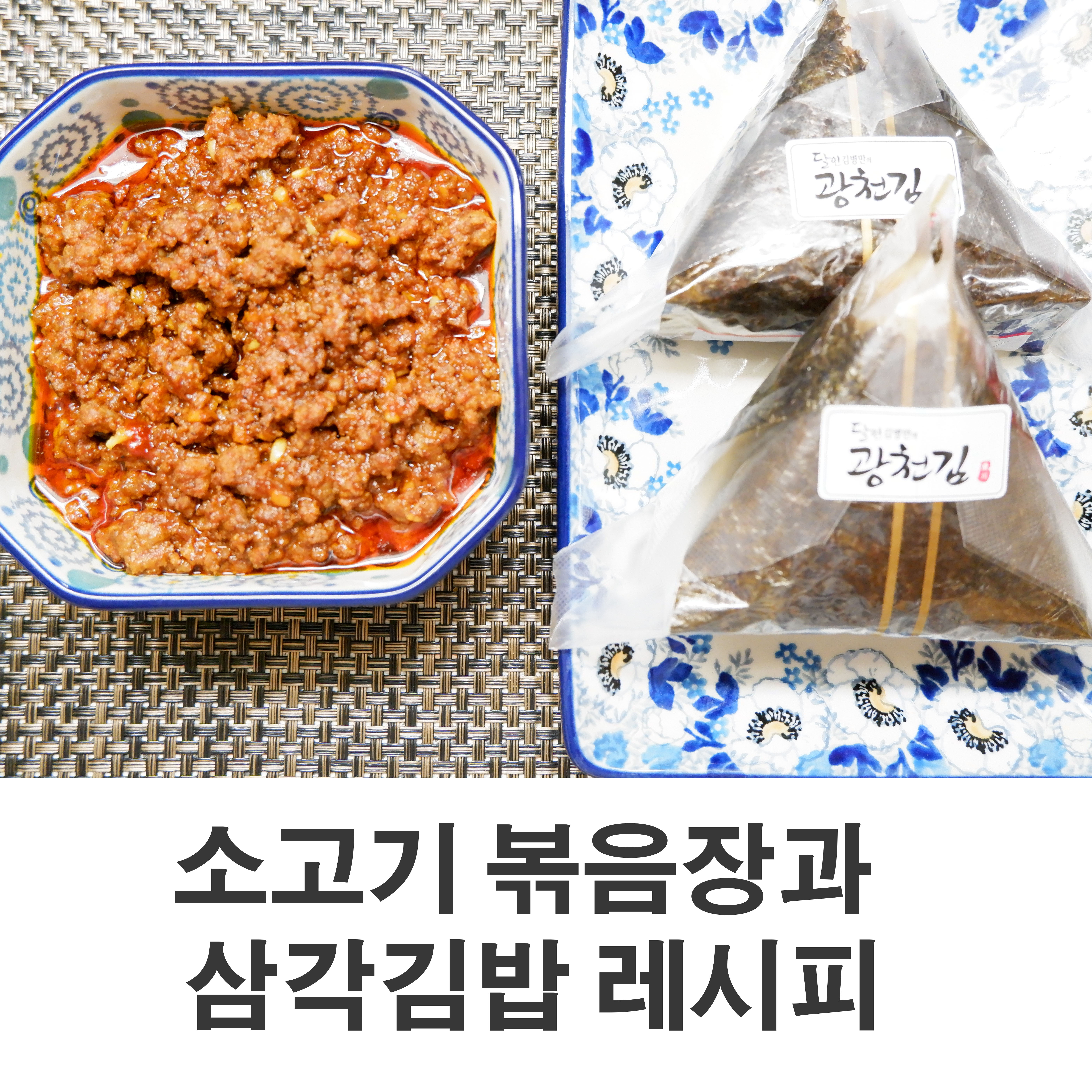 이렇게 소고기 볶음장과 삼각김밥이 완성됐어요~ 조리시간도 짧으면서 간단한 재료만으로 만들 수 있는 소고기 볶음장과 맛도 좋고 먹기 편한 삼각김밥!