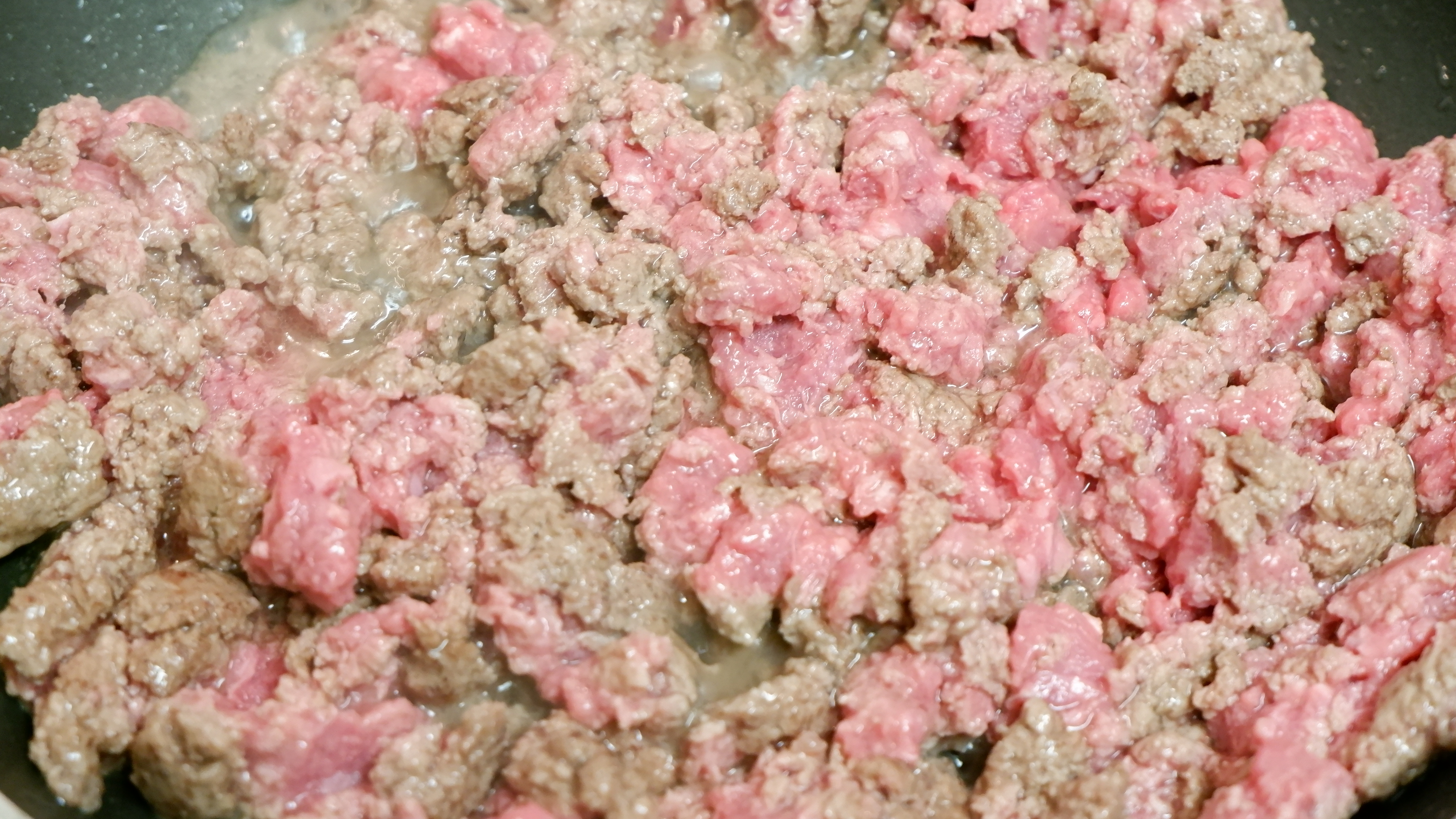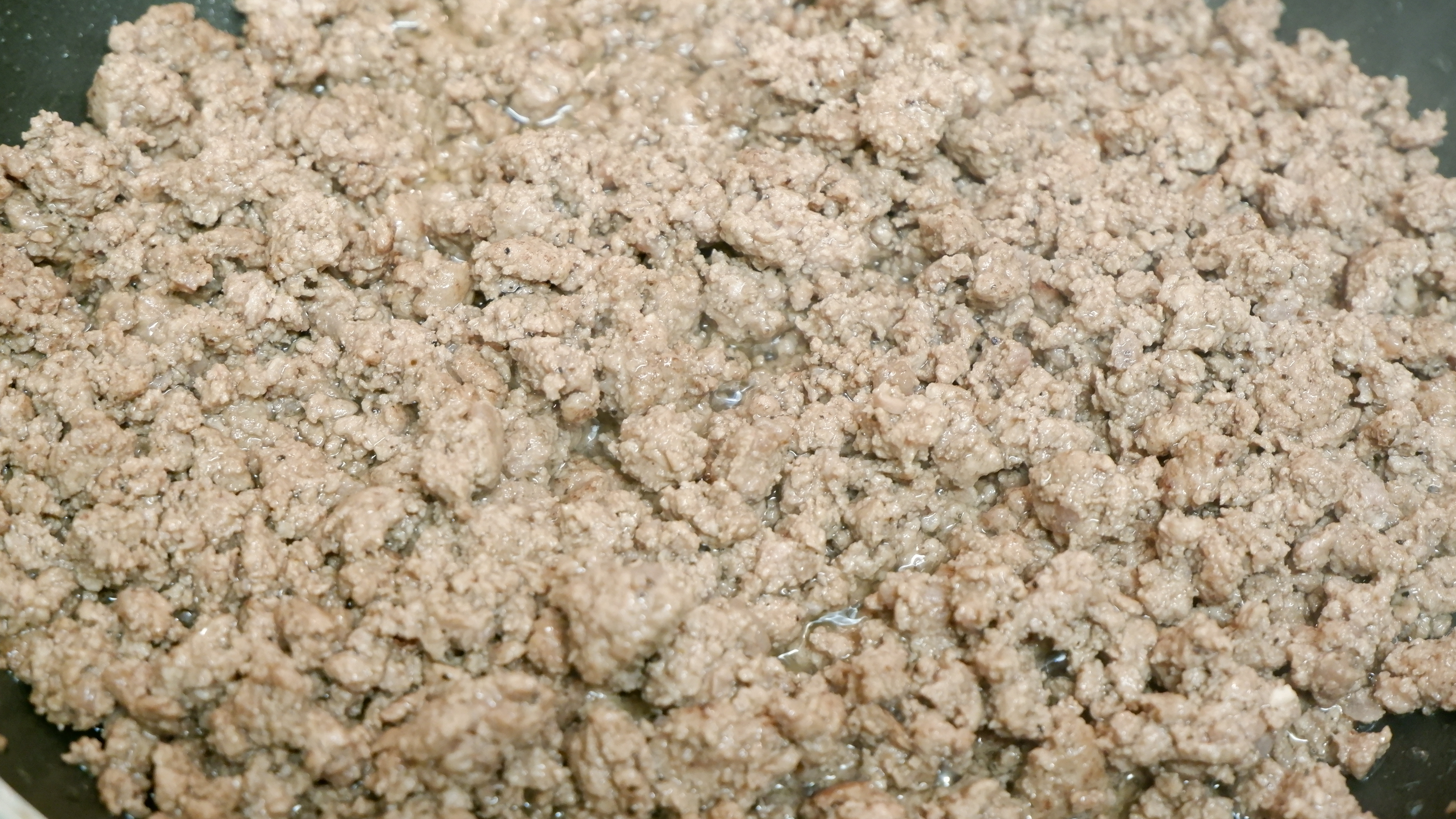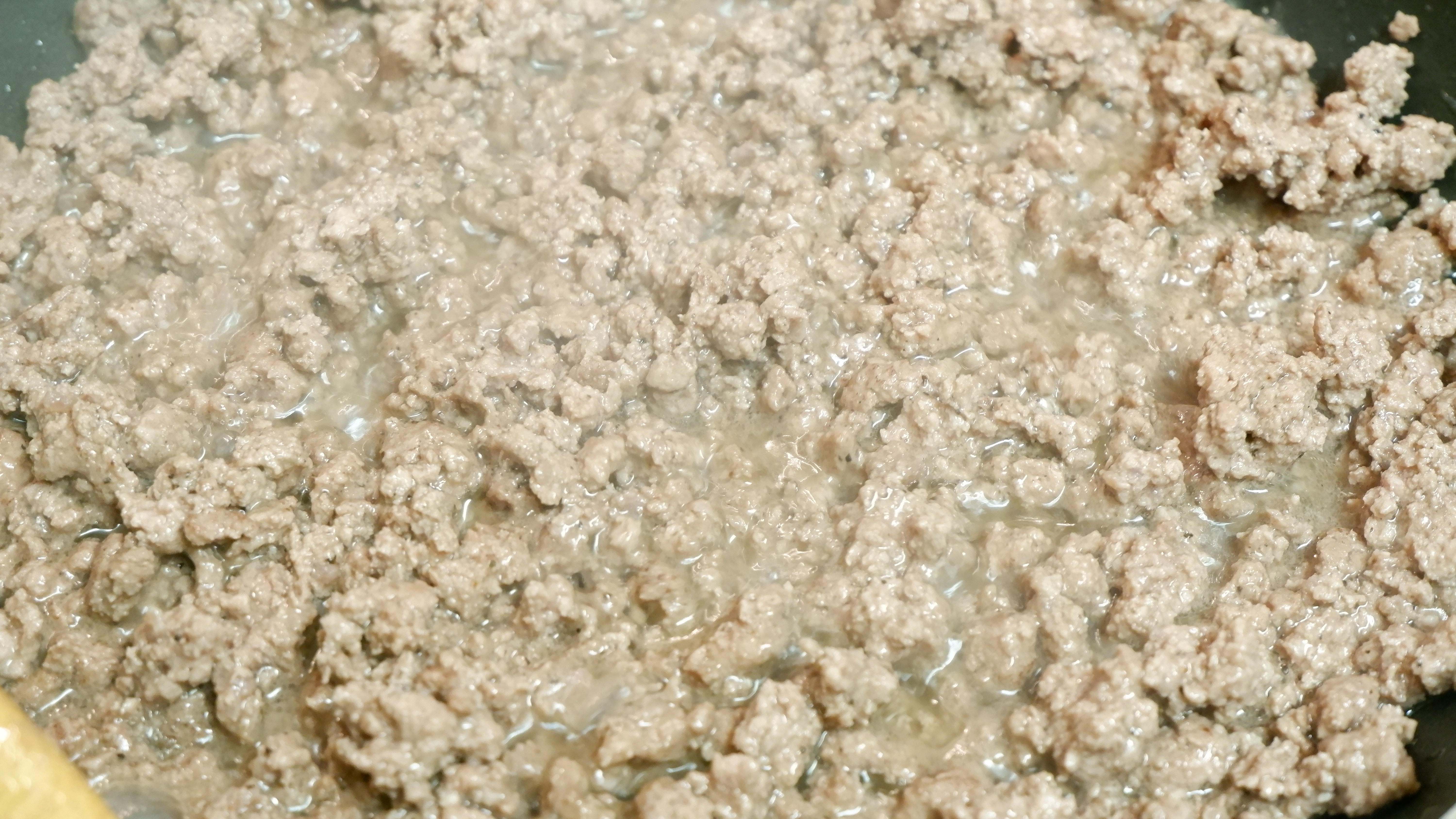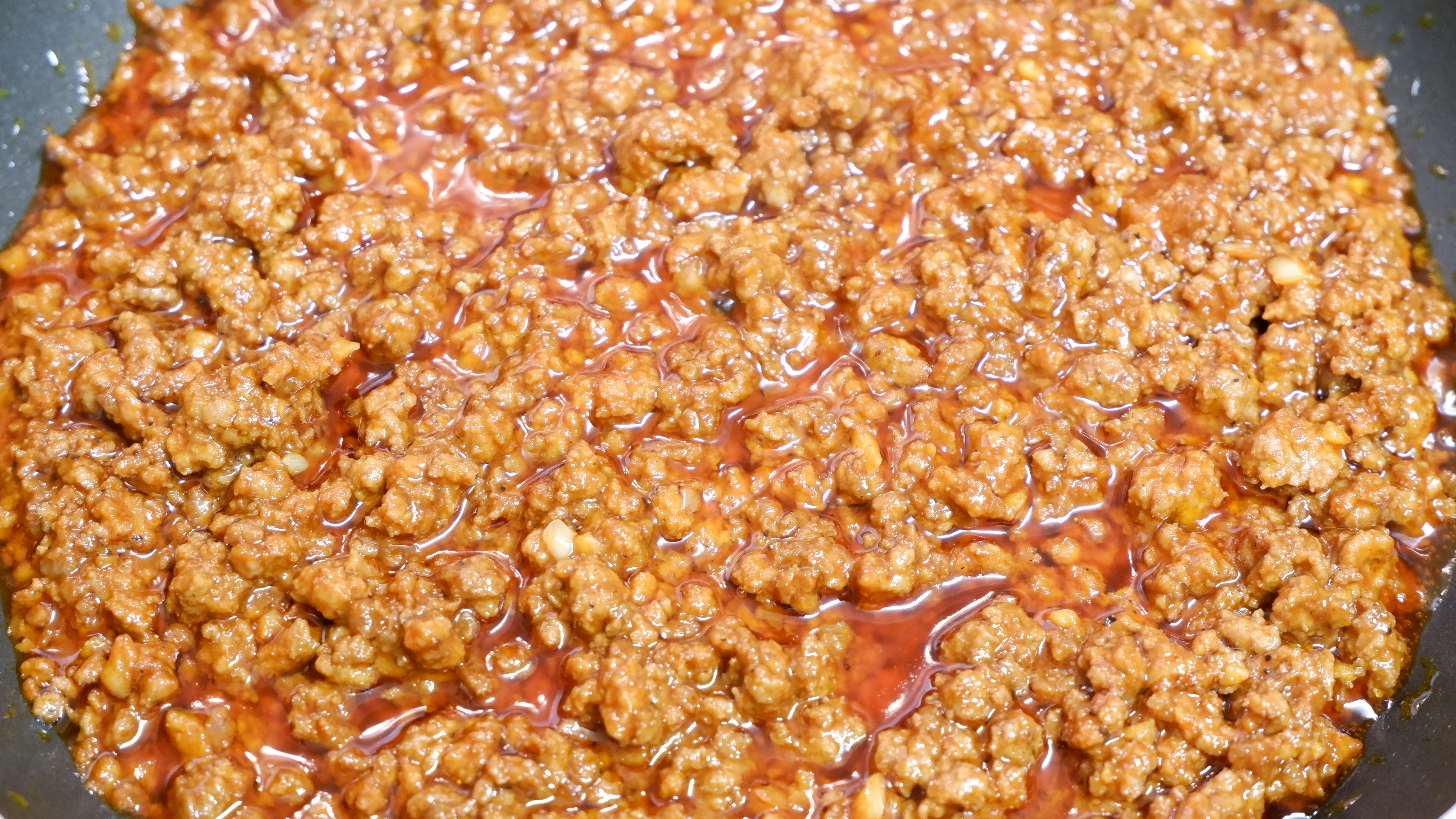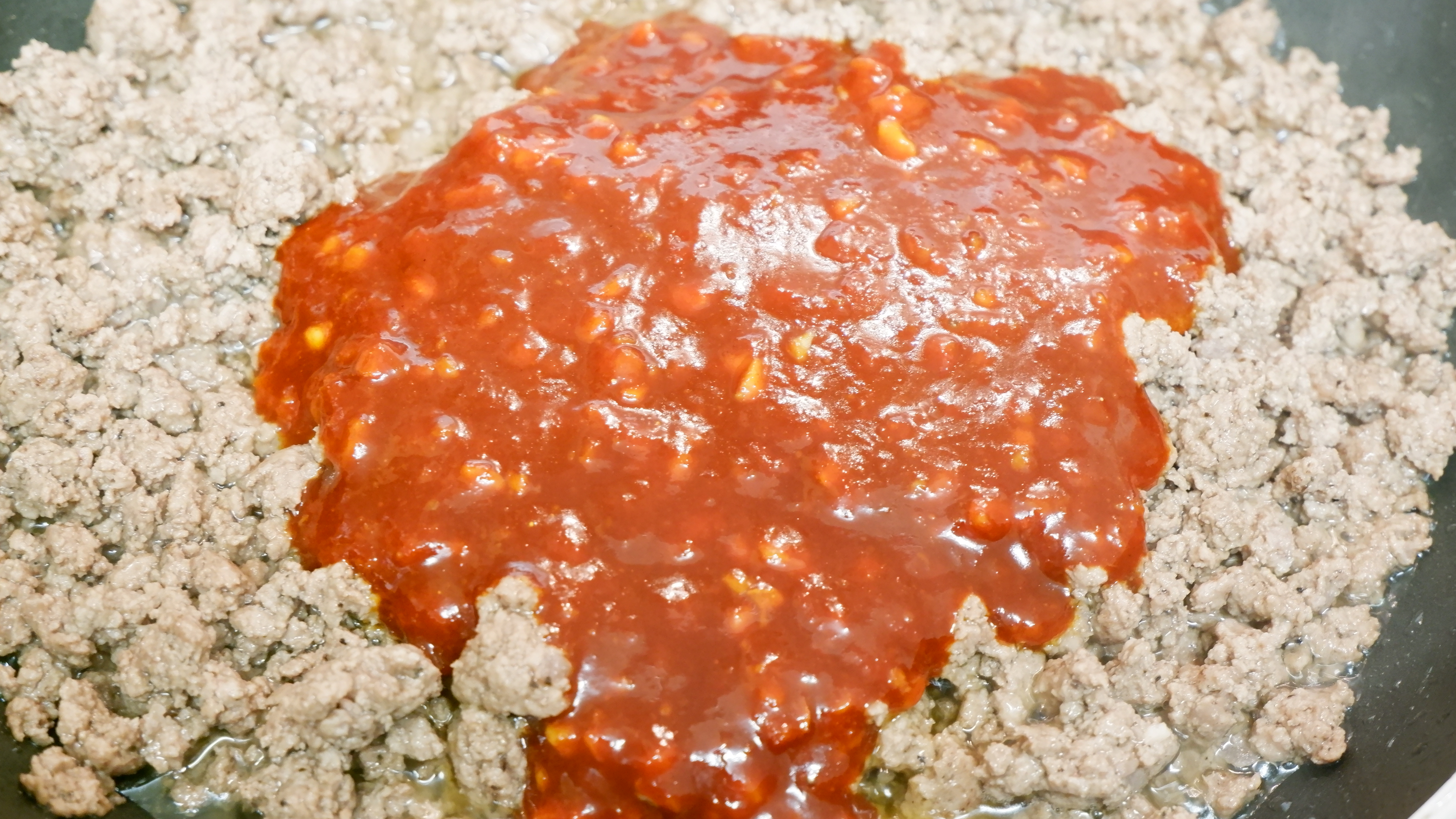 2. 양념장이 준비 됐으면 먼저 프라이팬에 식용유(3큰술 정도)를 두르고 불은 센불에 둔 뒤 기름을 달궈주세요. 기름이 달궈지면 다진 소고기 450g을 넣어주세요!