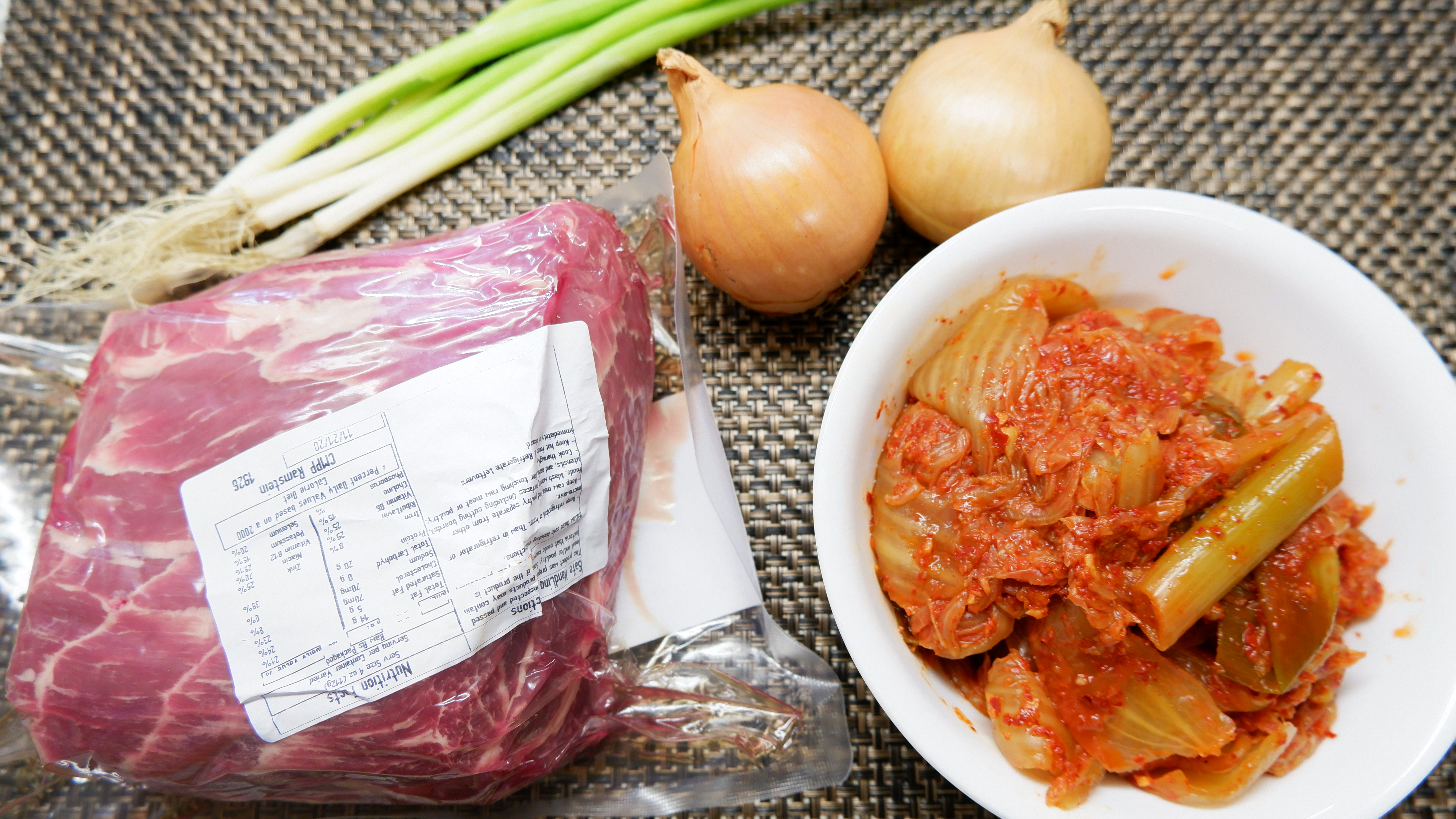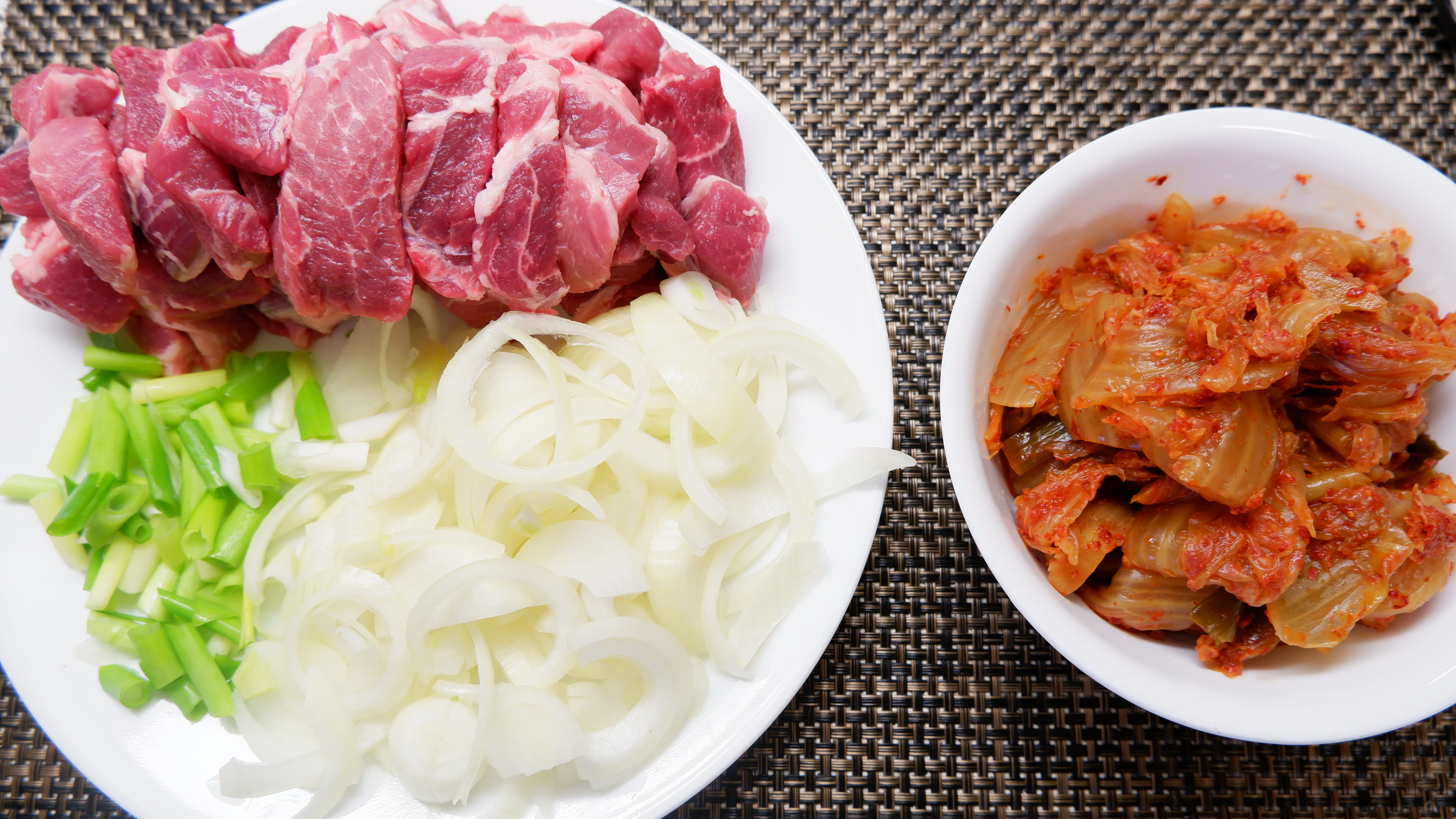 필요한 재료 : (3인분 기준): 돼지고기 600g , 김치 500g , 대파 1대 , 양파 1개 (큰 사이즈) , 식용유