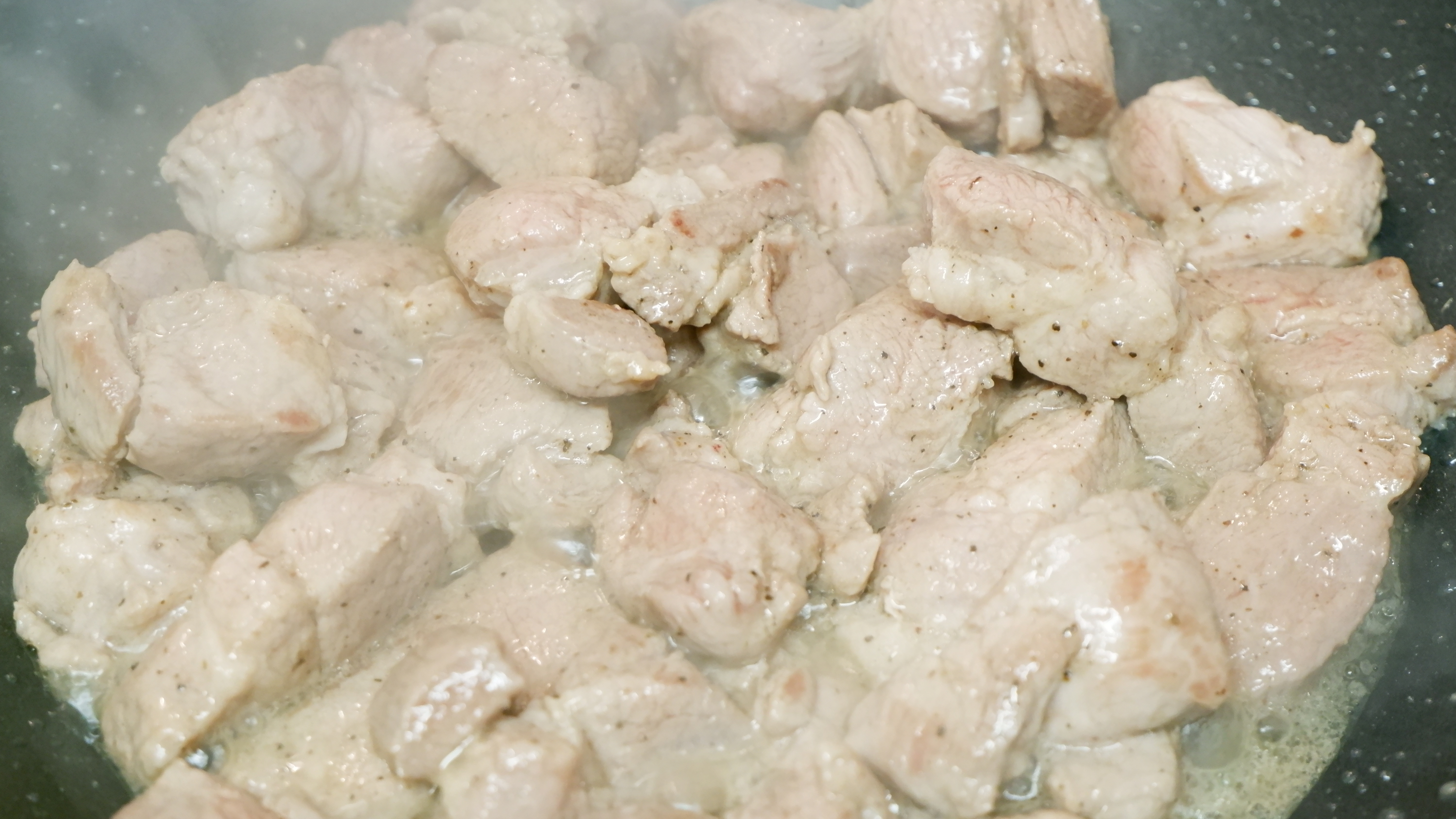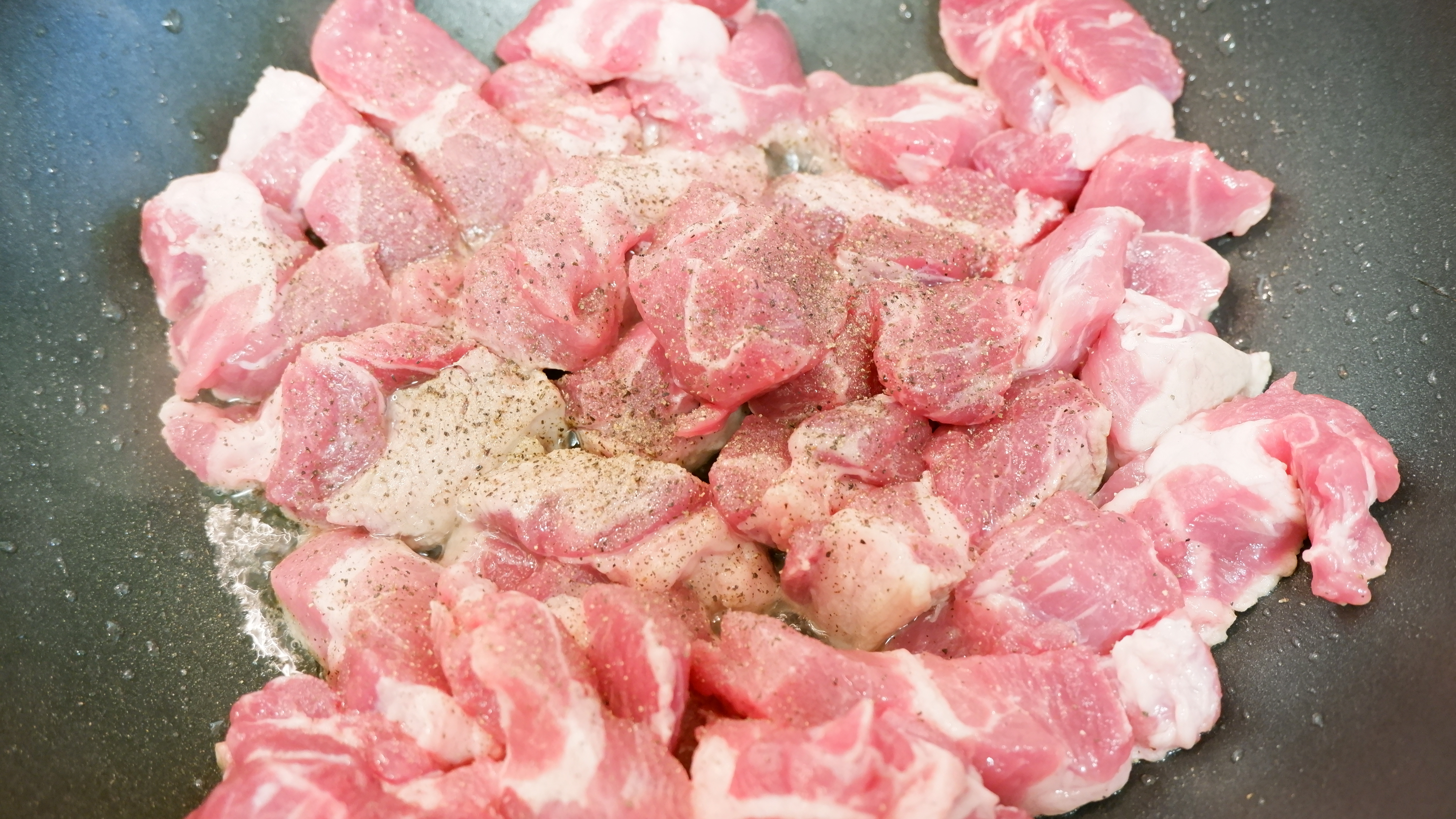 6. 그다음 썰어둔 돼지고기 (600g)를 넣고 후춧가루를 뿌려 준 뒤 골고루 익혀줍니다.