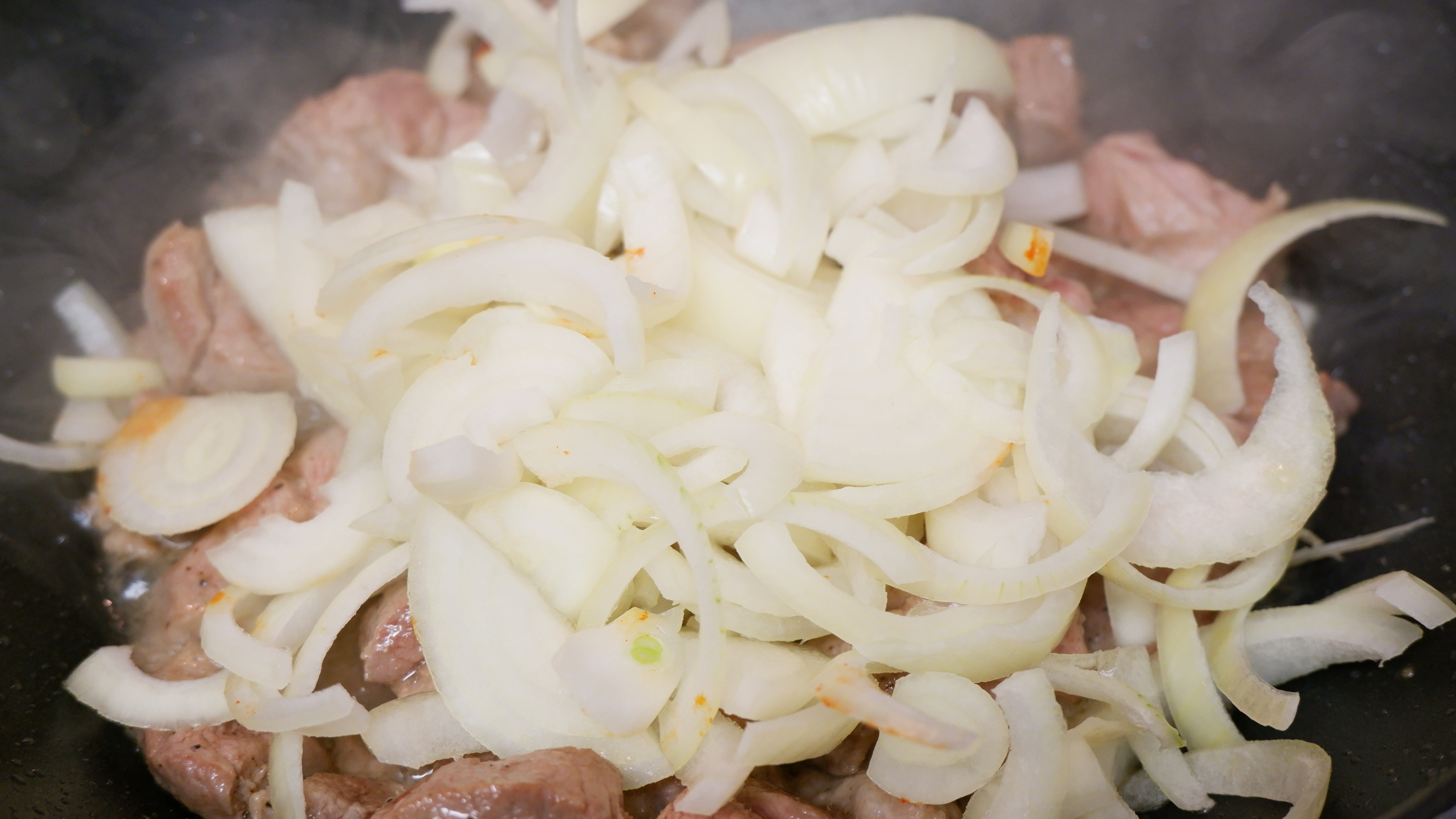 7. 돼지고기가 거의 익어 갈 때쯤 채를썬 양파를 넣어 양파가 익을 때까지 볶아줍니다.