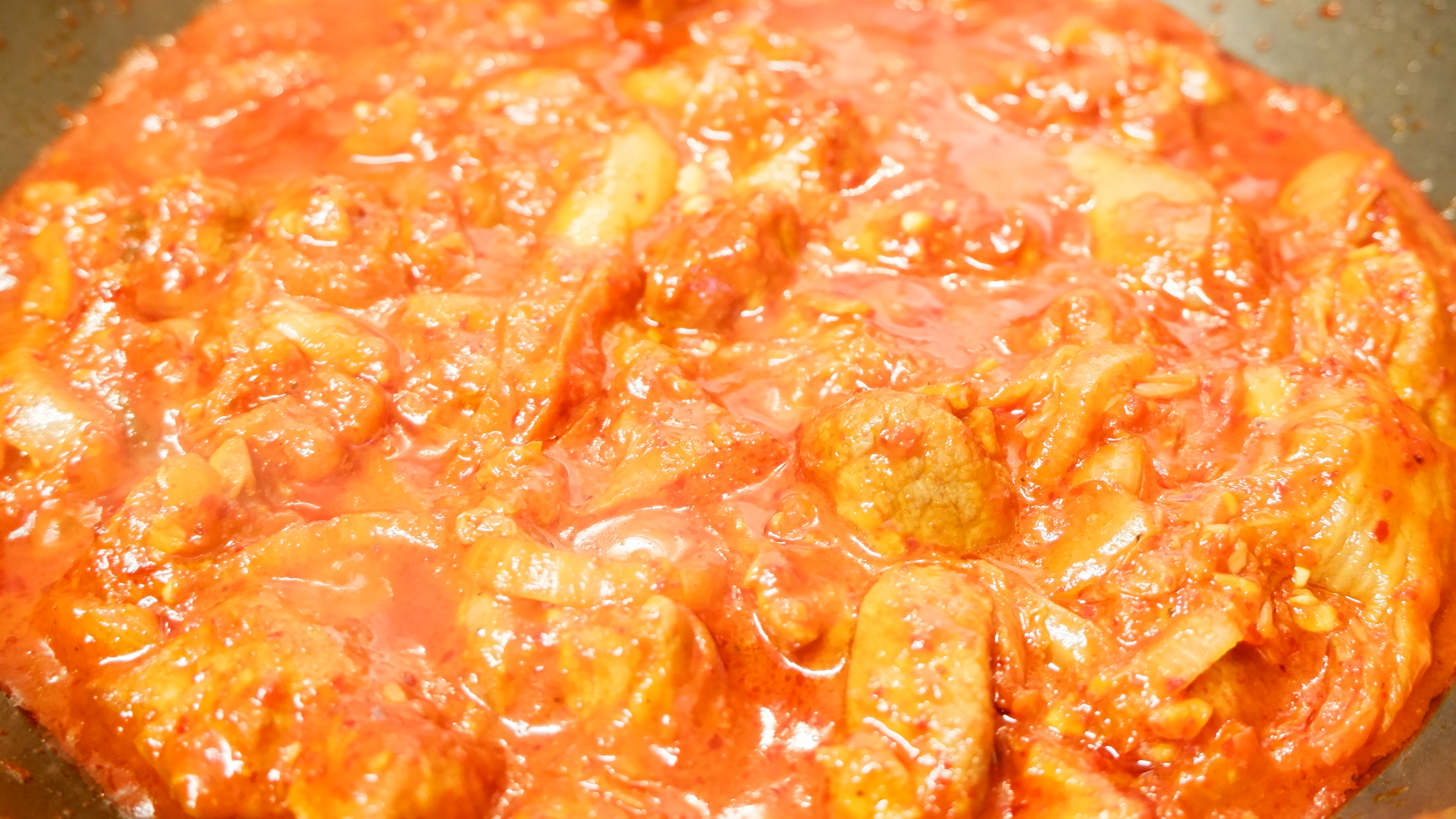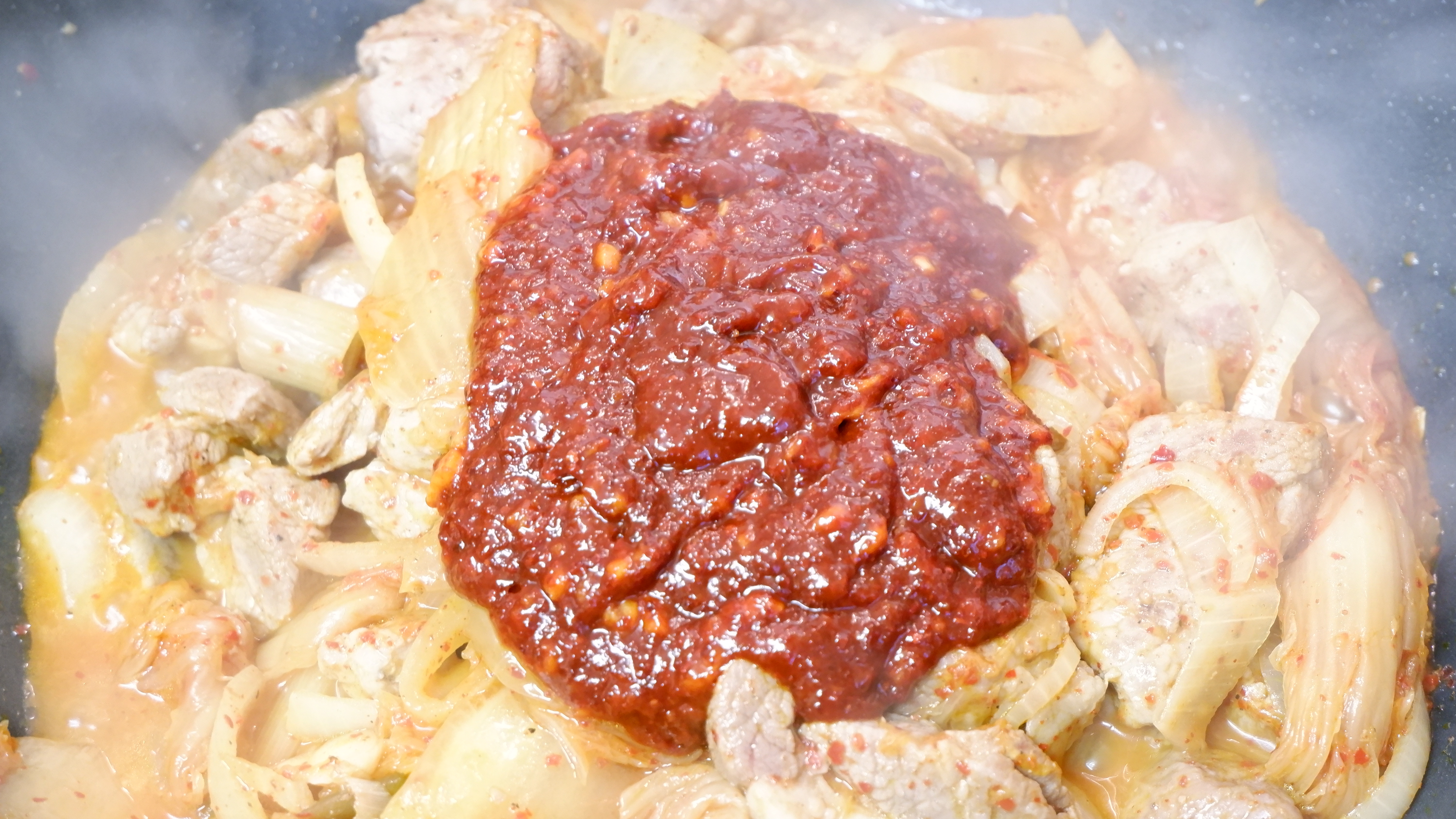 8. 그다음김치를 넣고 2분간 볶다가 양념장을 넣고 고기에 양념이 잘 배일 때까지 볶아주세요!